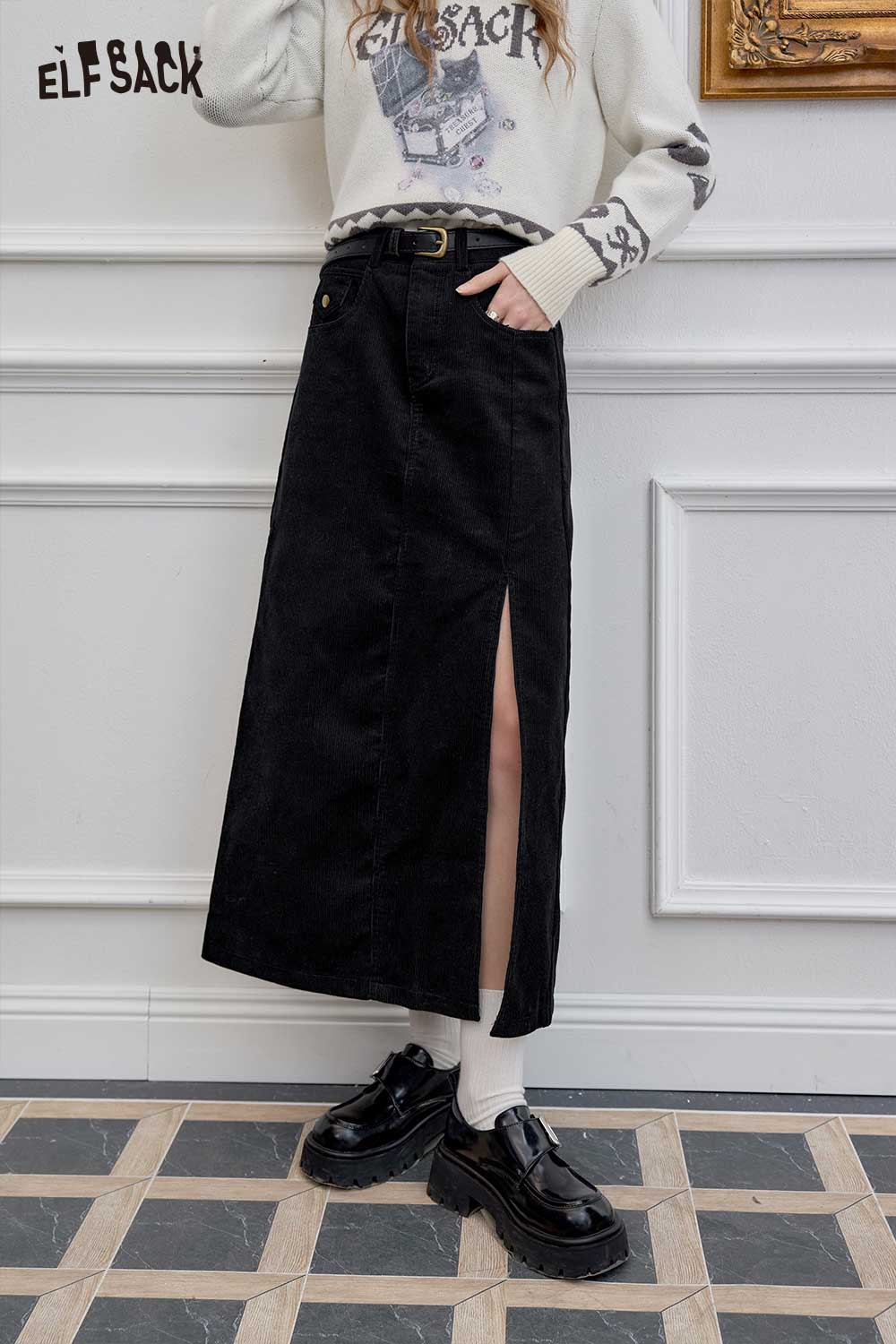 Light Design Corduroy Side Slit Versatile Mid Length Skirt