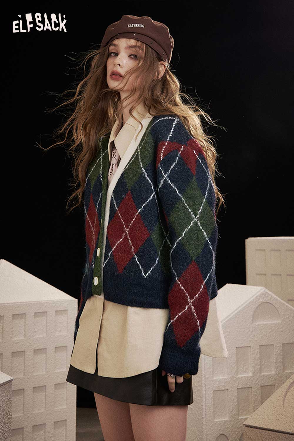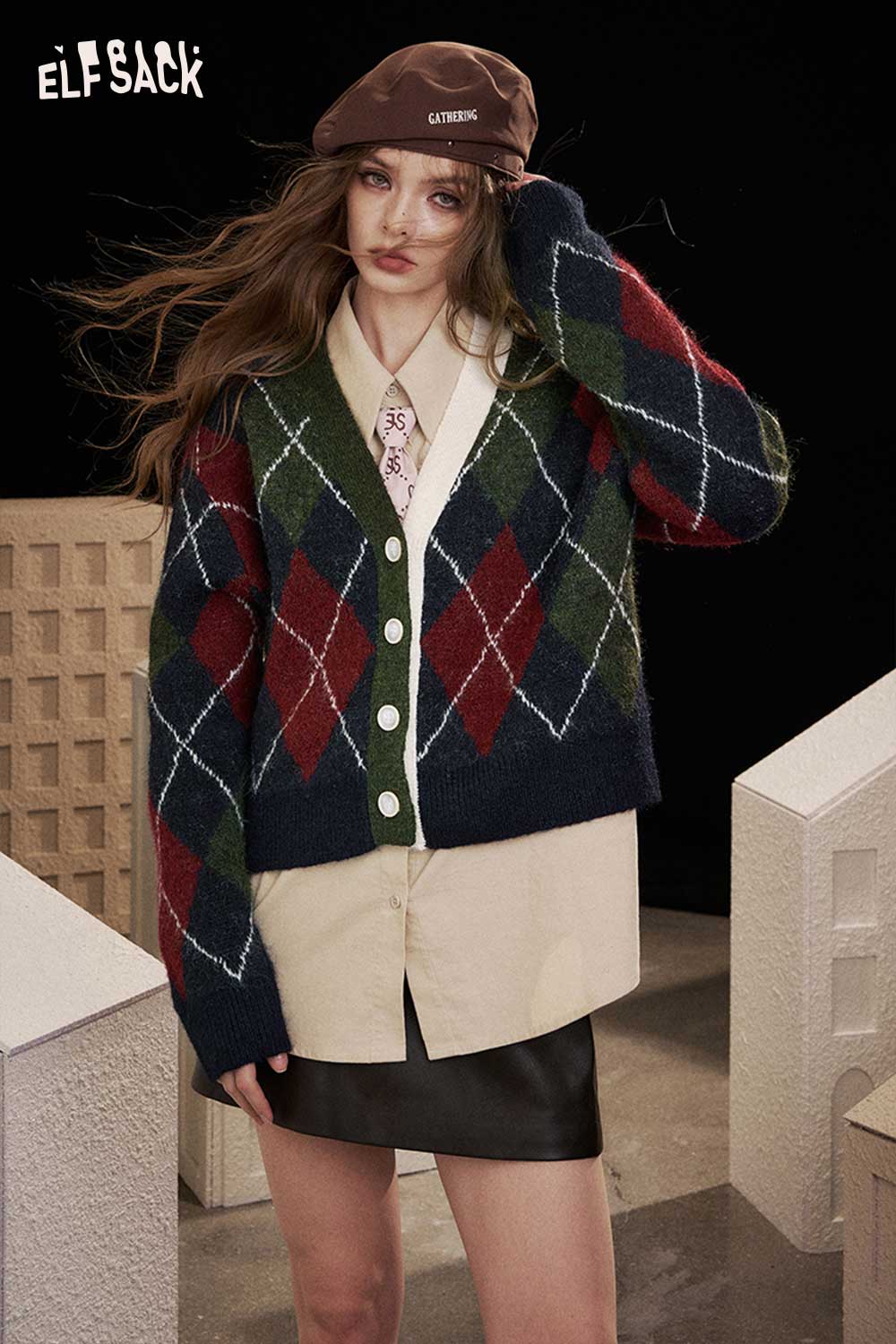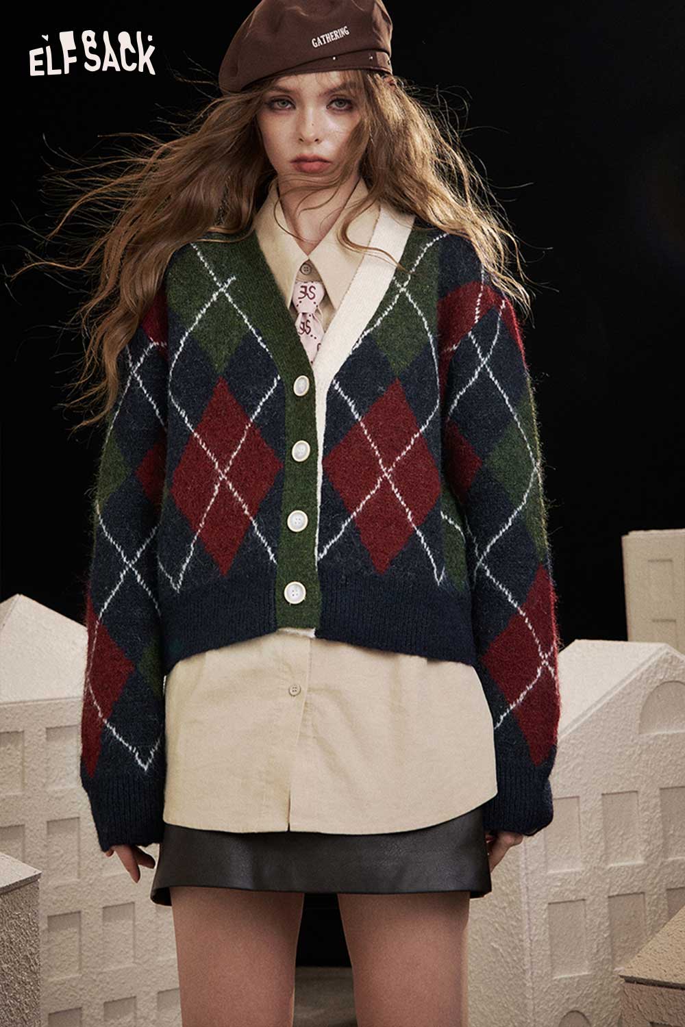 Soft Diamond Line Two Tone V Neck Long Sleeve Sweater