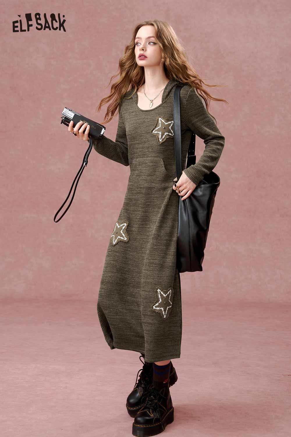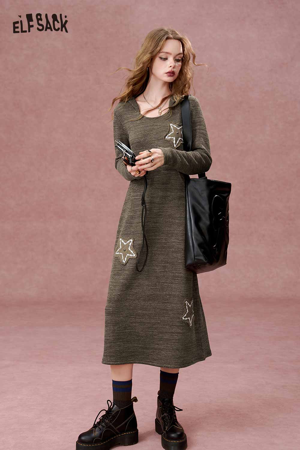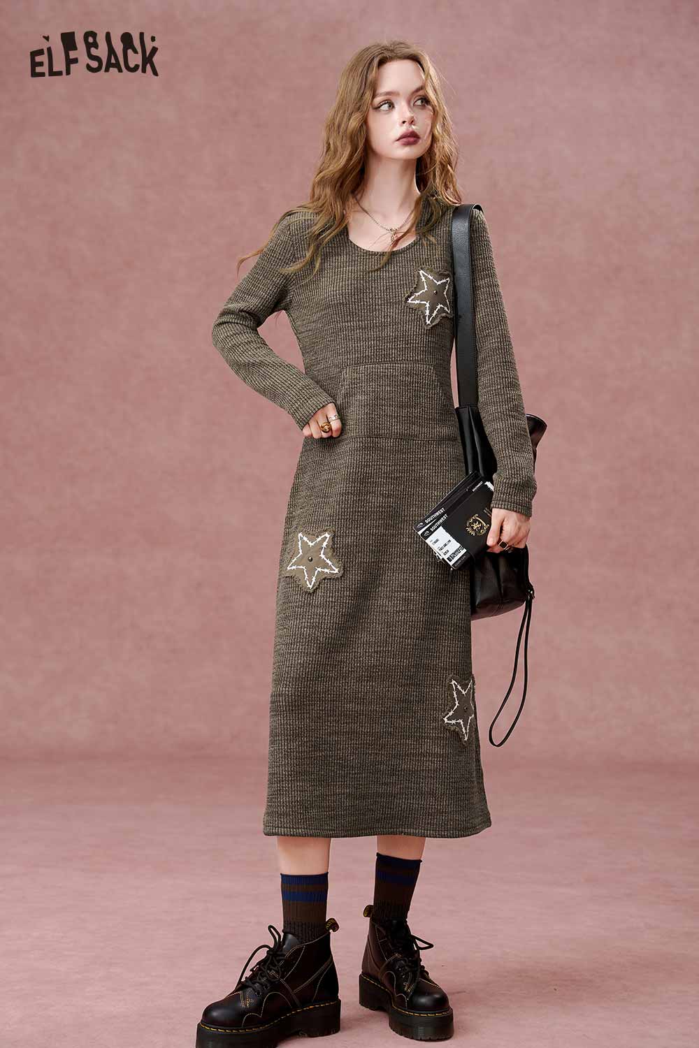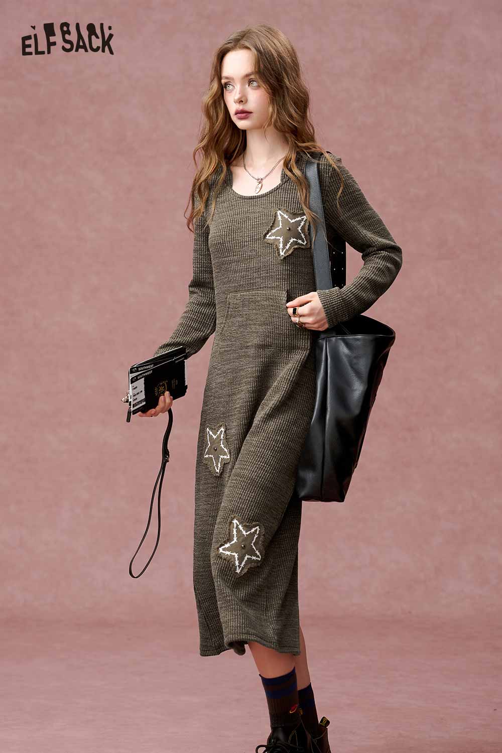 Soft Vintage Star Embroidery Long Sleeve Knit Dress