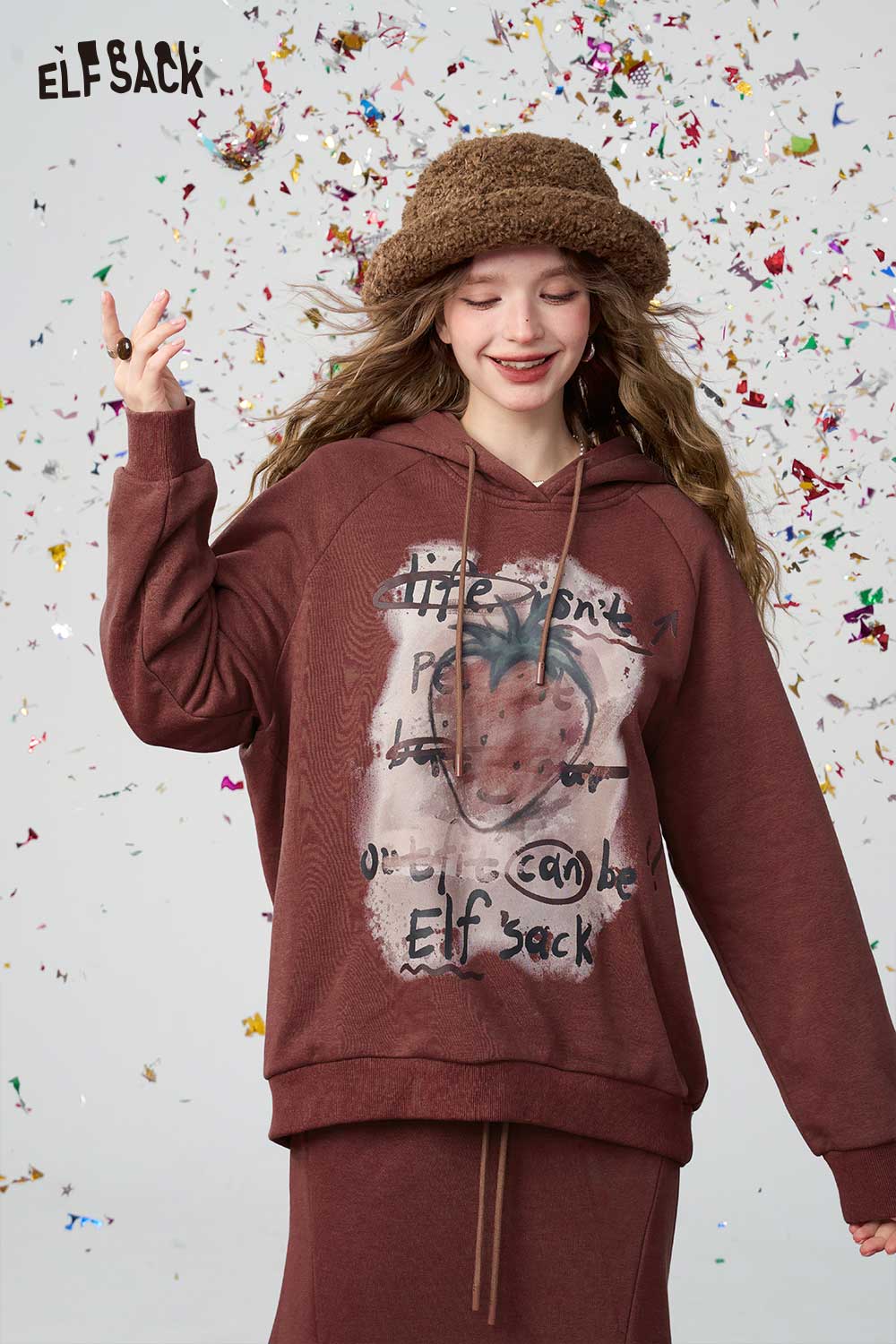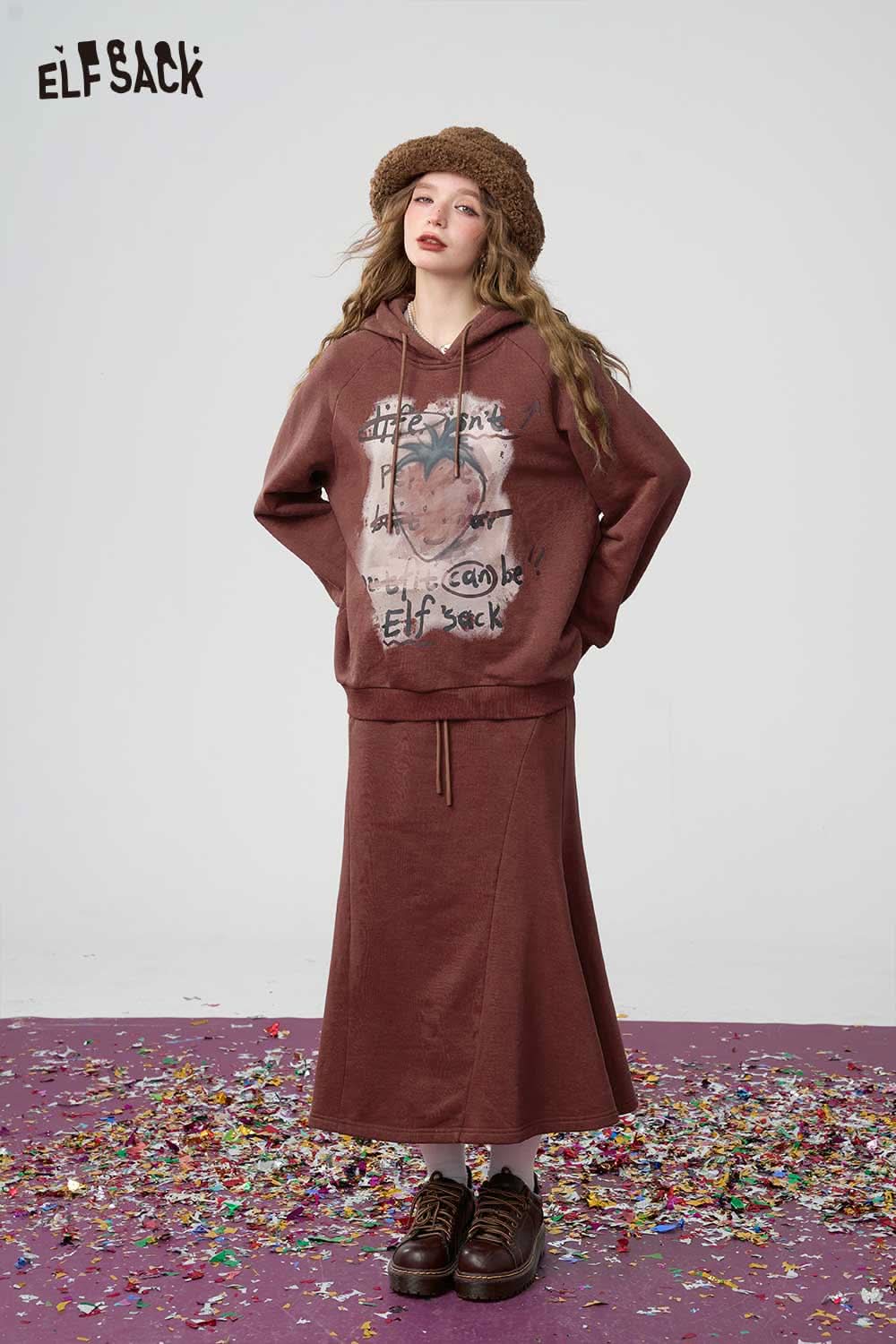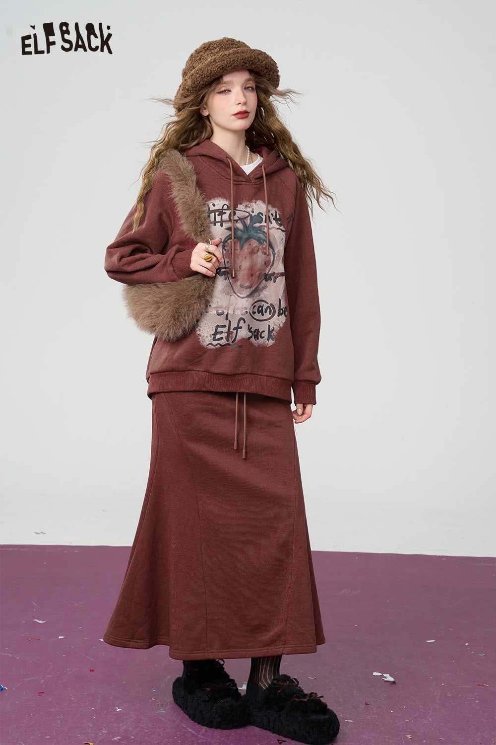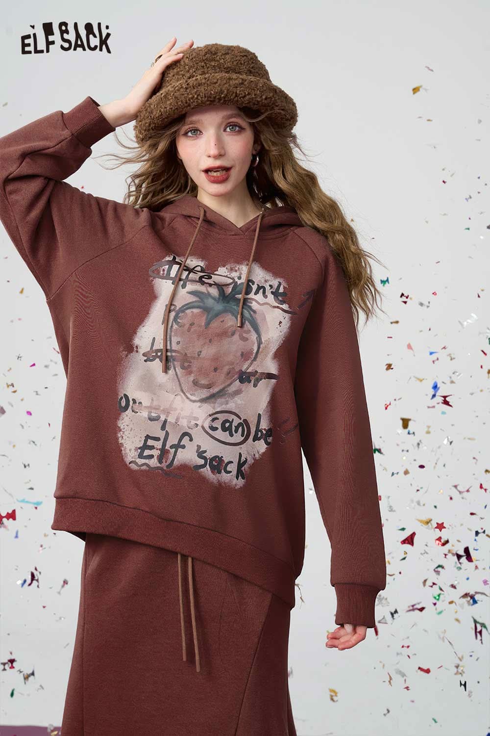 Light Angora Red Strawberry Print Hoodie Half Skirt Set