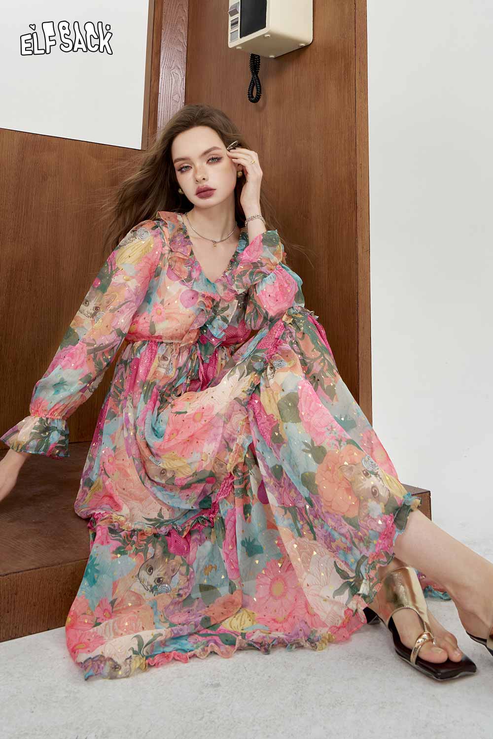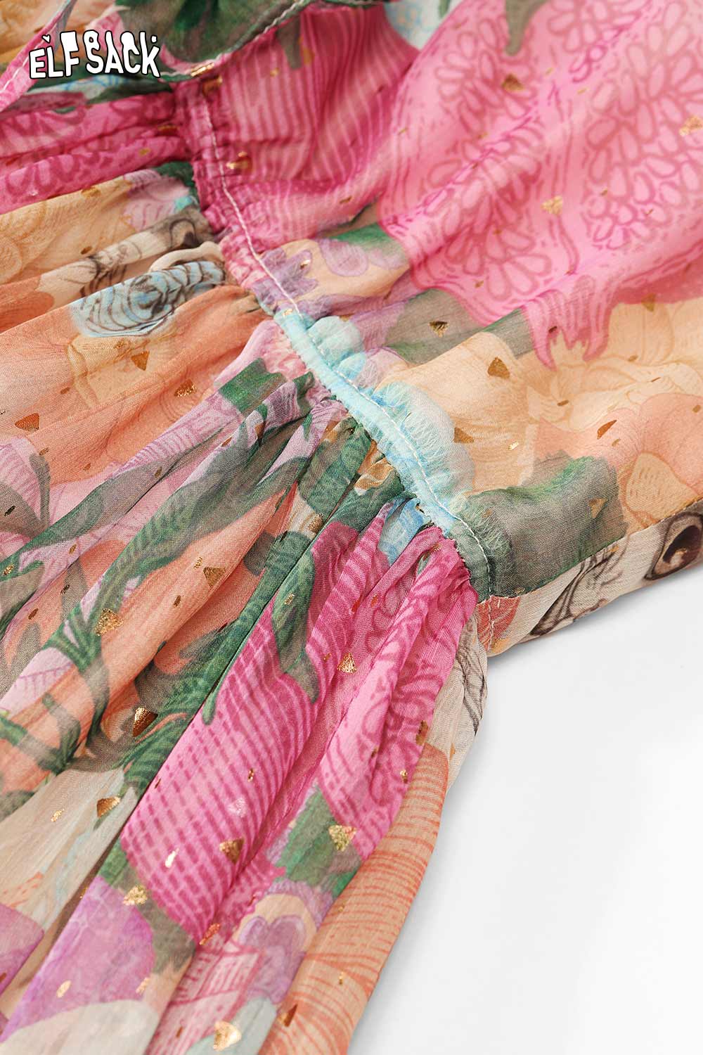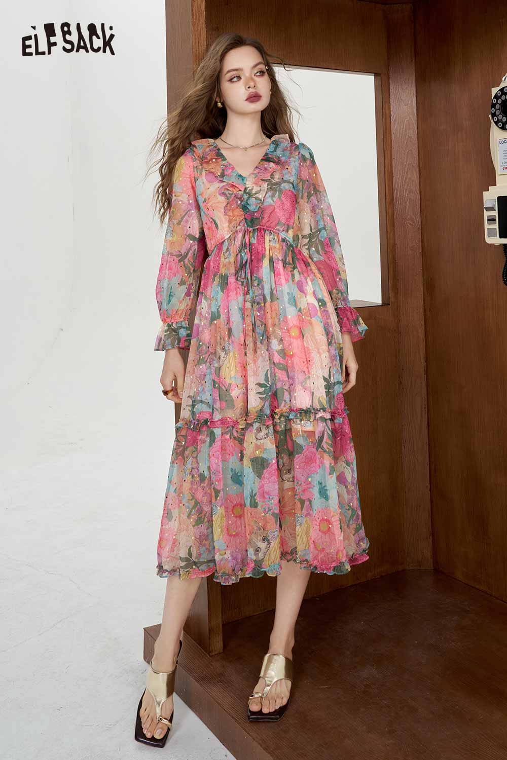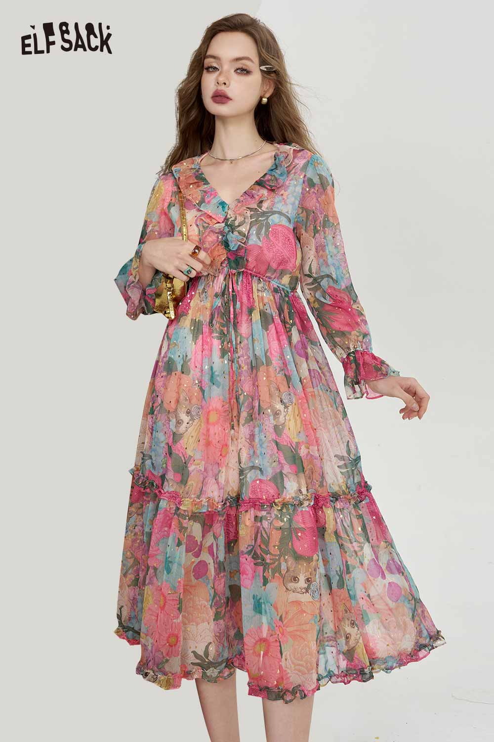Soft Resort French Floral V Neck Waist Dress