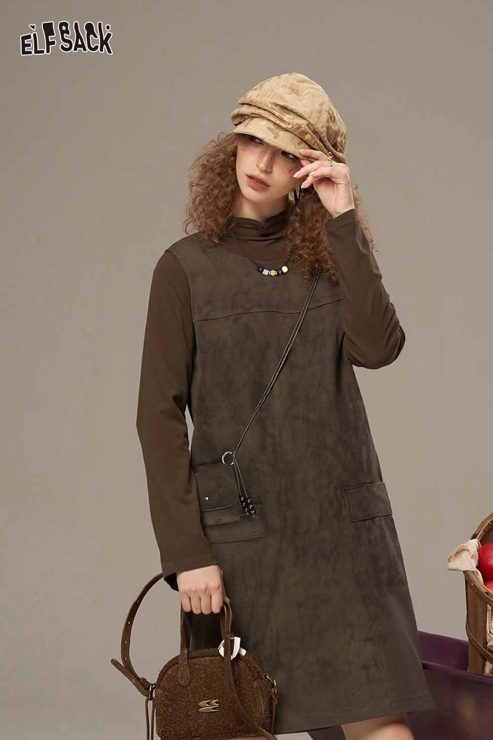 Suede Paneled Mock Layered Turtleneck Solid Color Dress