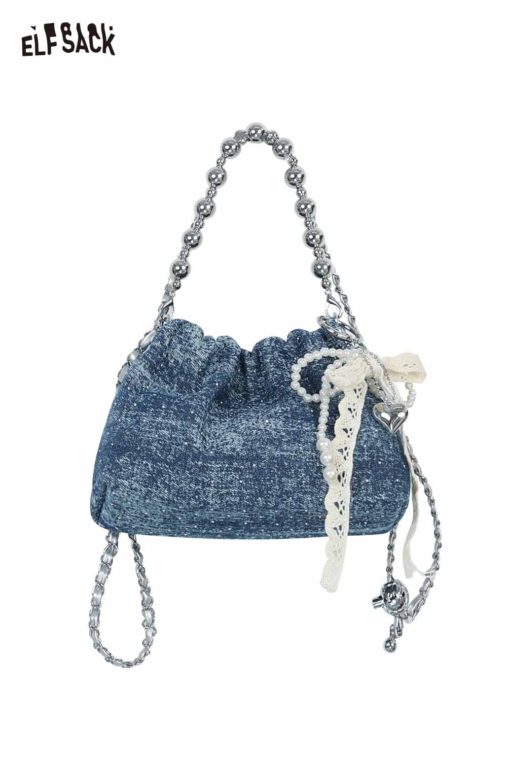 Structured Cloud Print Denim Purse Detachable Chain Strap Top Handle Bag