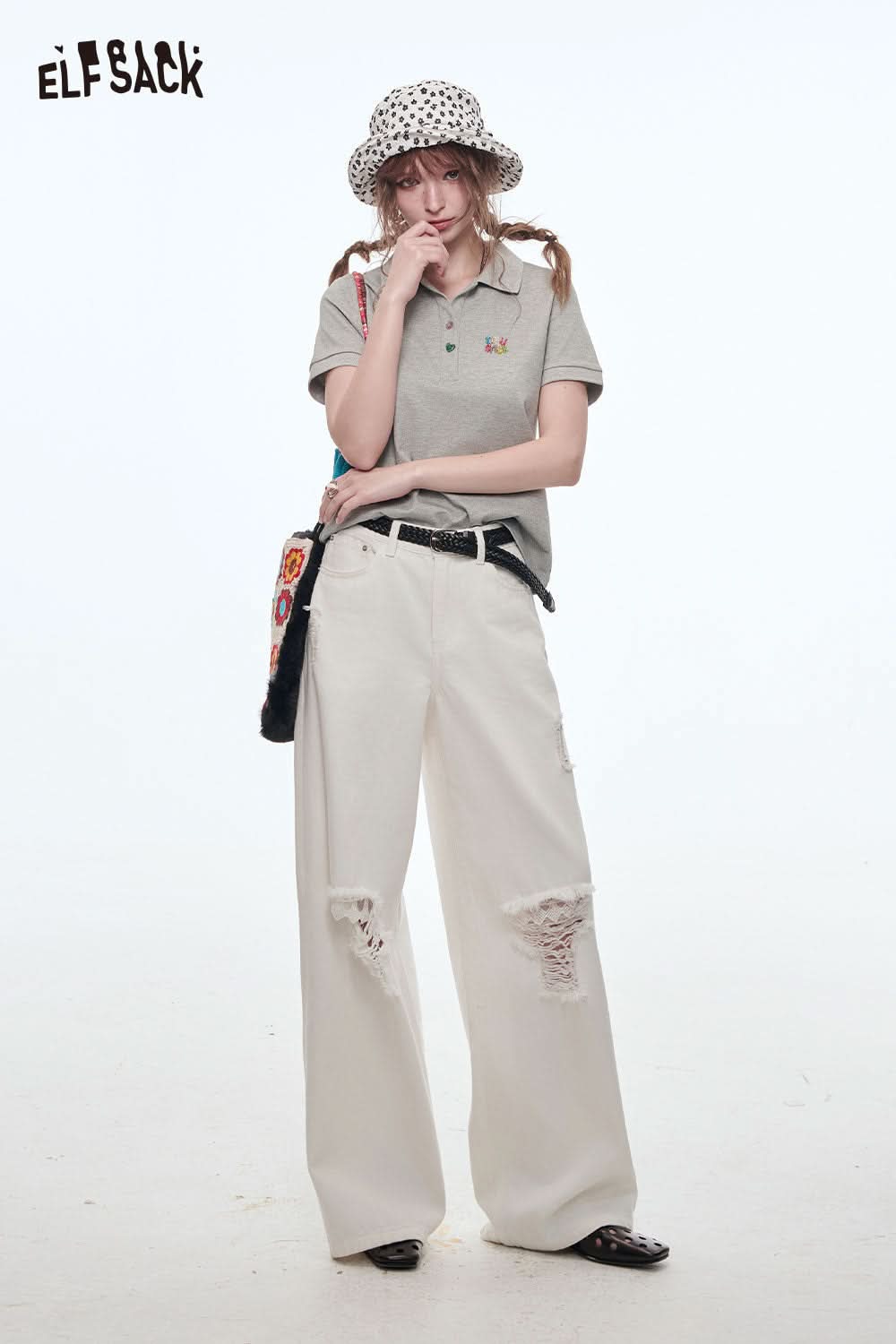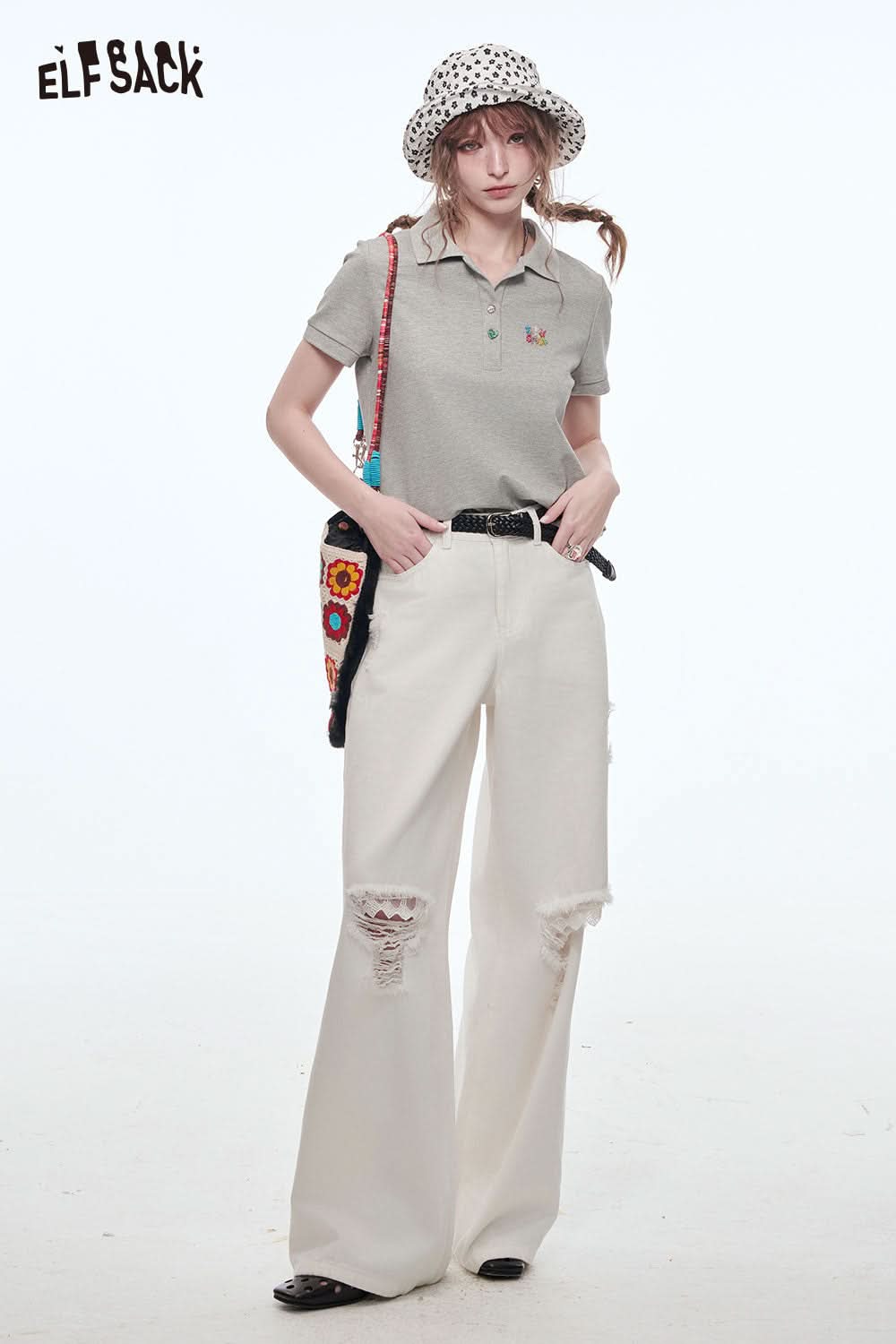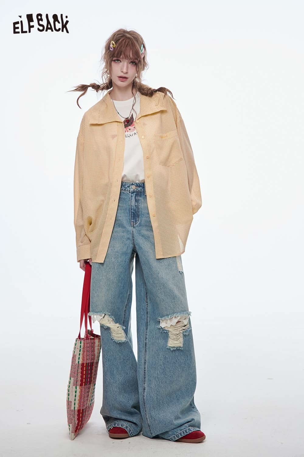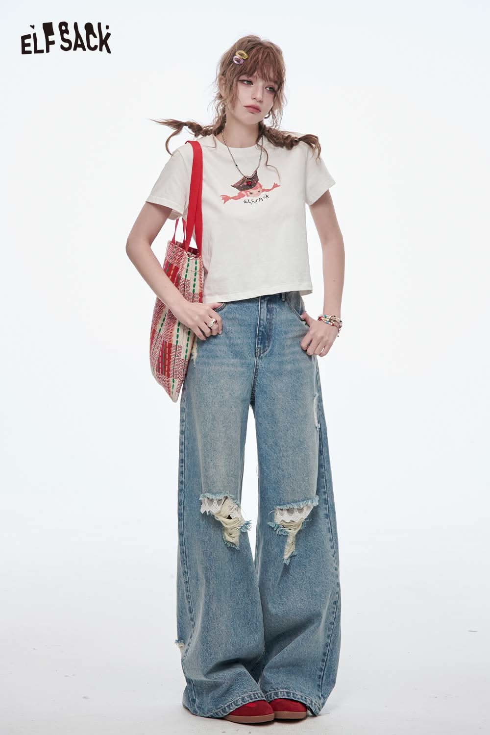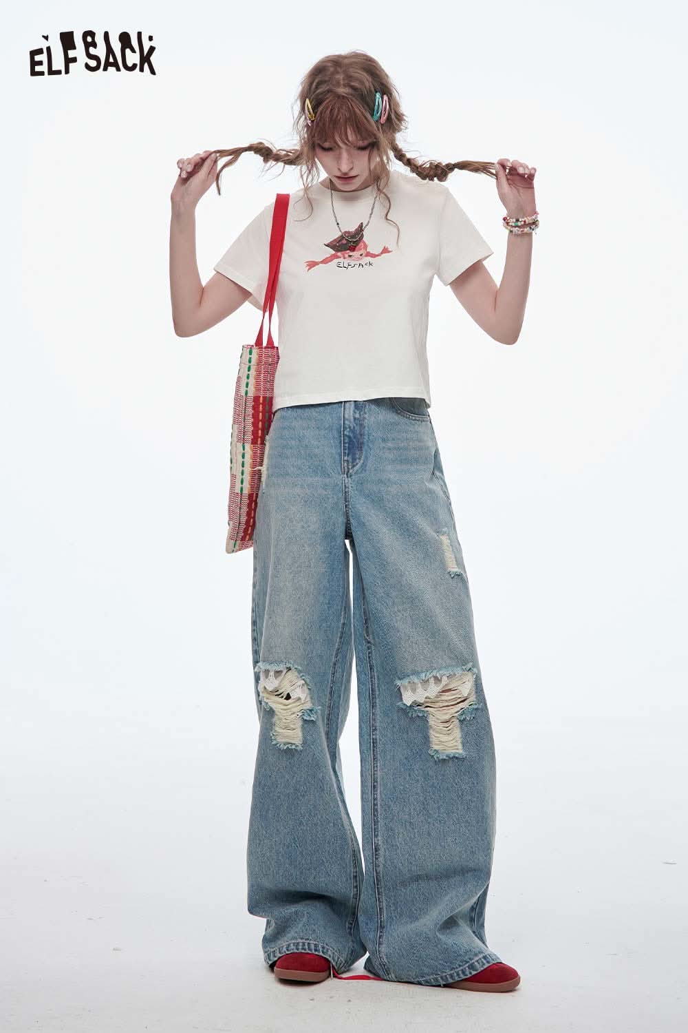 Stretch Denim Distressed Wide Leg Jeans