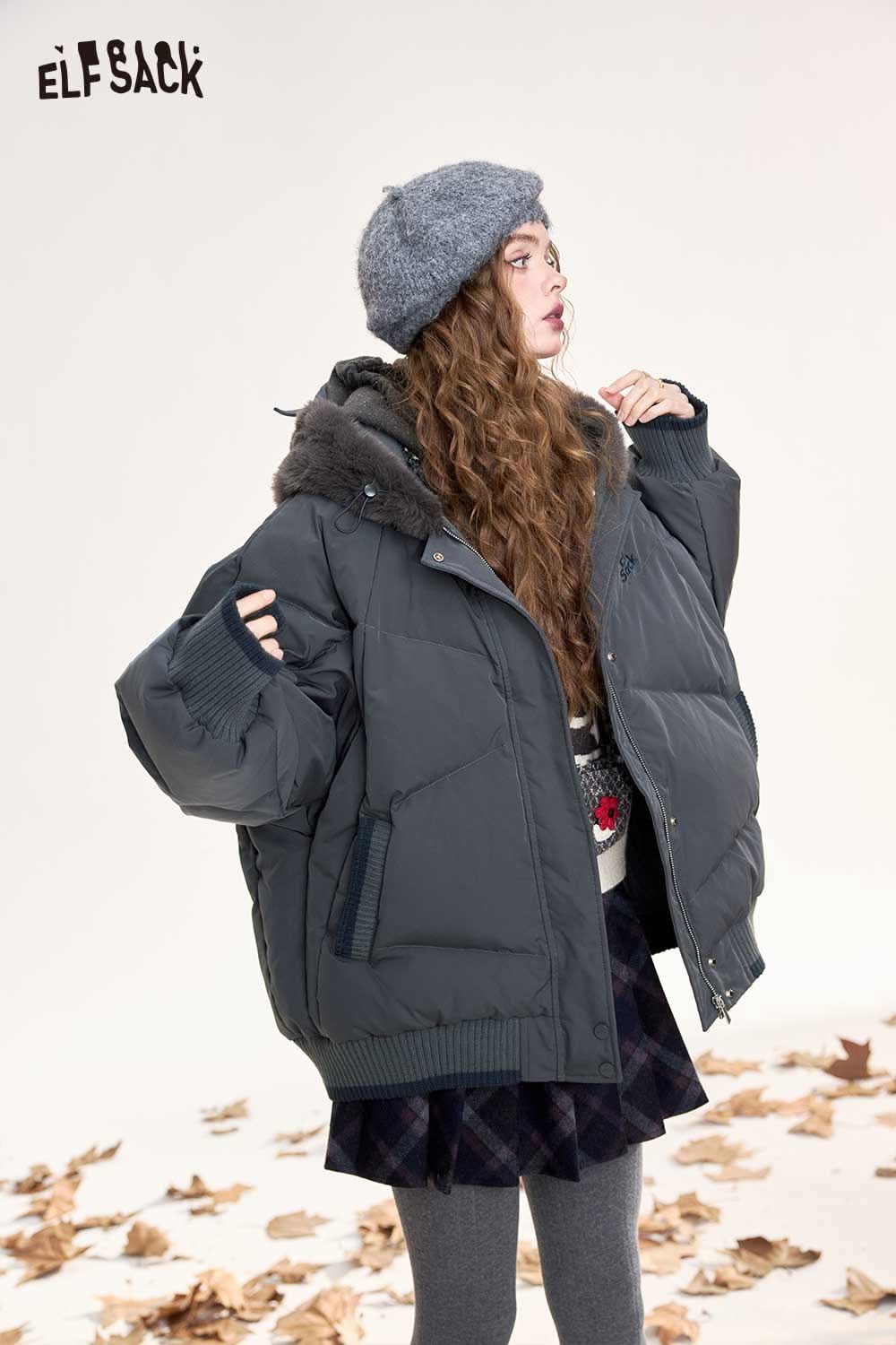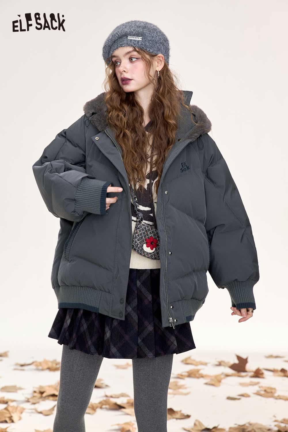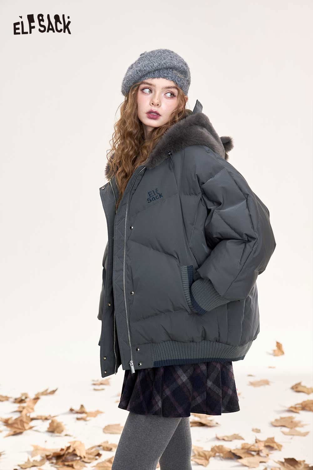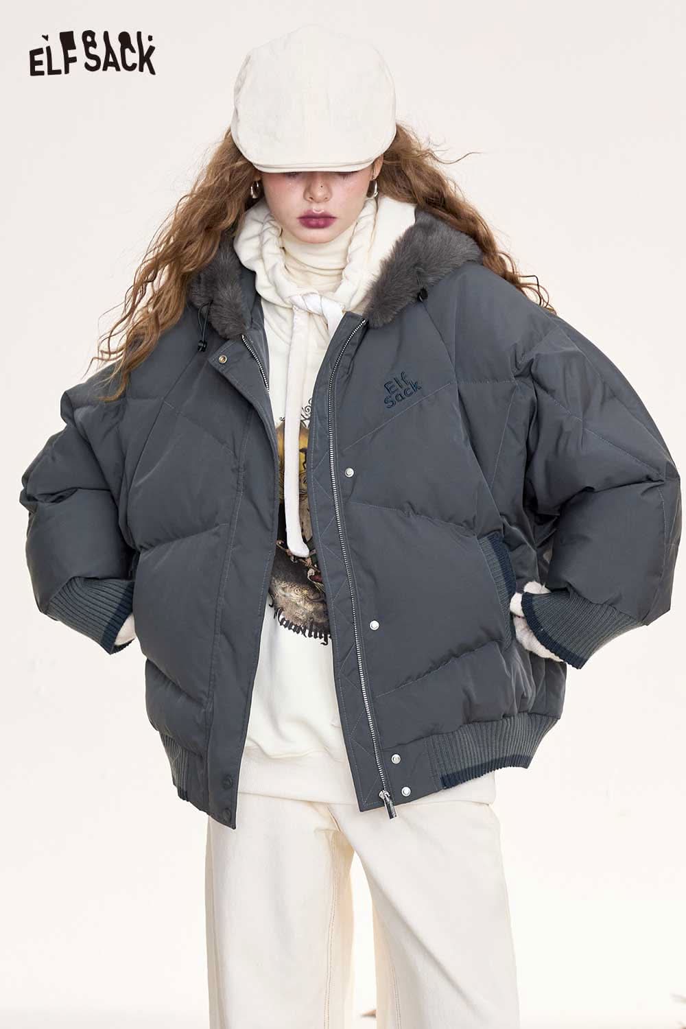 Light Oversized Black Fur Trim Hooded Down Jacket