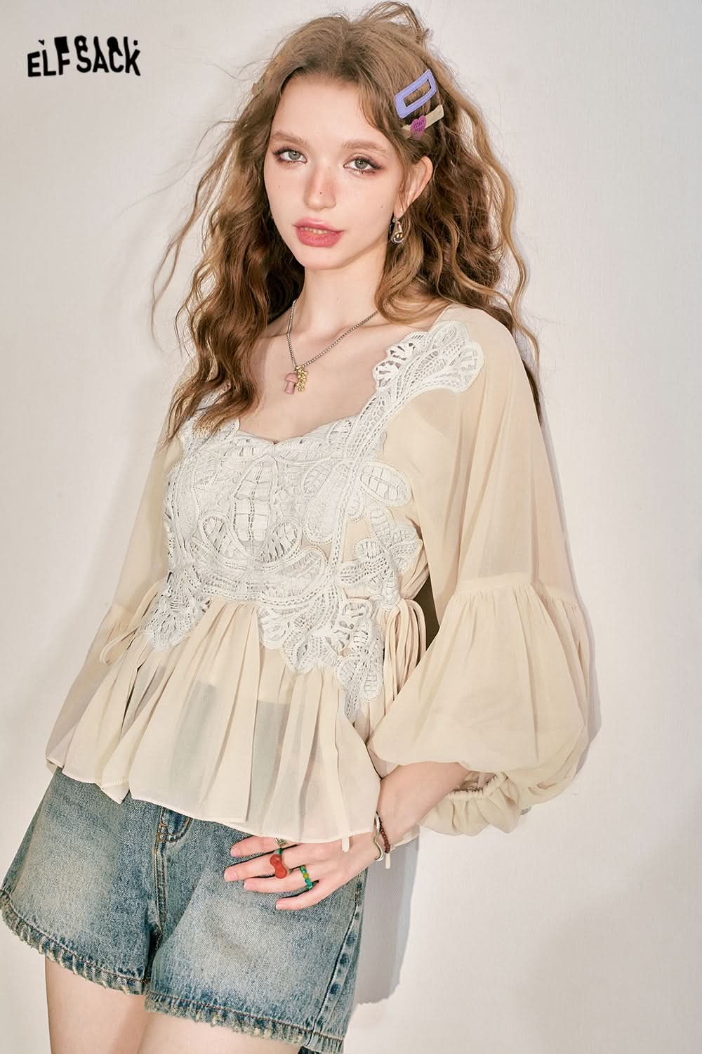 Immortal Air Hollow Lace Chiffon Shirt Women's Cover Up Thin Gauze Top