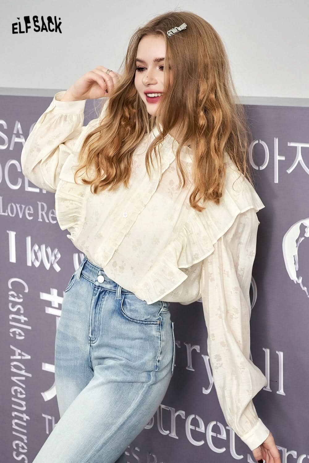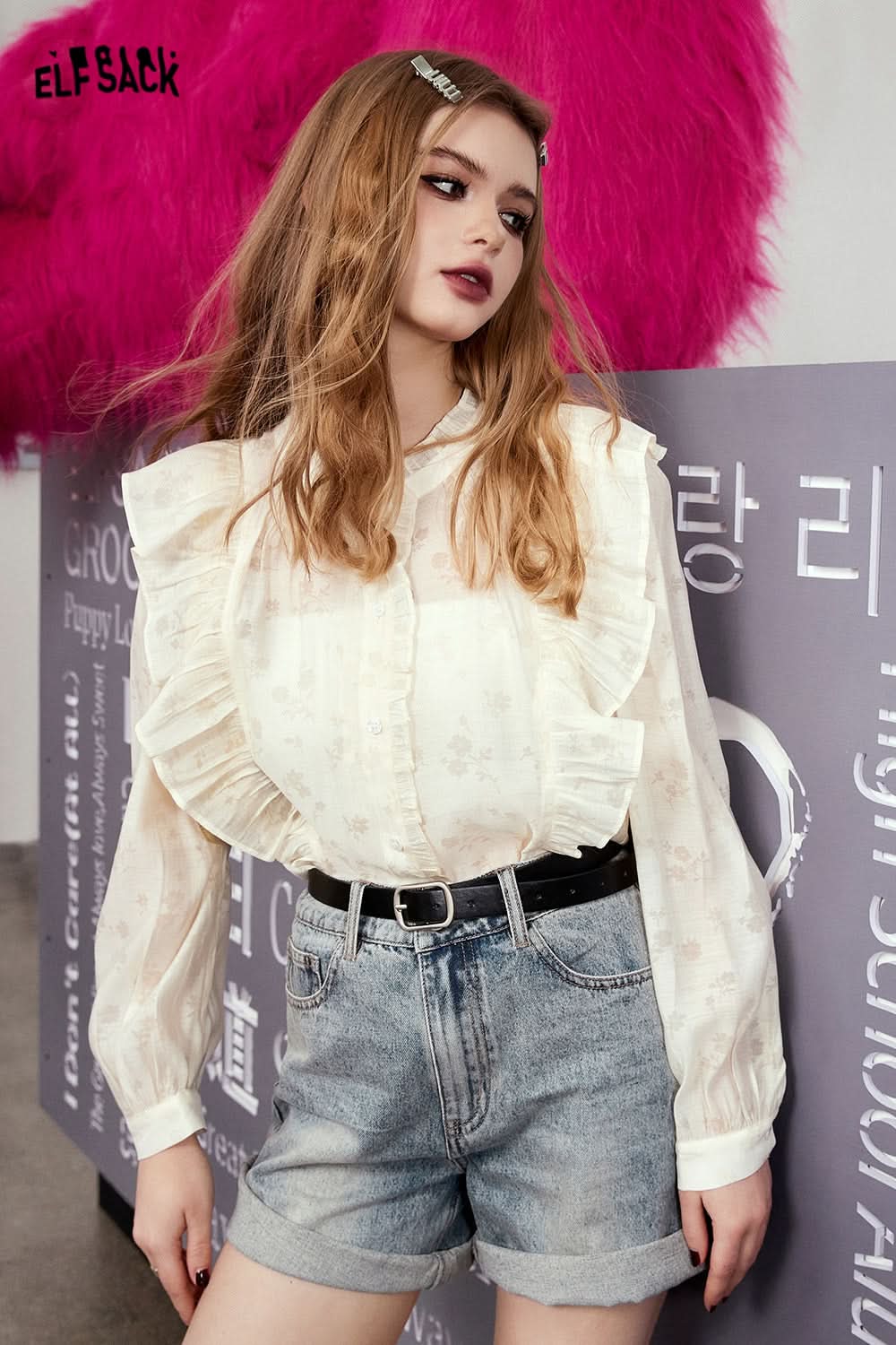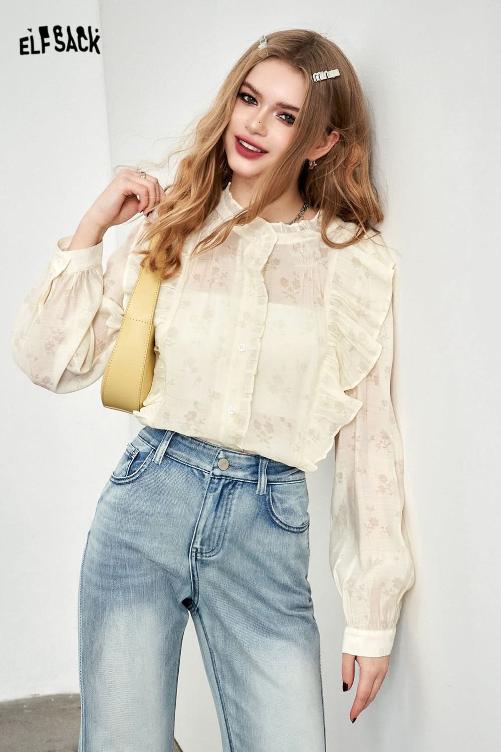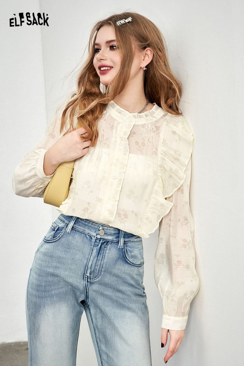 French Chiffon Lace Shirt's Spring Lantern Sleeve Mesh Top