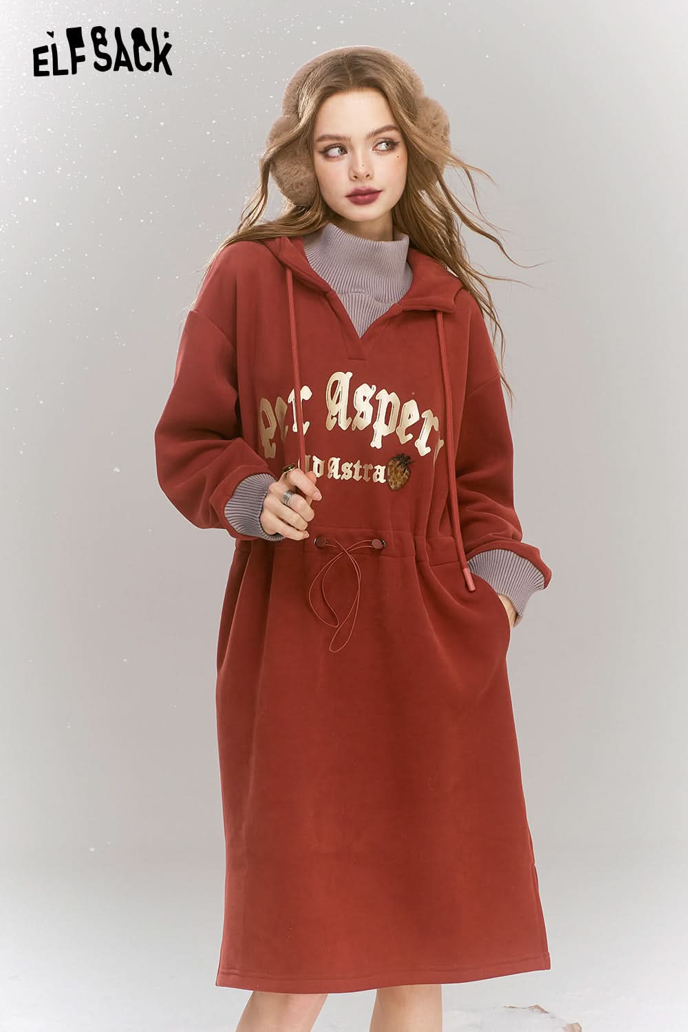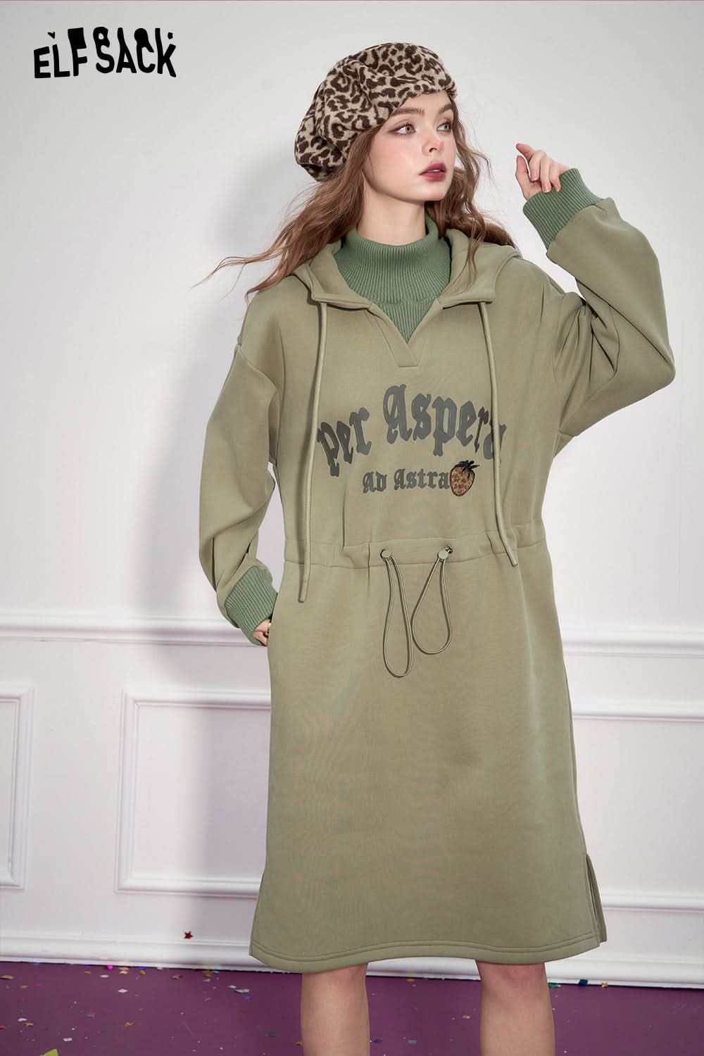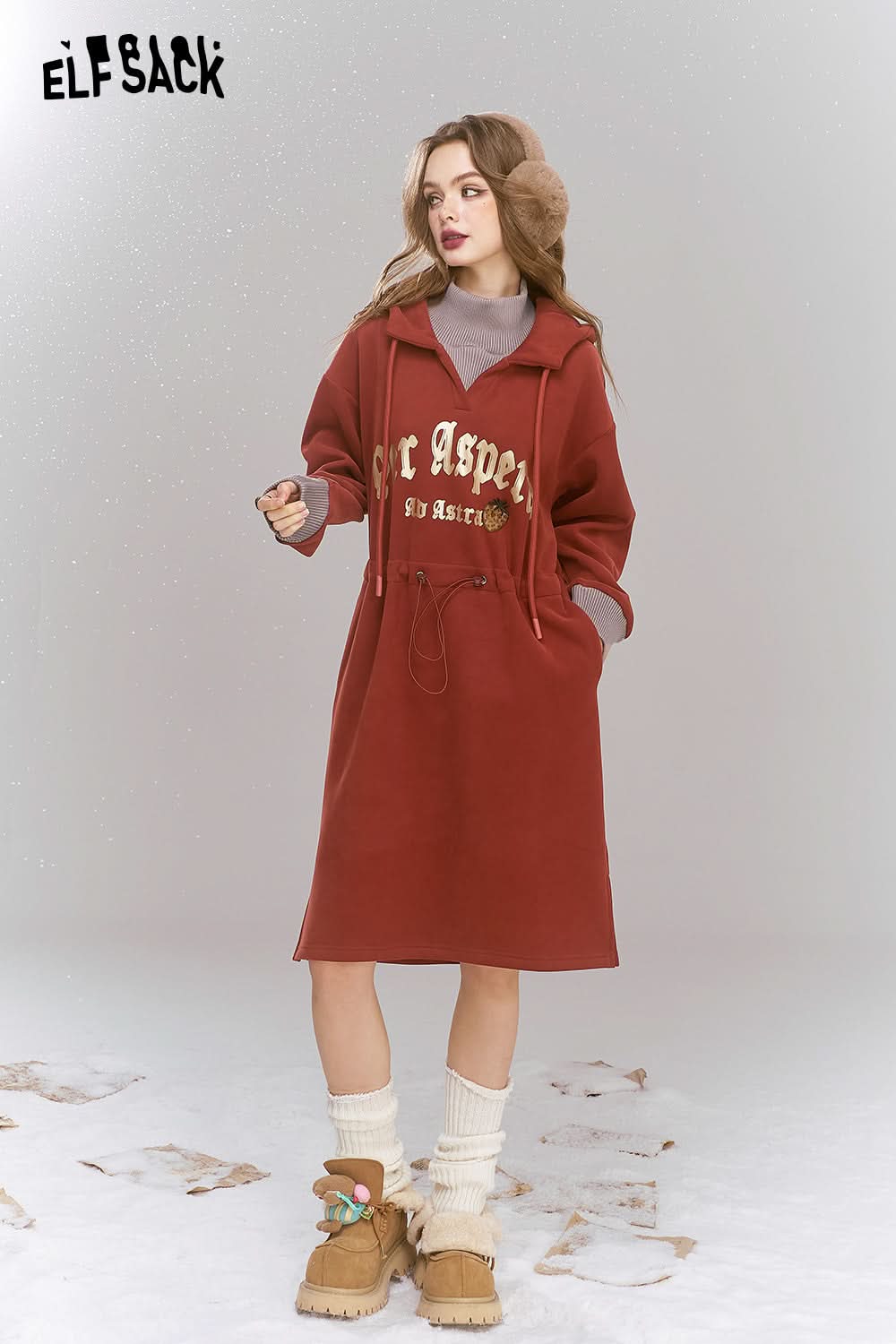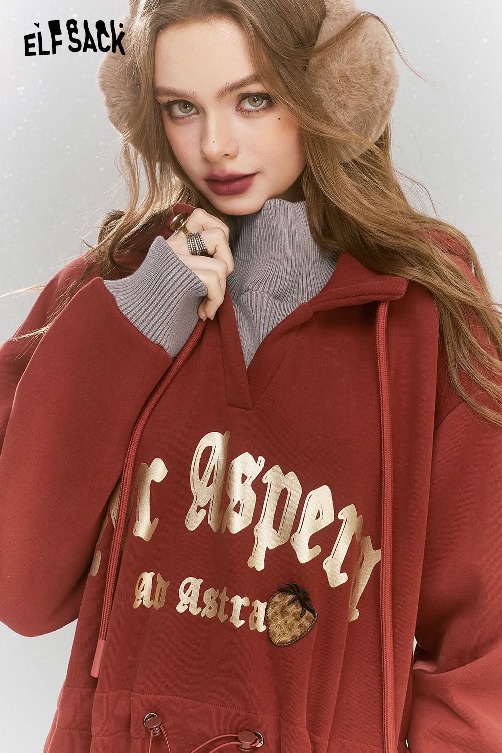 Loose casual printed fleece hooded dress, with drawstring waist cinching, letter printed strawberry patch