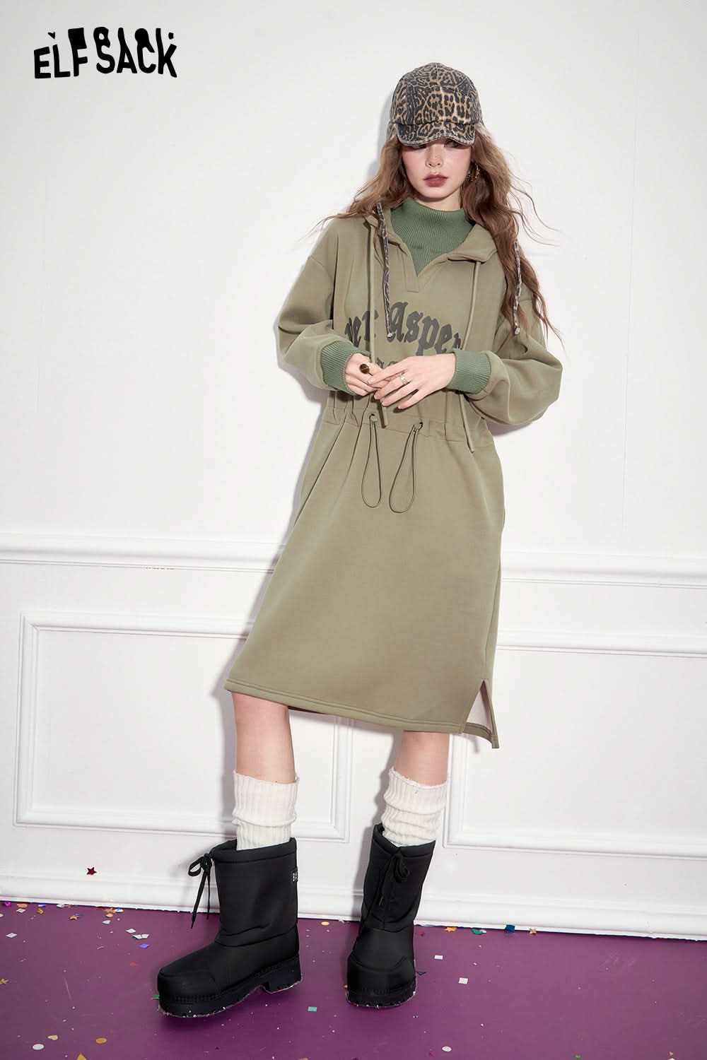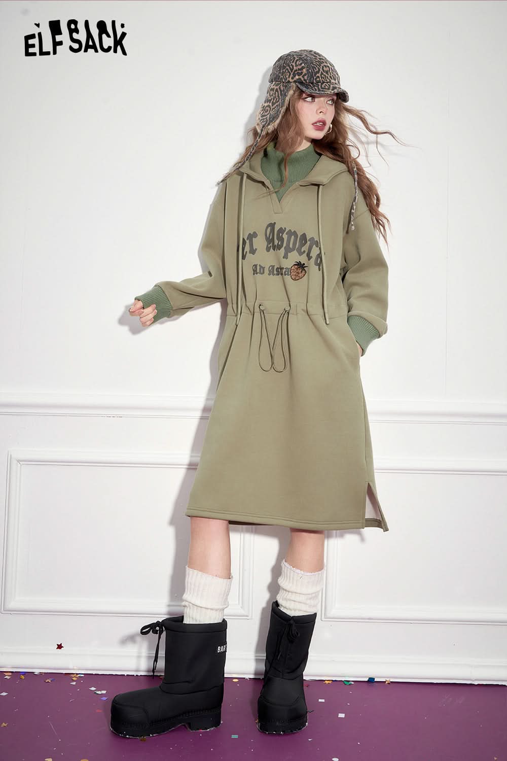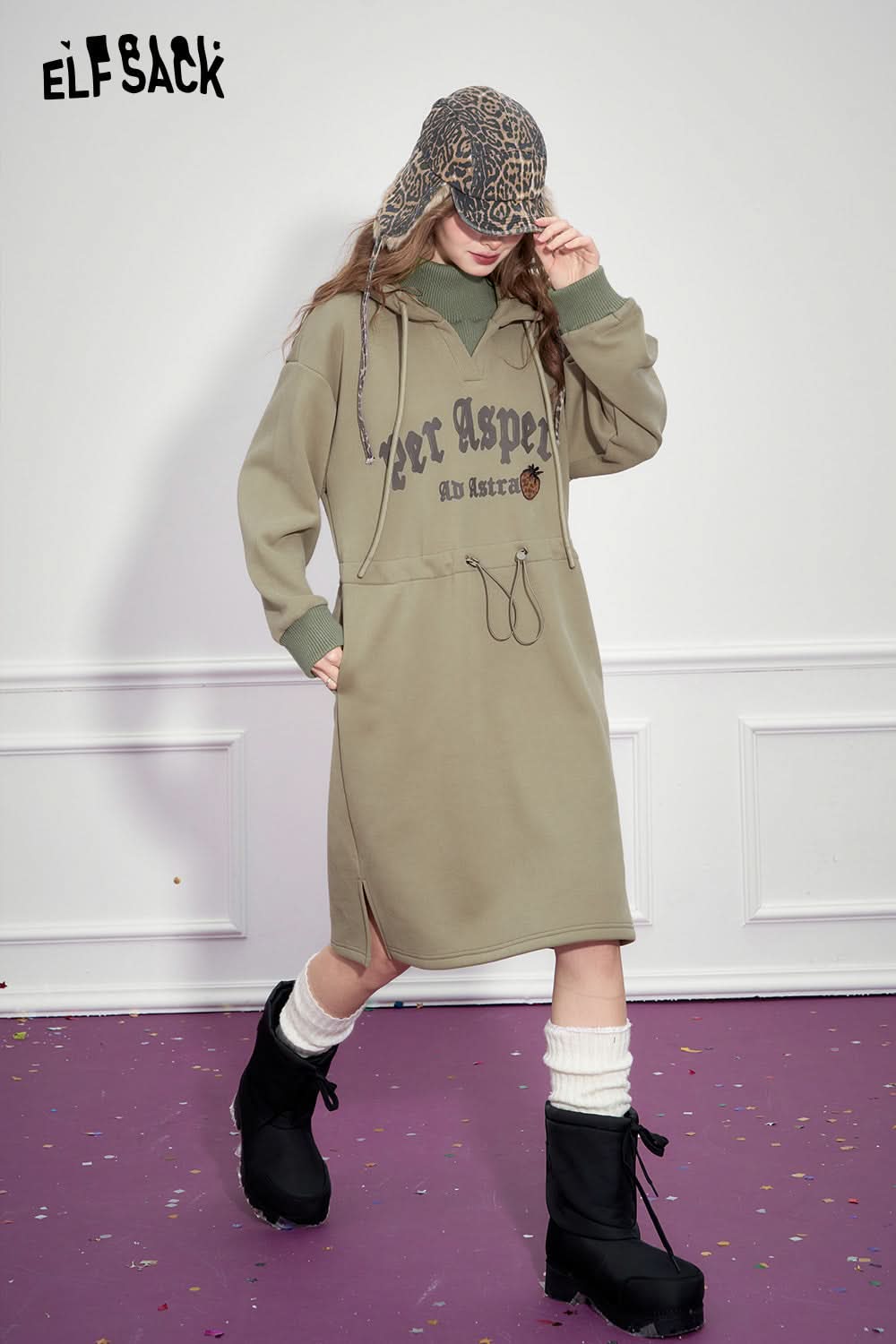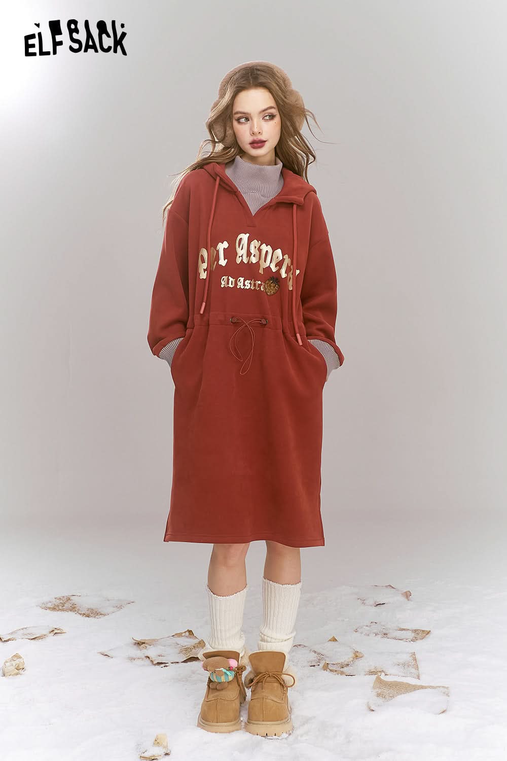 Loose casual printed fleece hooded dress, with drawstring waist cinching, letter printed strawberry patch