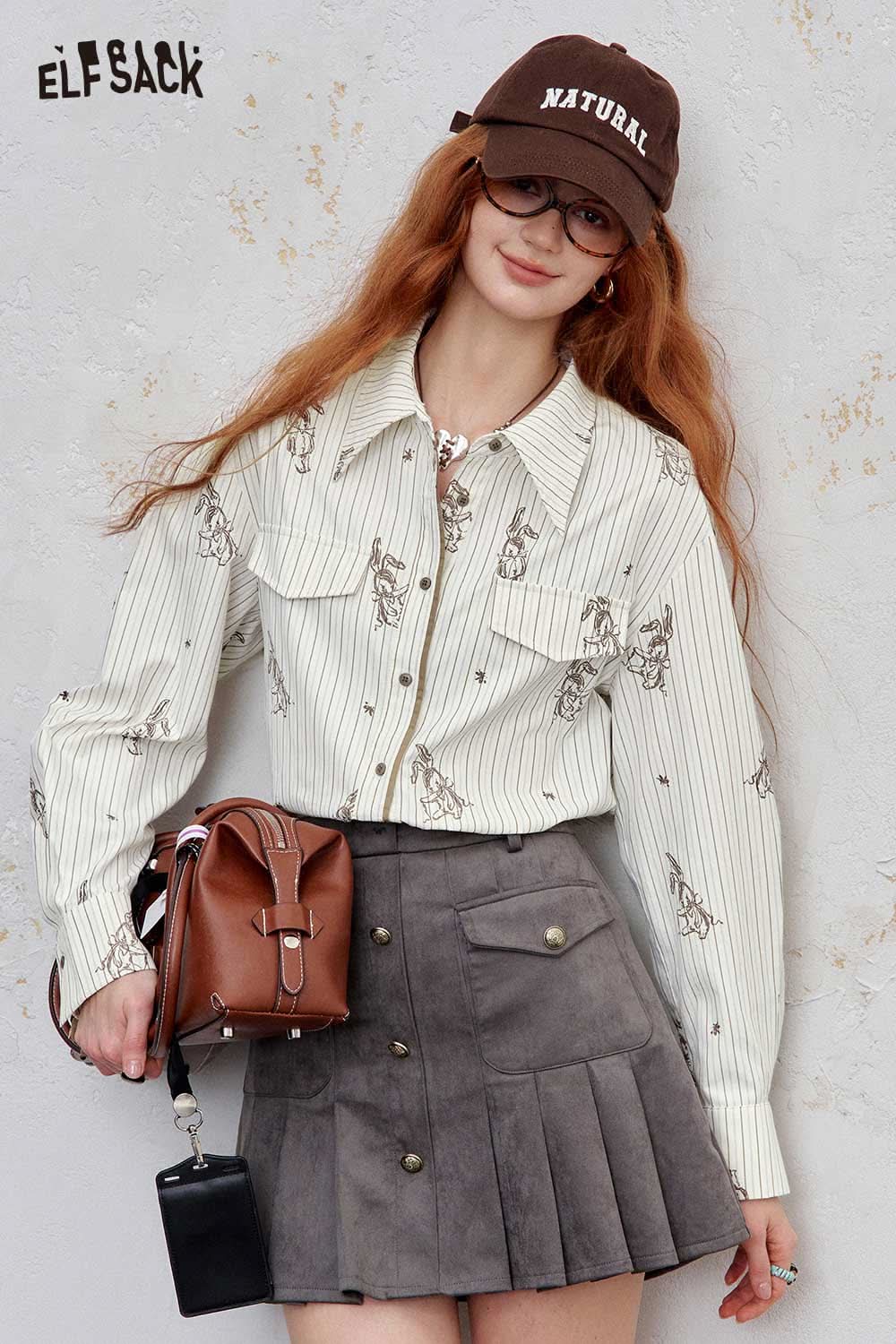 ELFSACK women's stripe poplin shirt styled with a gray skirt and accessories for a chic look
