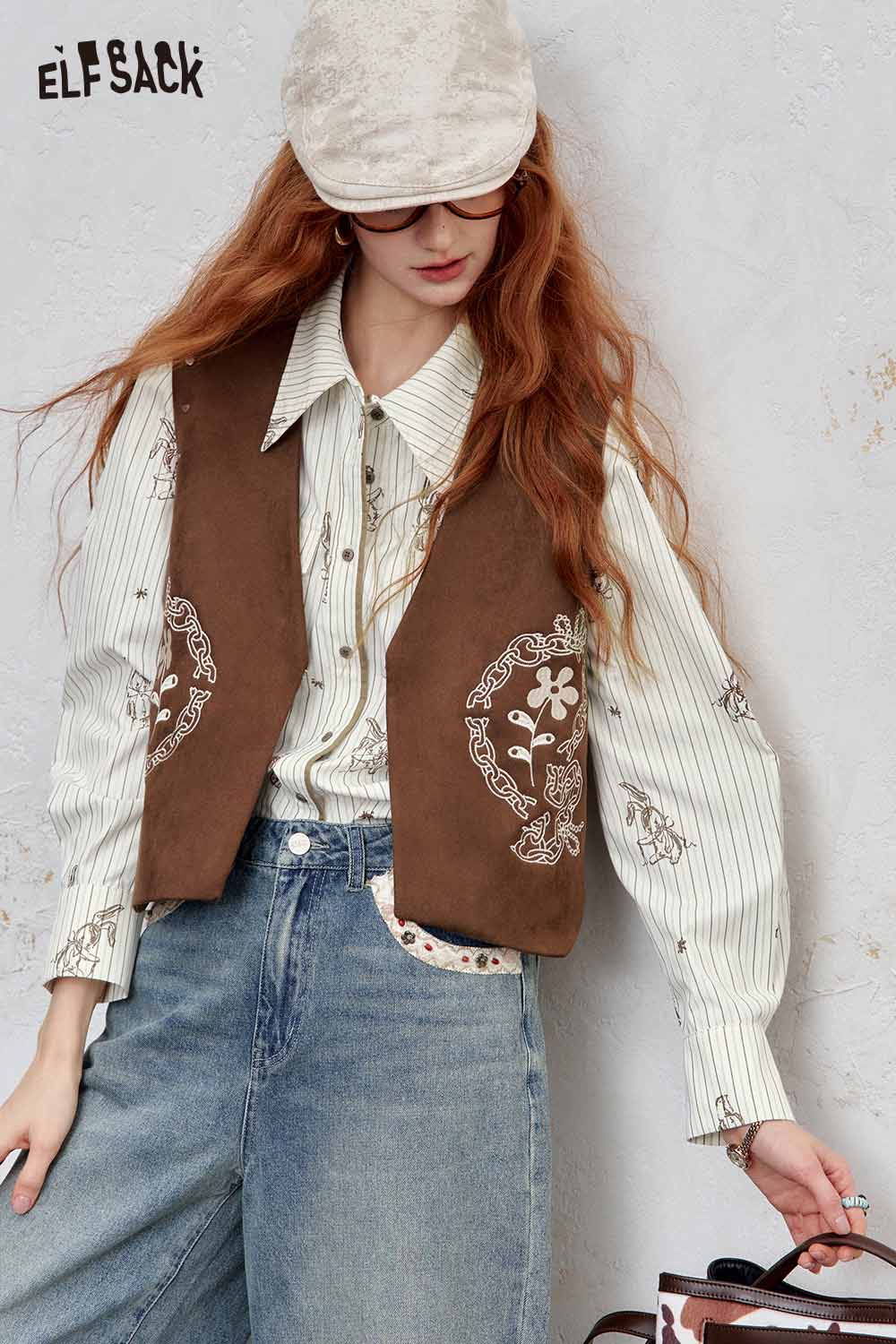 ELFSACK women's stripe poplin shirt with a stylish vest paired with wide-leg jeans and boots