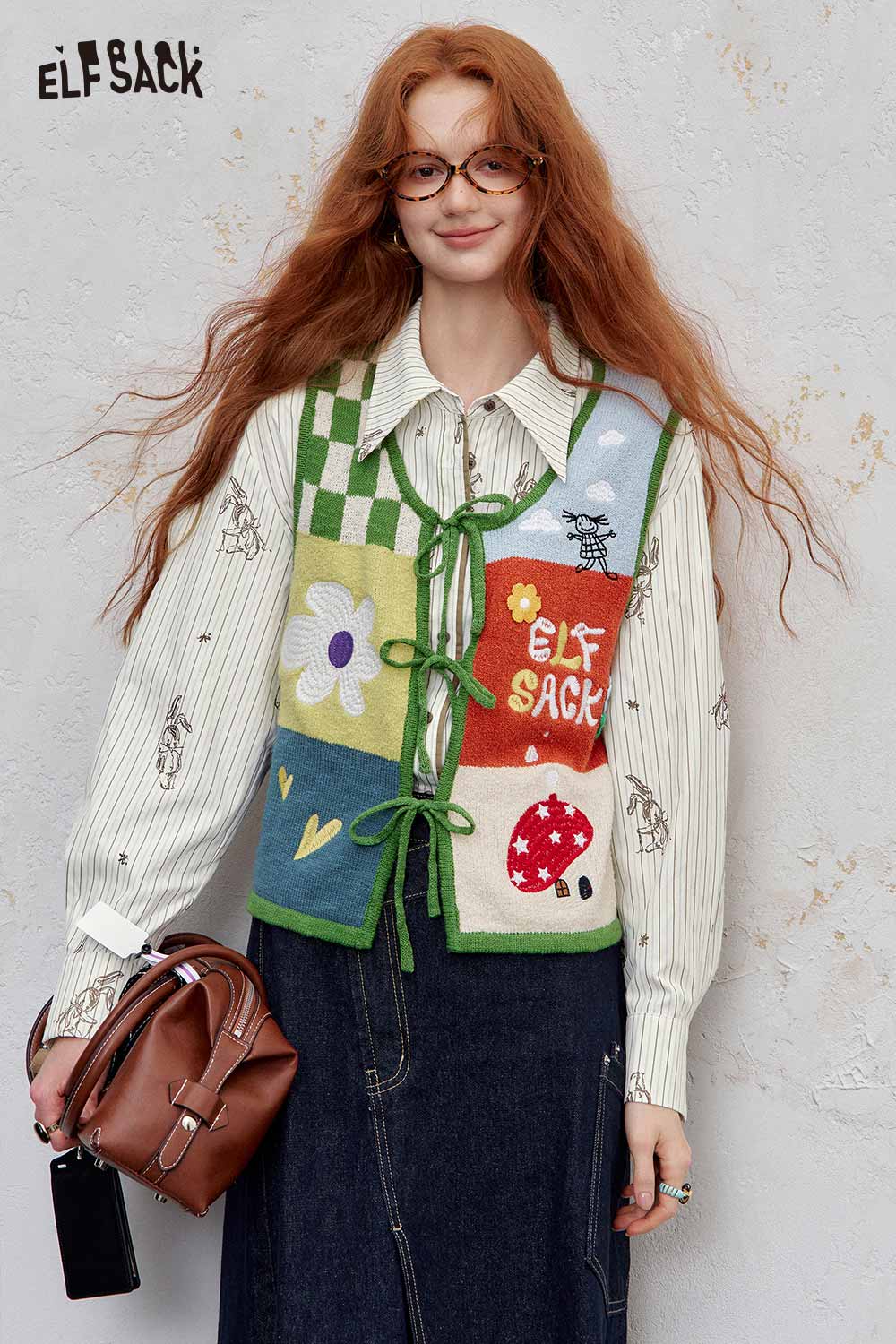 ELFSACK women's stripe poplin shirt paired with a colorful patchwork vest for a trendy look