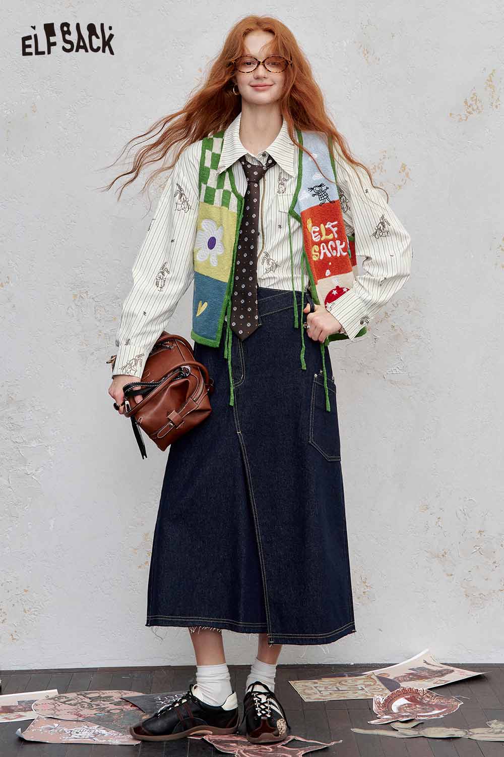 ELFSACK women's stripe poplin shirt styled with a quirky tie and layered over a long denim skirt