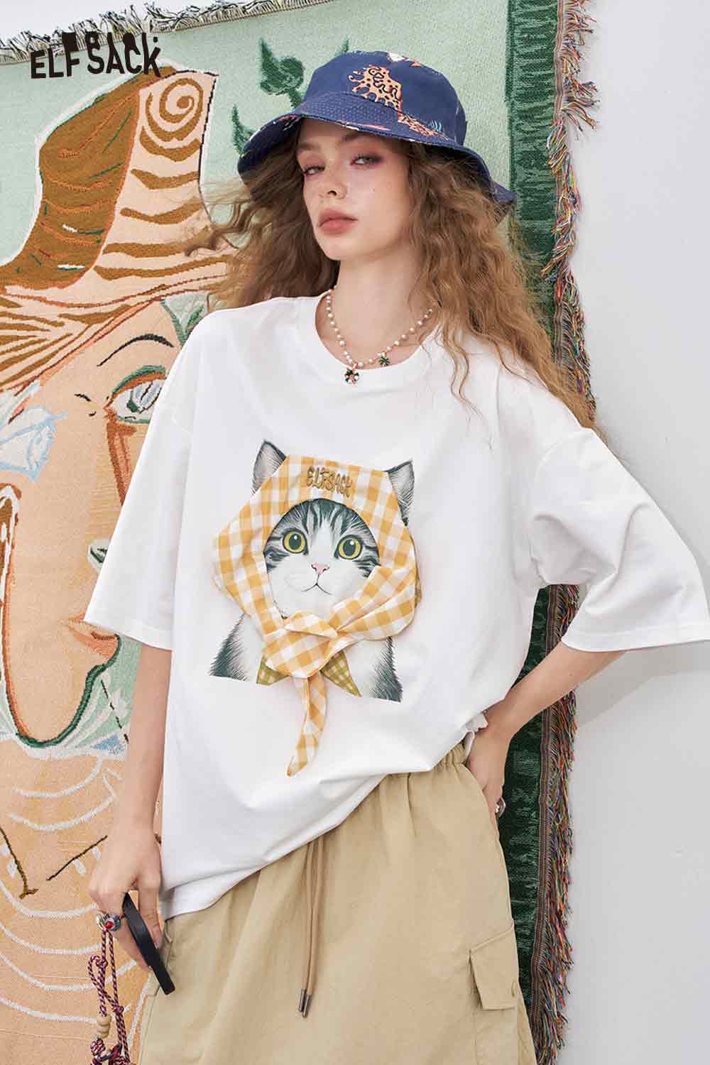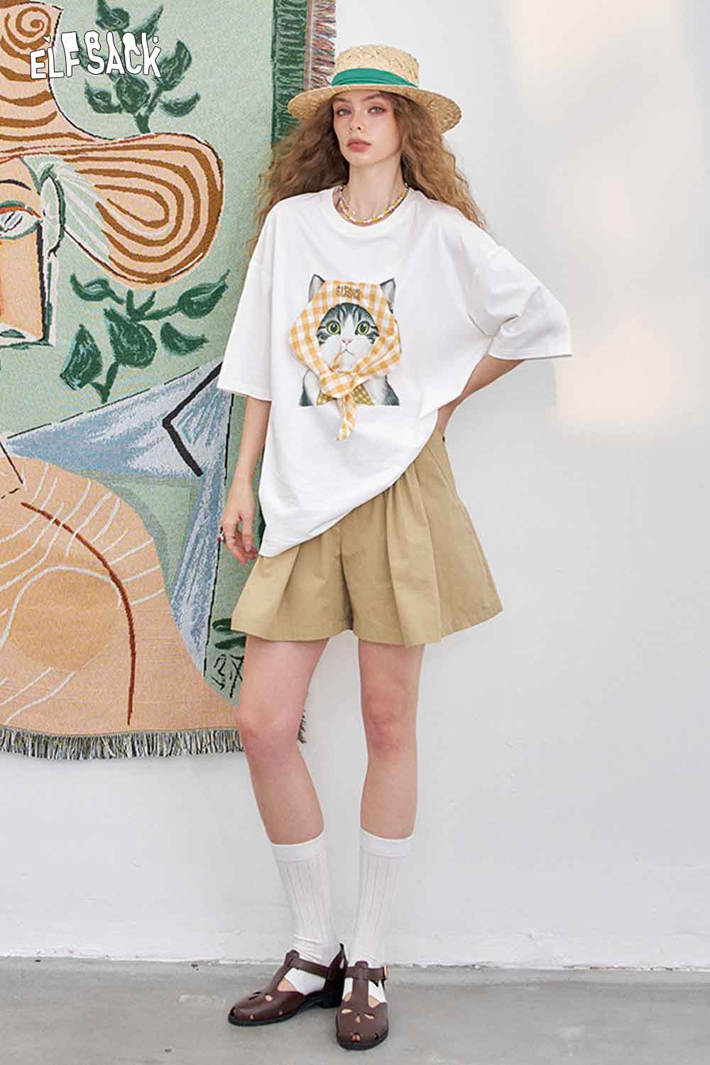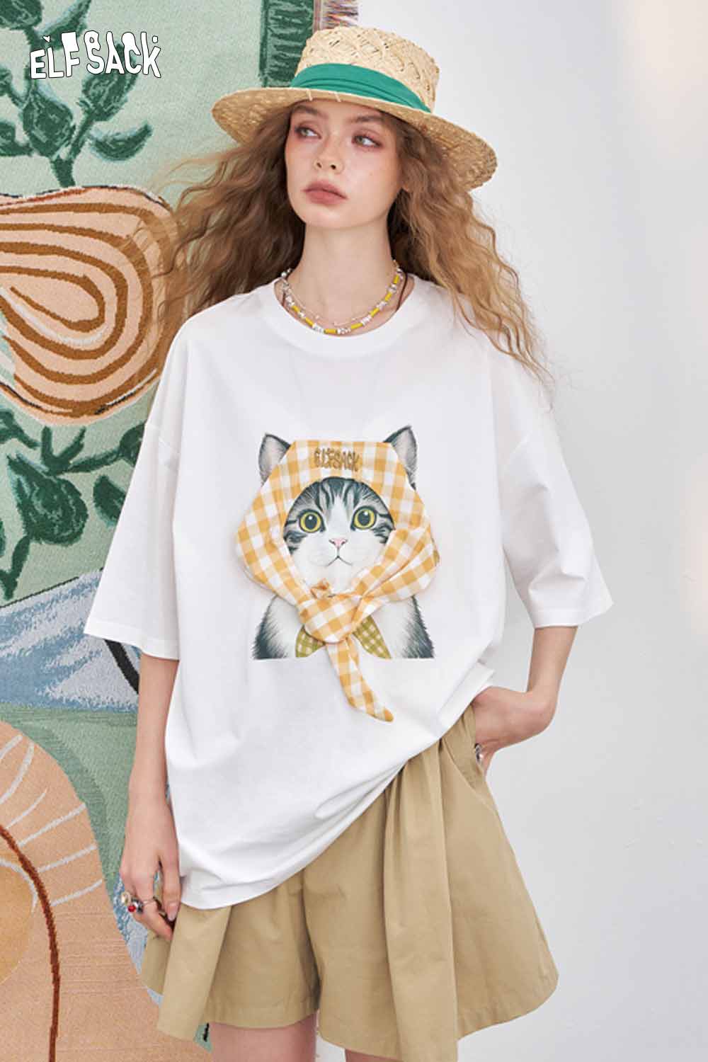 Light Loose Vivid Cat Print Short-Sleeved White T-Shirt