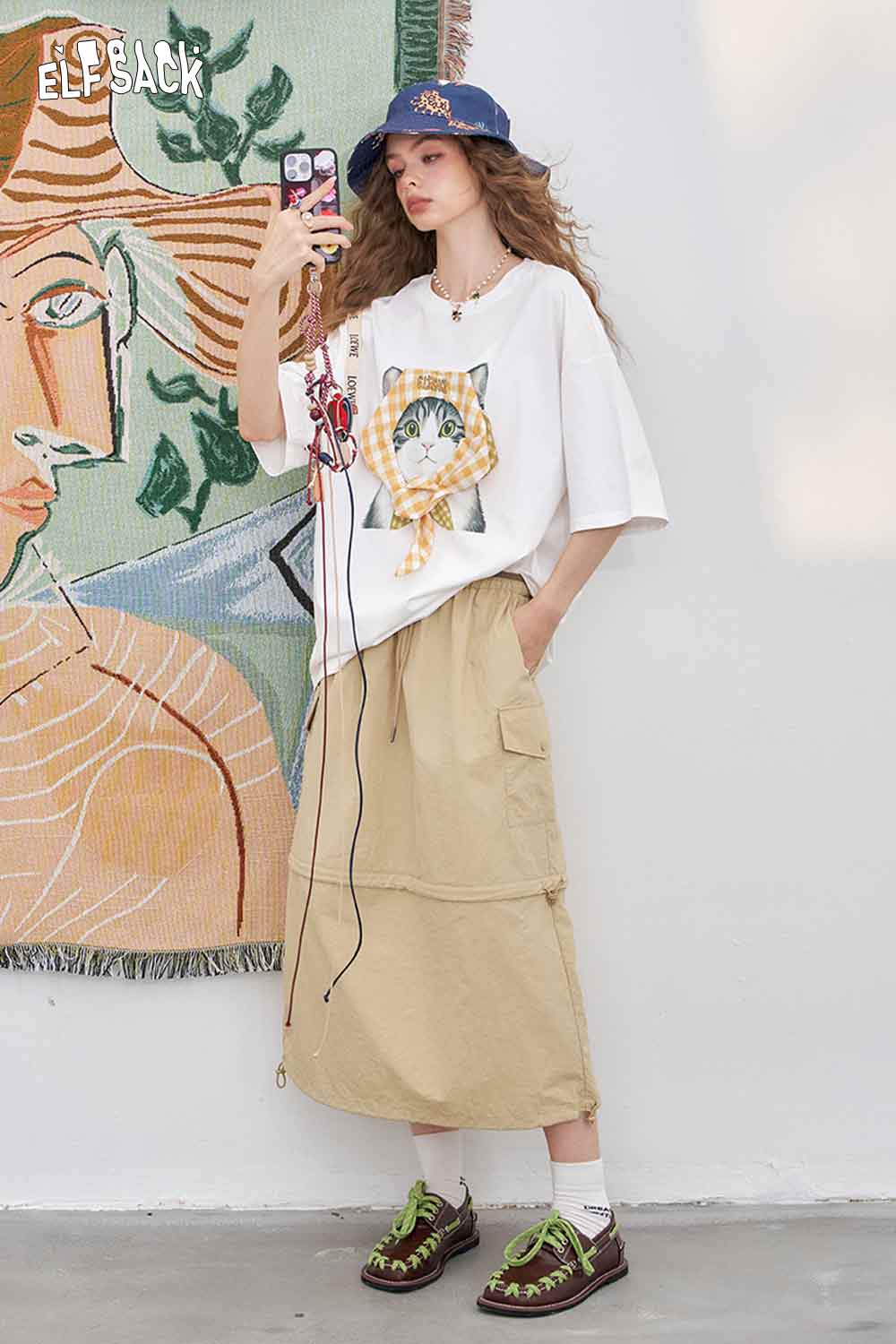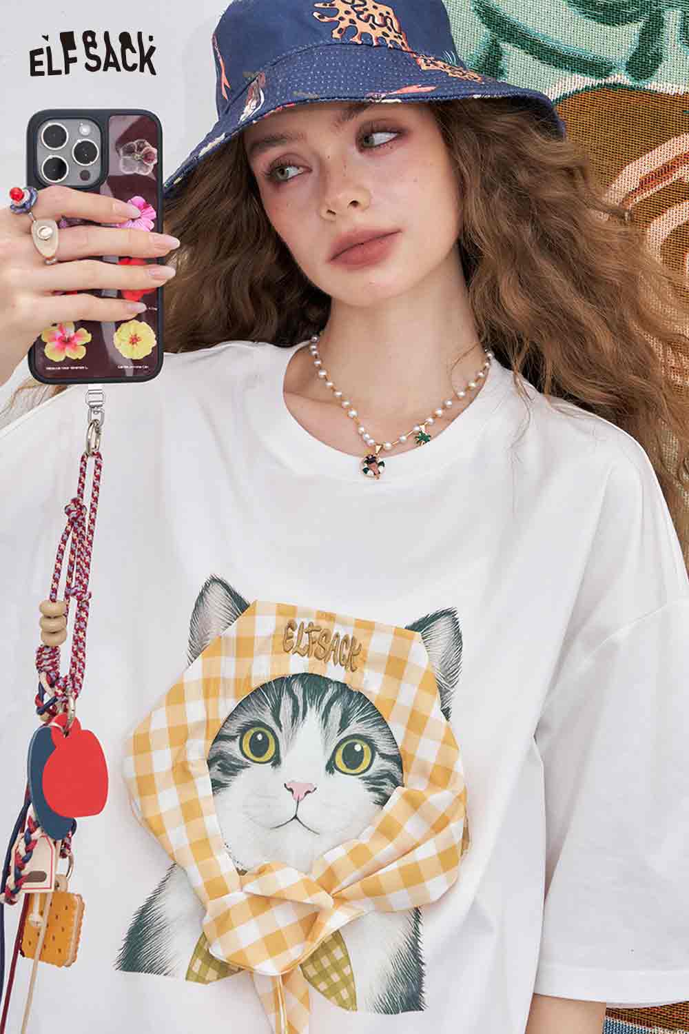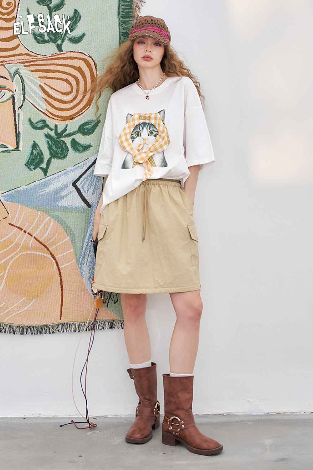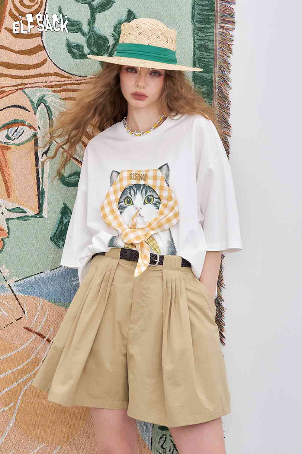 Light Loose Vivid Cat Print Short-Sleeved White T-Shirt