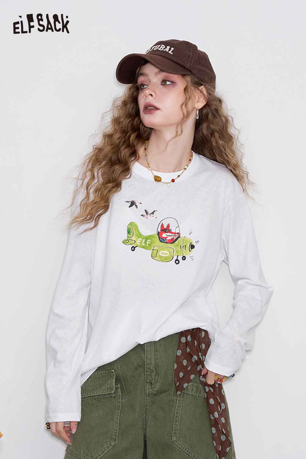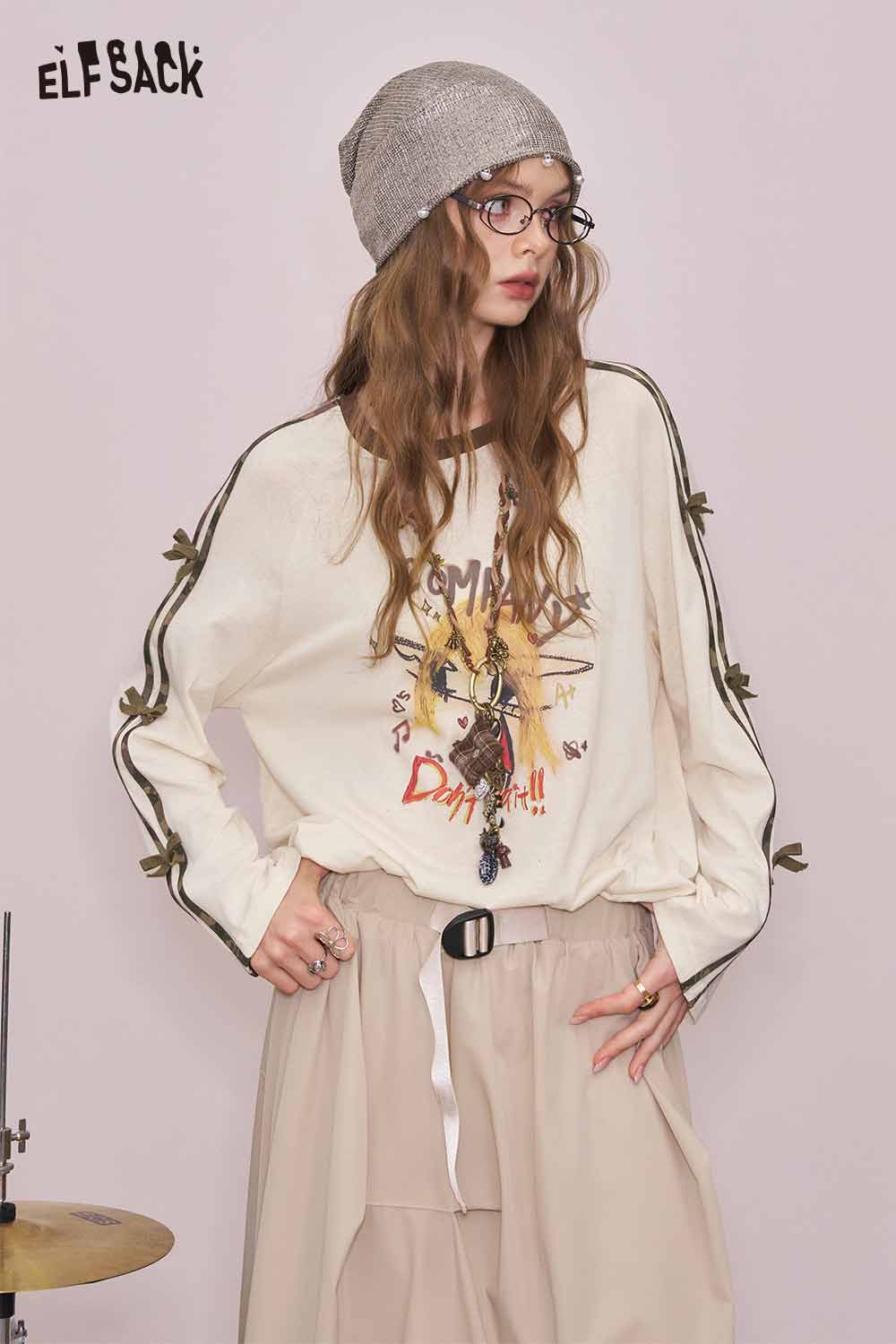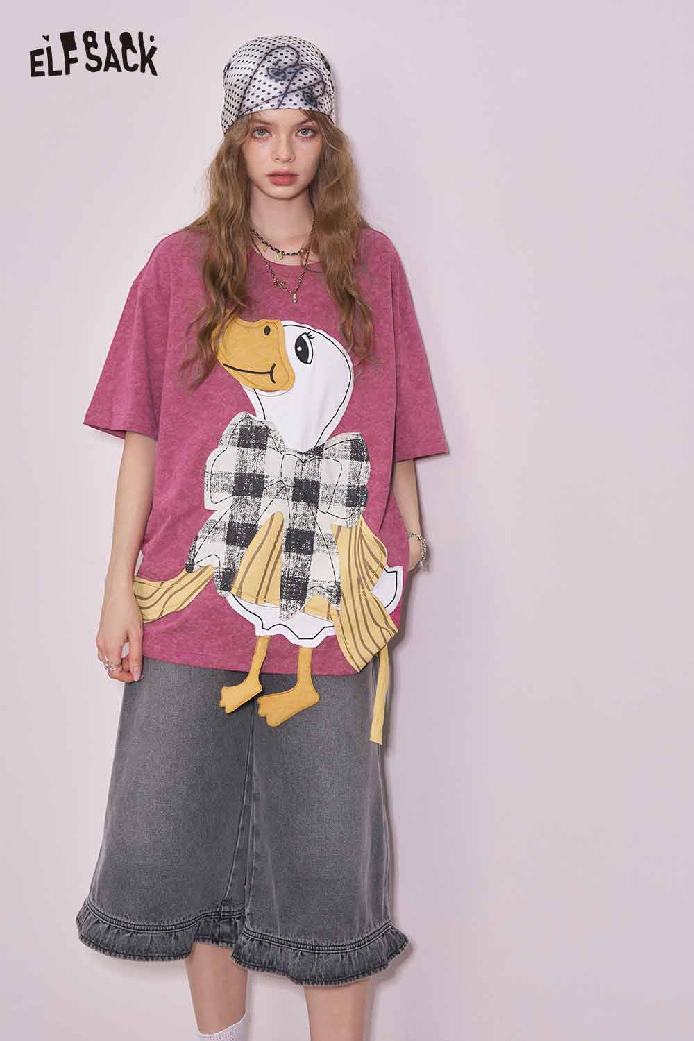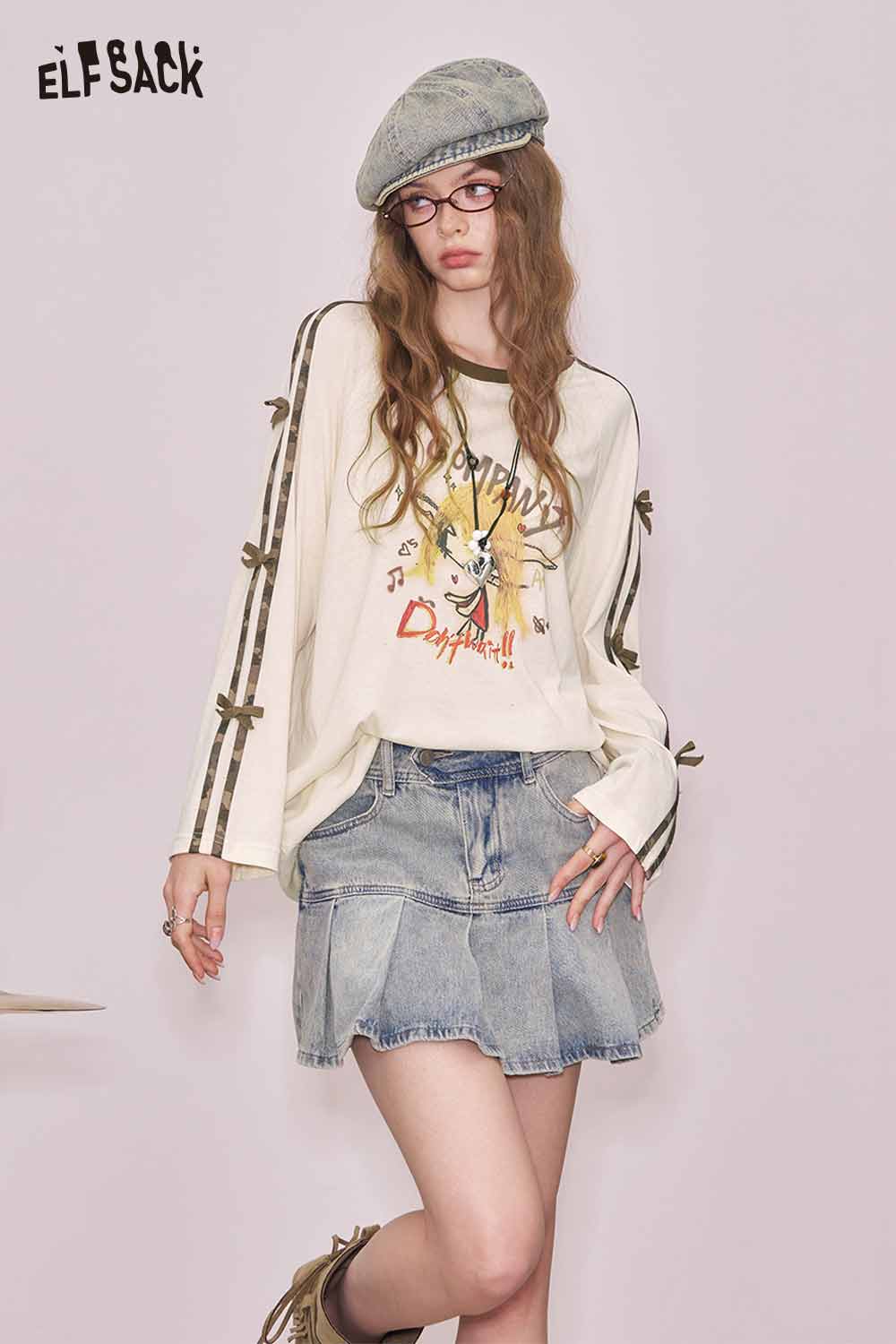 ELFSACK model wearing relaxed fit ruched stripe t-shirt in olive brown with cartoon print and side ruched sleeve