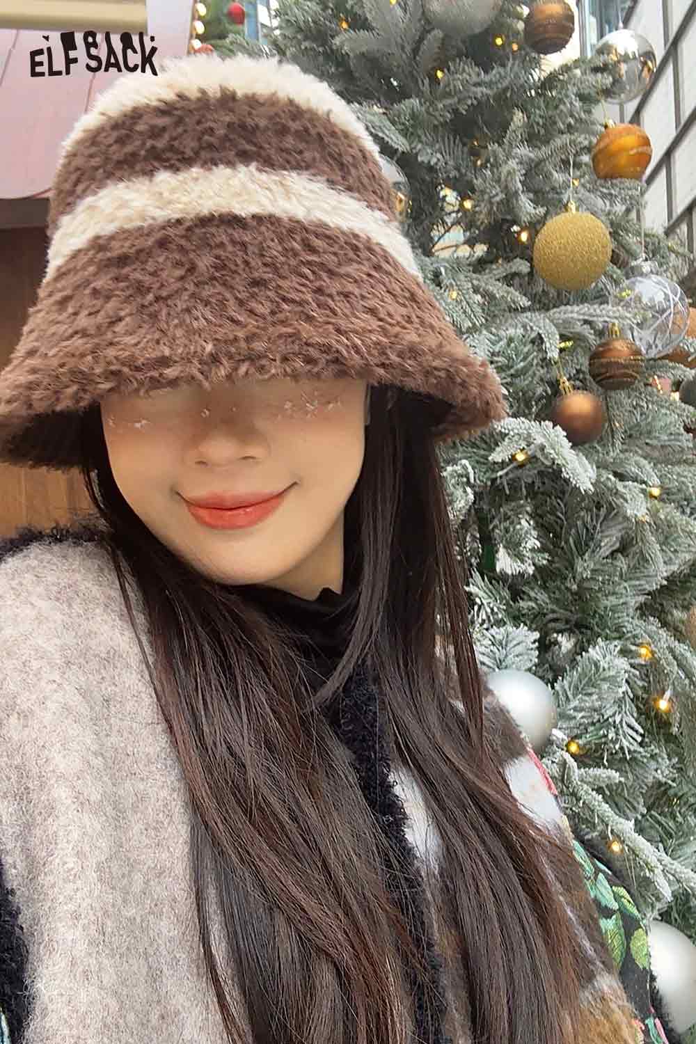 Sweet Striped Color Block Warm Plush Bucket Hat