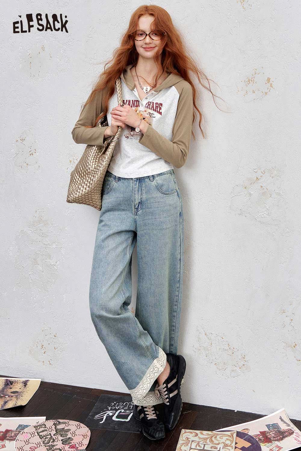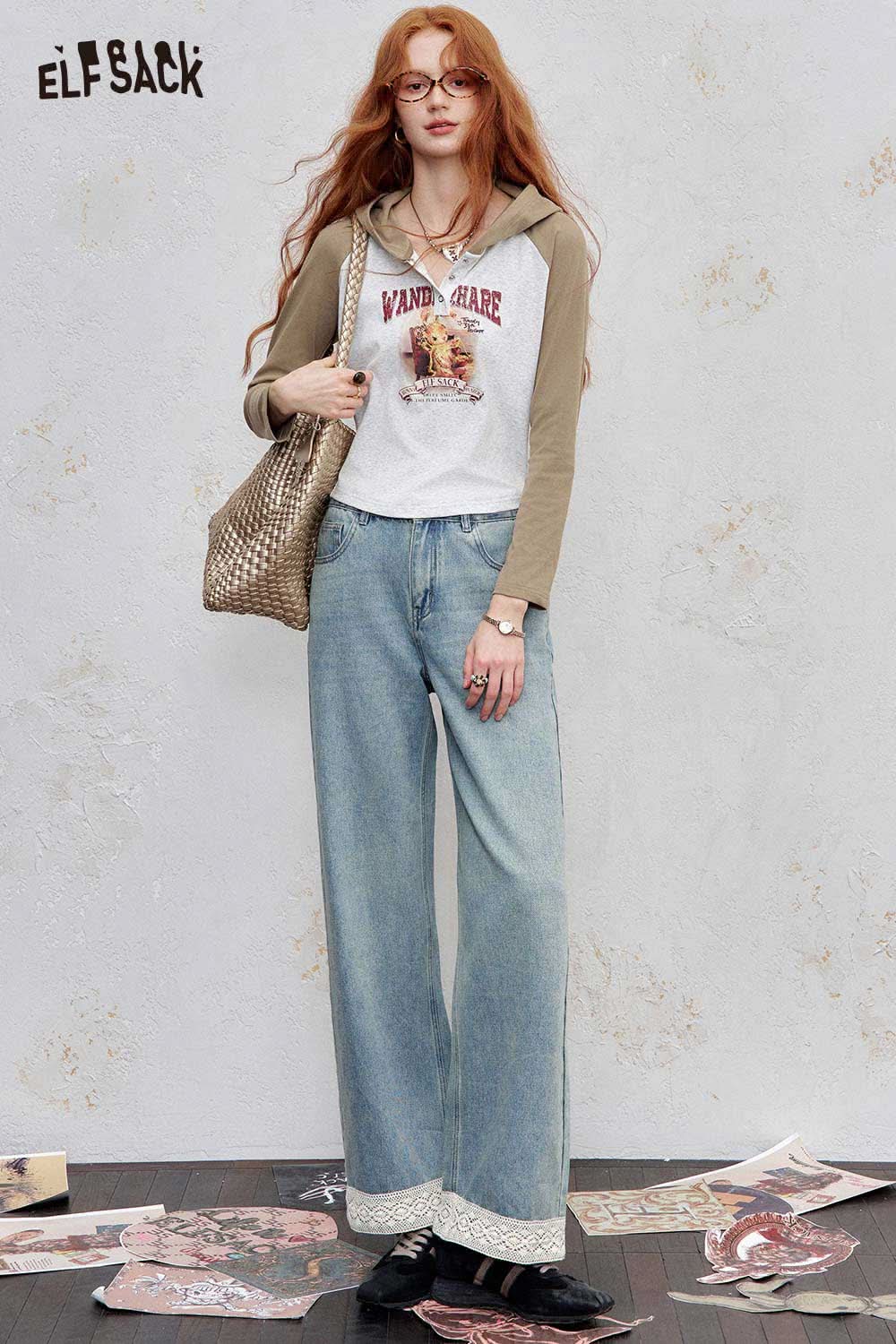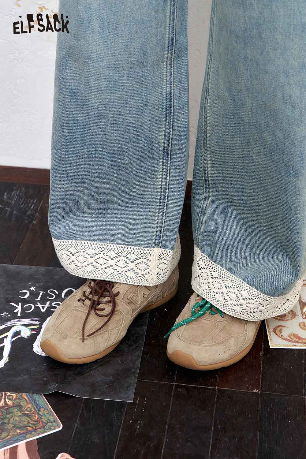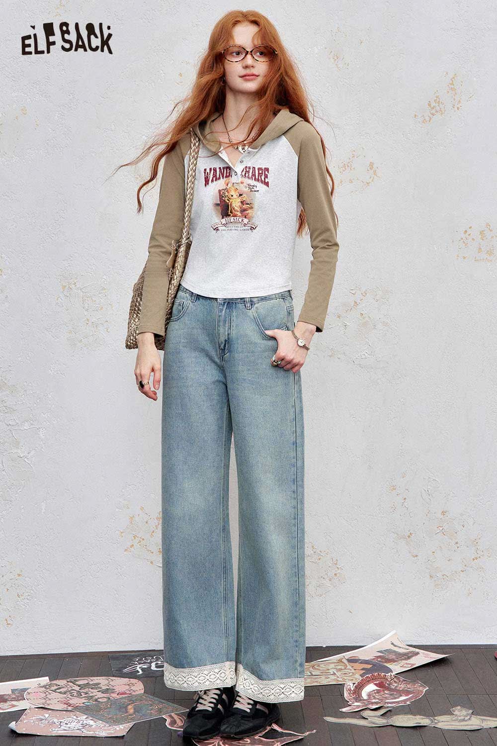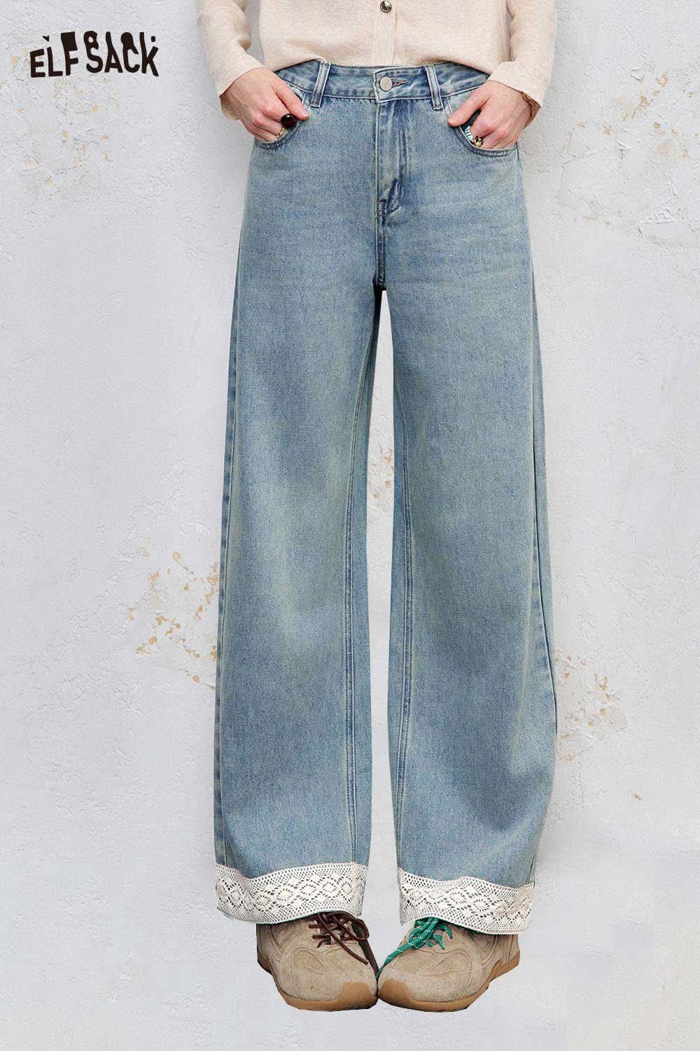Denim Wide-Leg Retro Patchwork Light Long Jeans