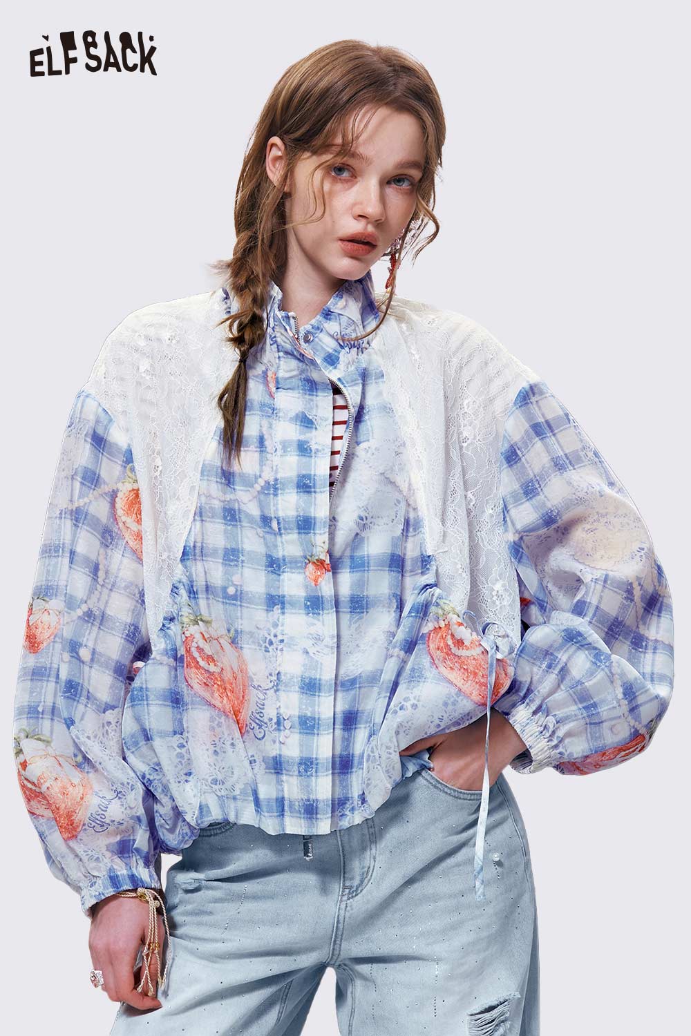 Chaqueta con Parches de Encaje a Cuadros y Fresas