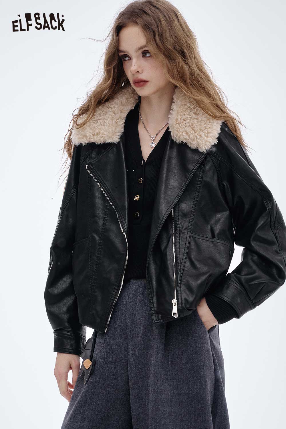 ELFSACK color block faux fur bomber jacket in brown with stylish detailing and oversized fit