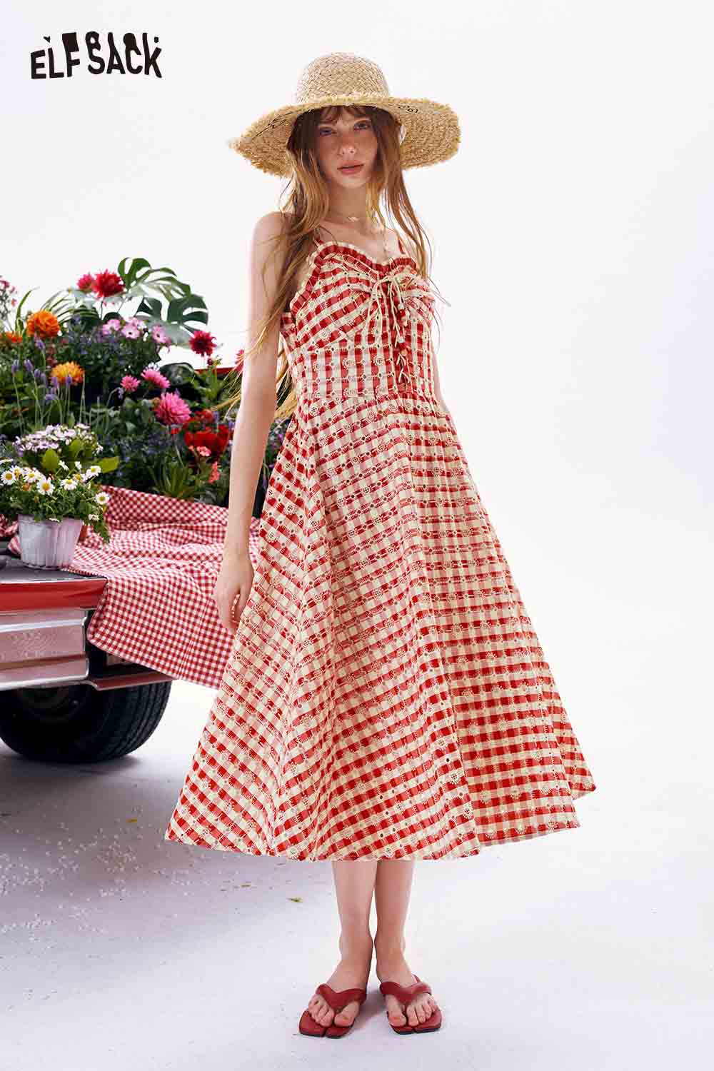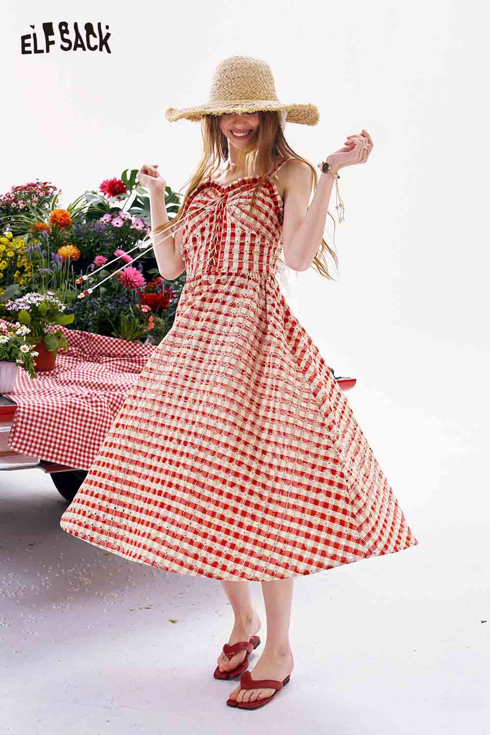 Vestido midi acampanado con cuentas de guinga roja y lazo