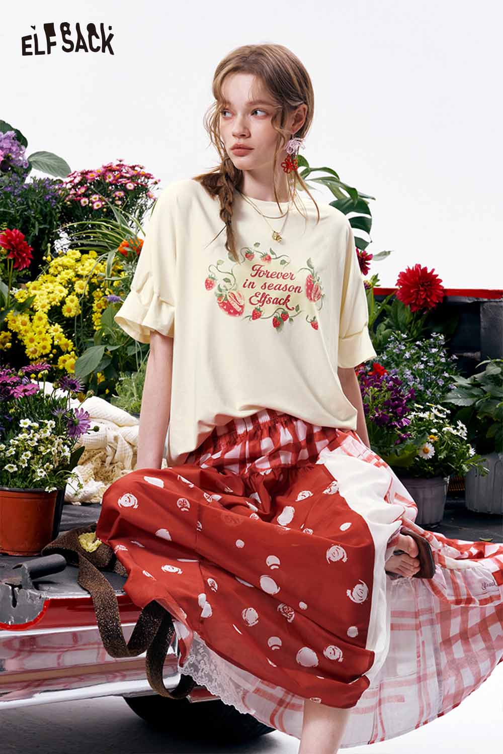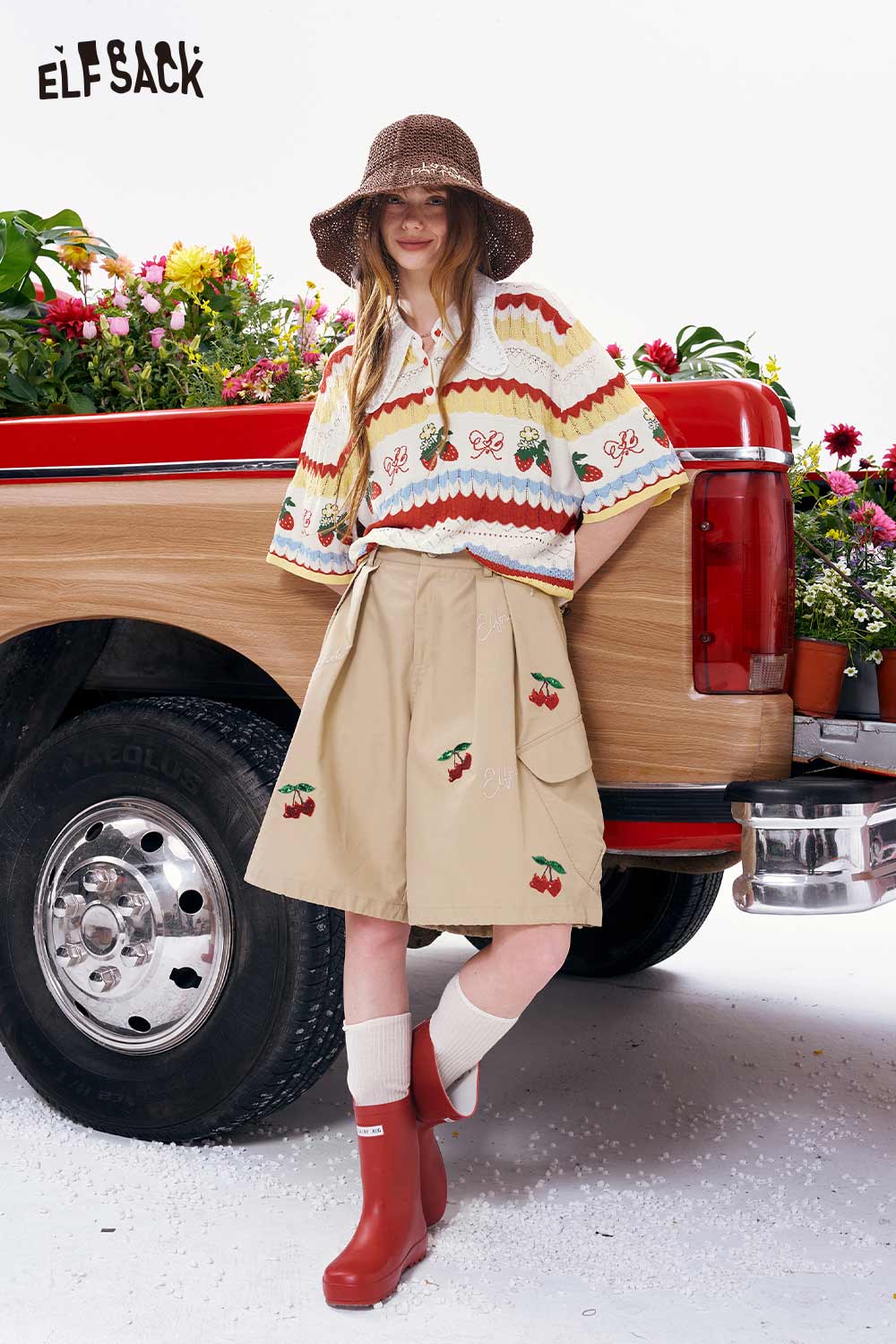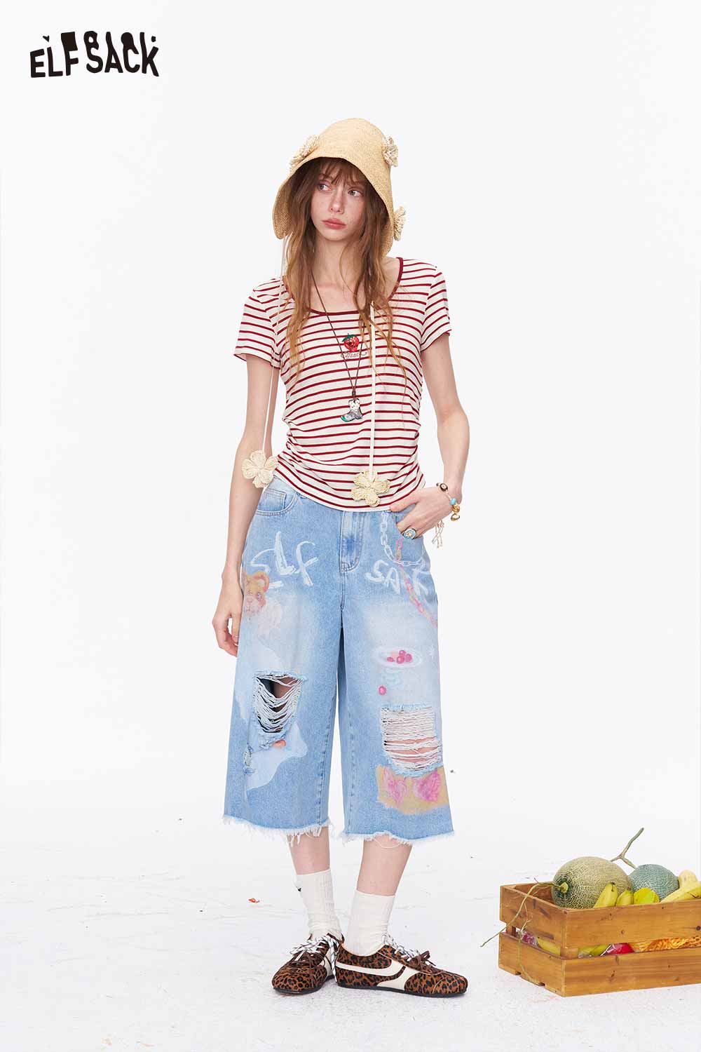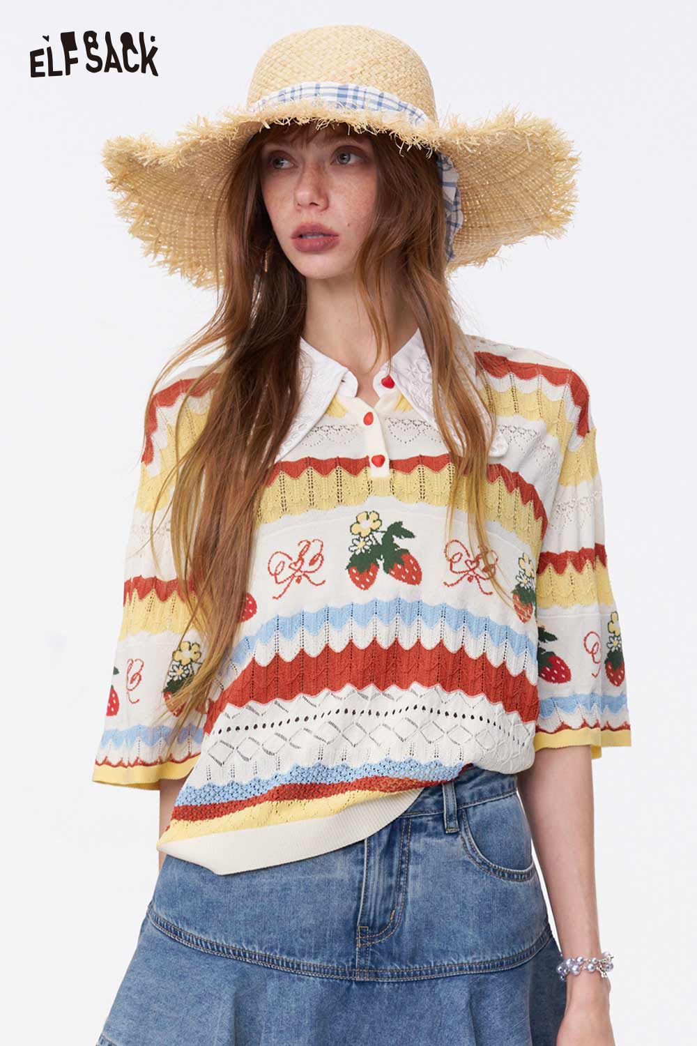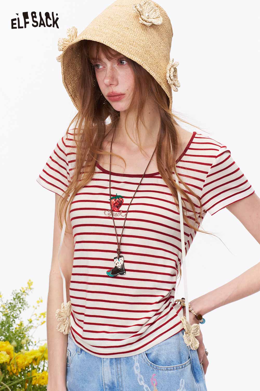 Camiseta de cuello cuadrado con fresas bordadas y rayas rojas