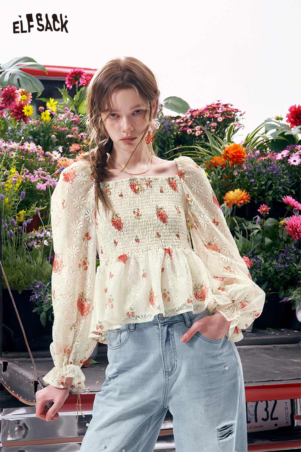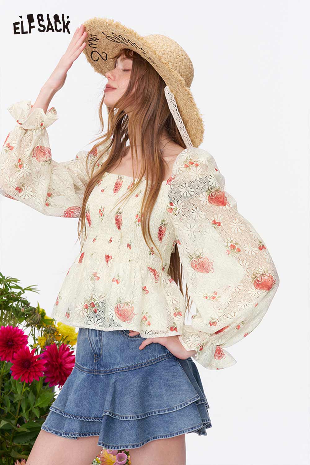 Blusa con estampado de fresas, fruncido y lazo en la espalda