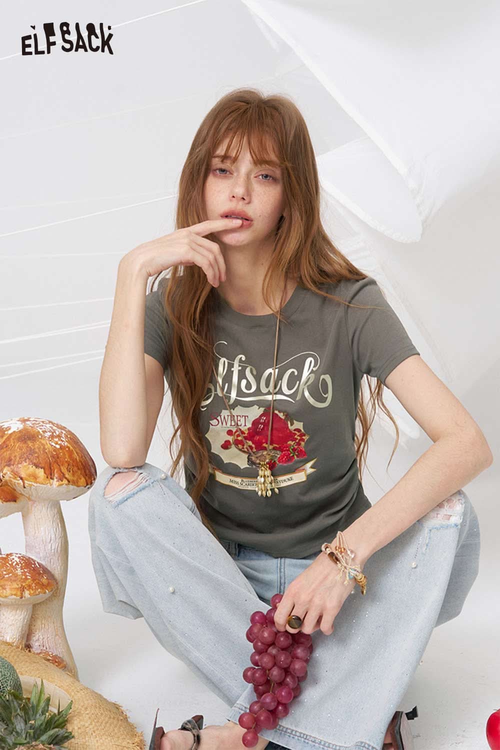 Camiseta con cuello de pico y estampado de lazo con pedrería