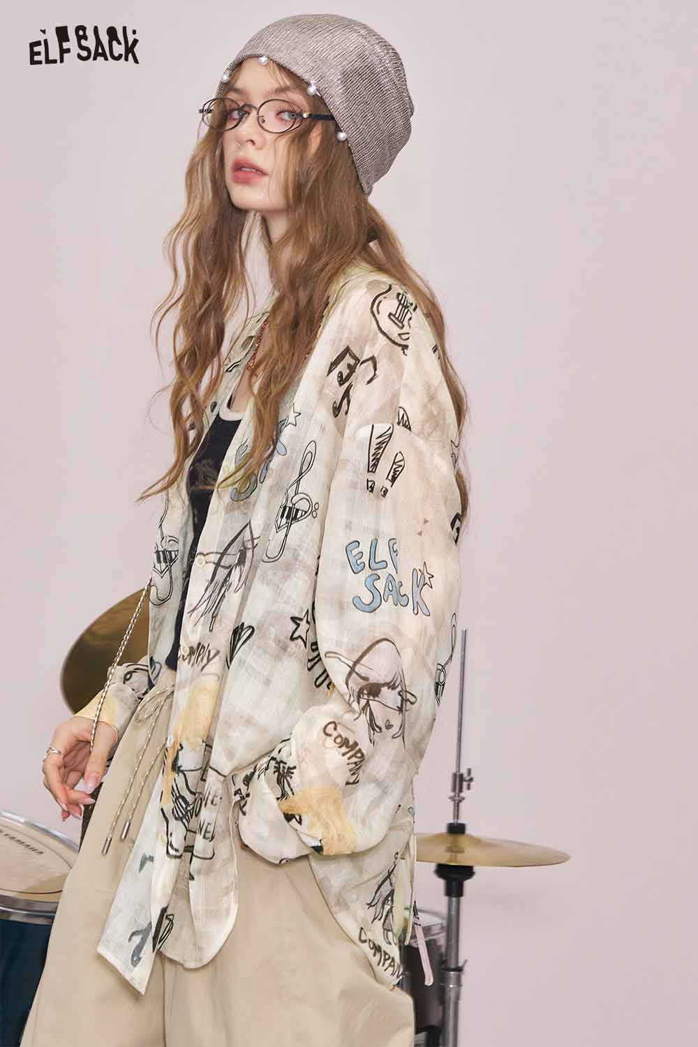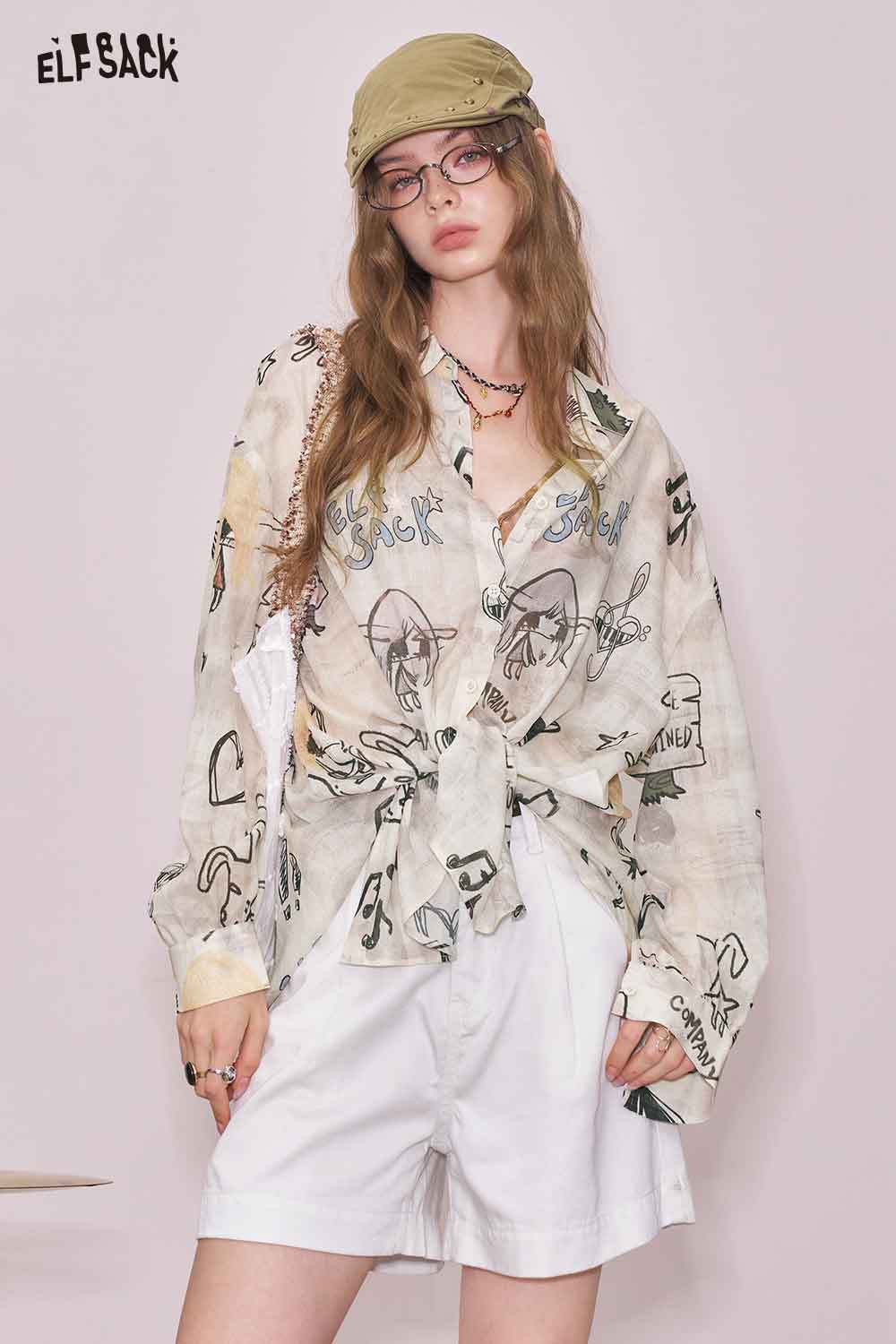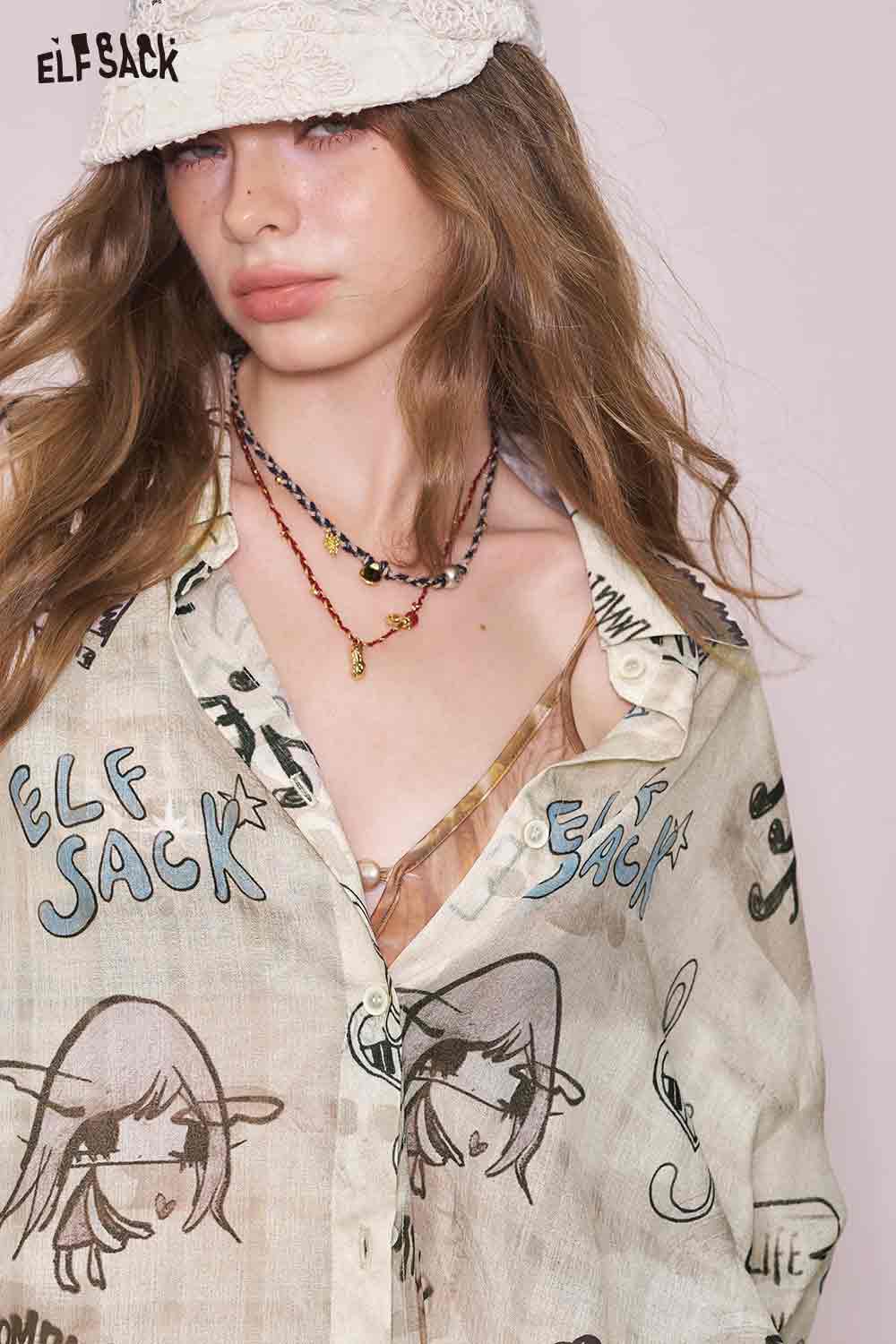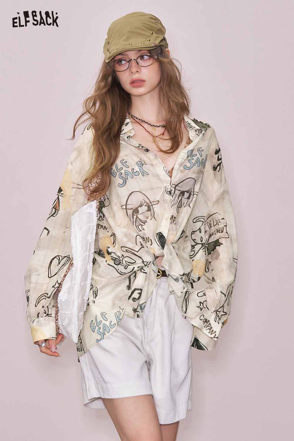 Artsy All-Over Print & Lace Detail Loose Fit Long Sleeve Blouse