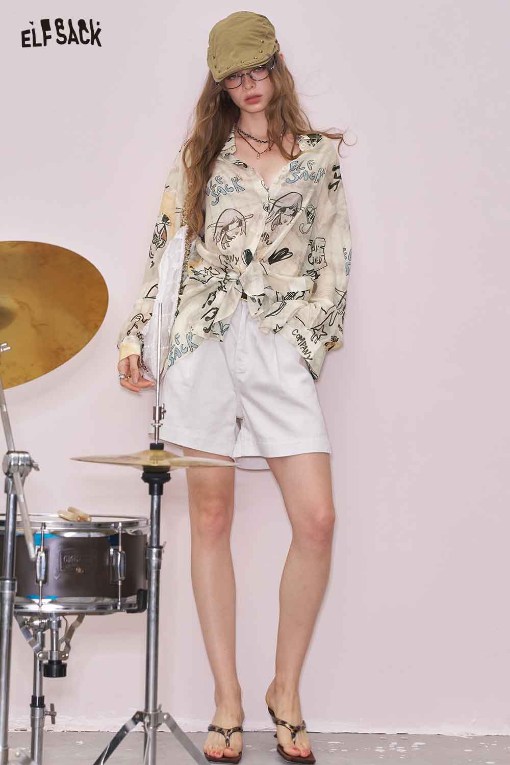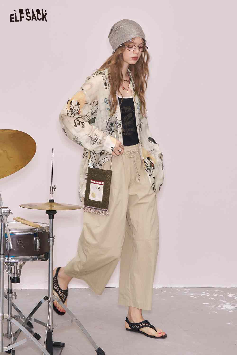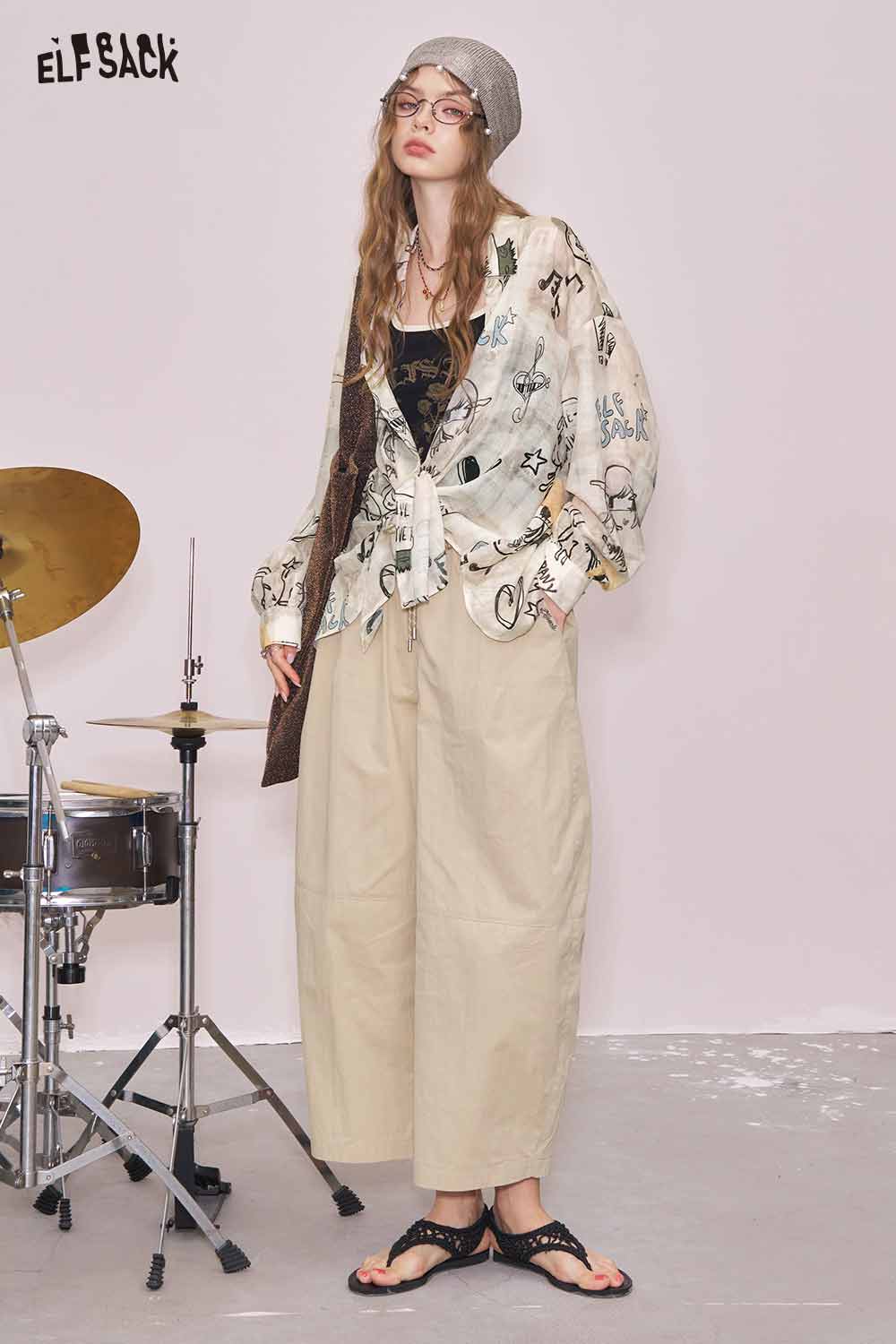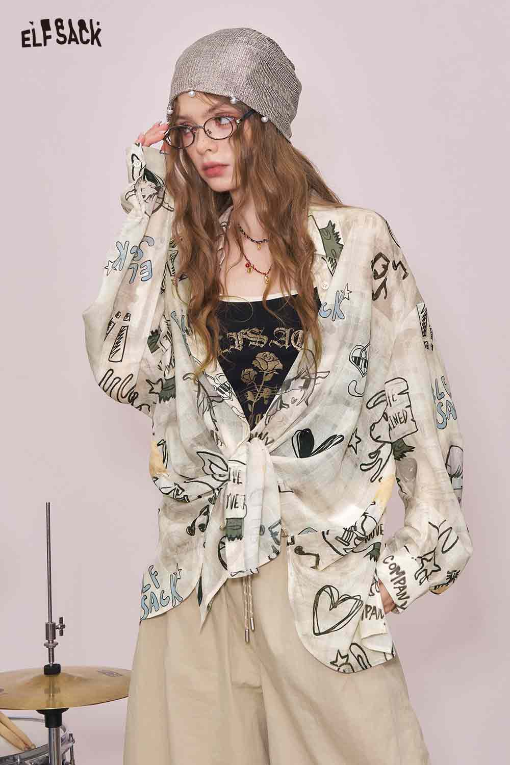Artsy All-Over Print & Lace Detail Loose Fit Long Sleeve Blouse