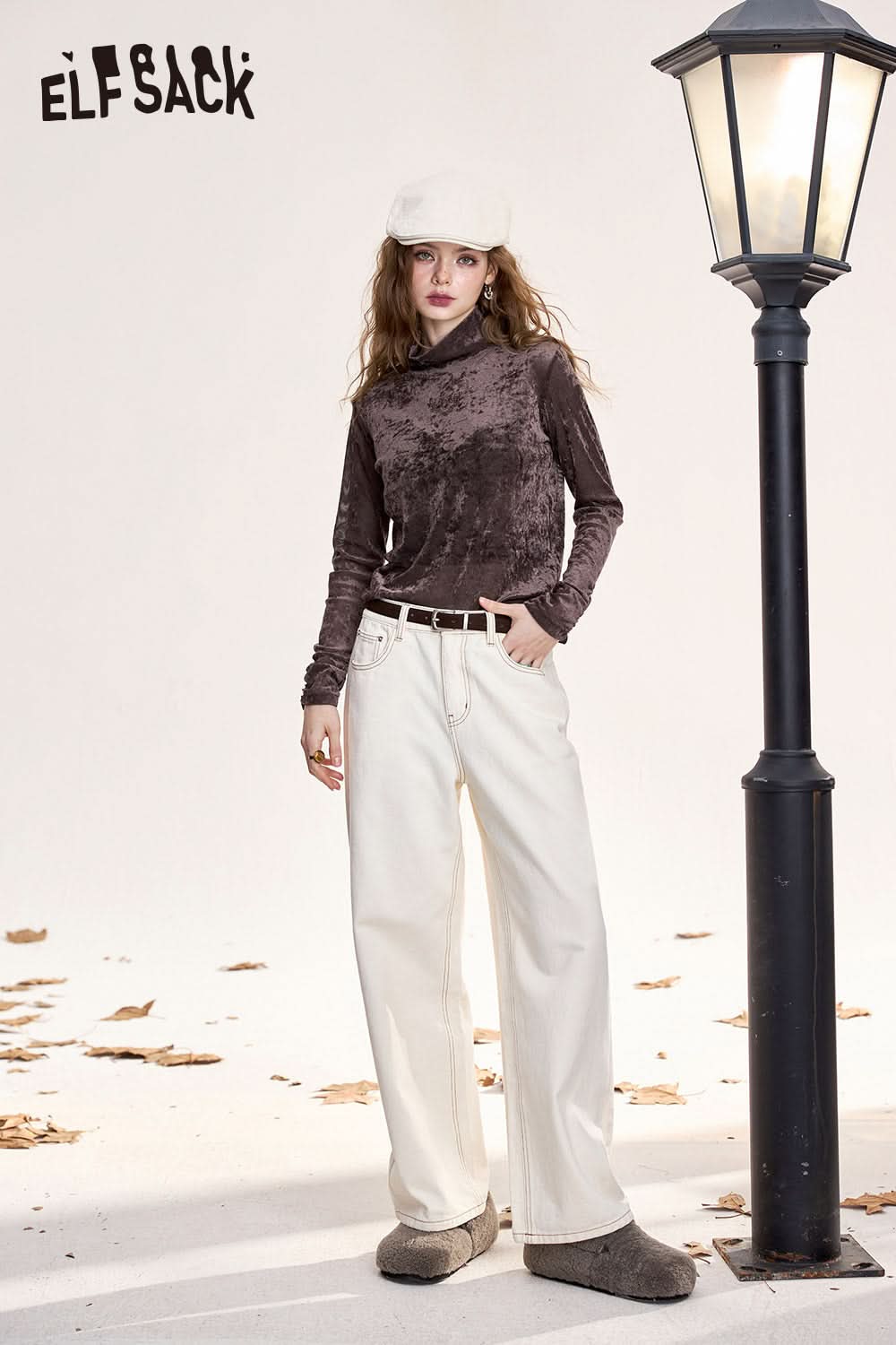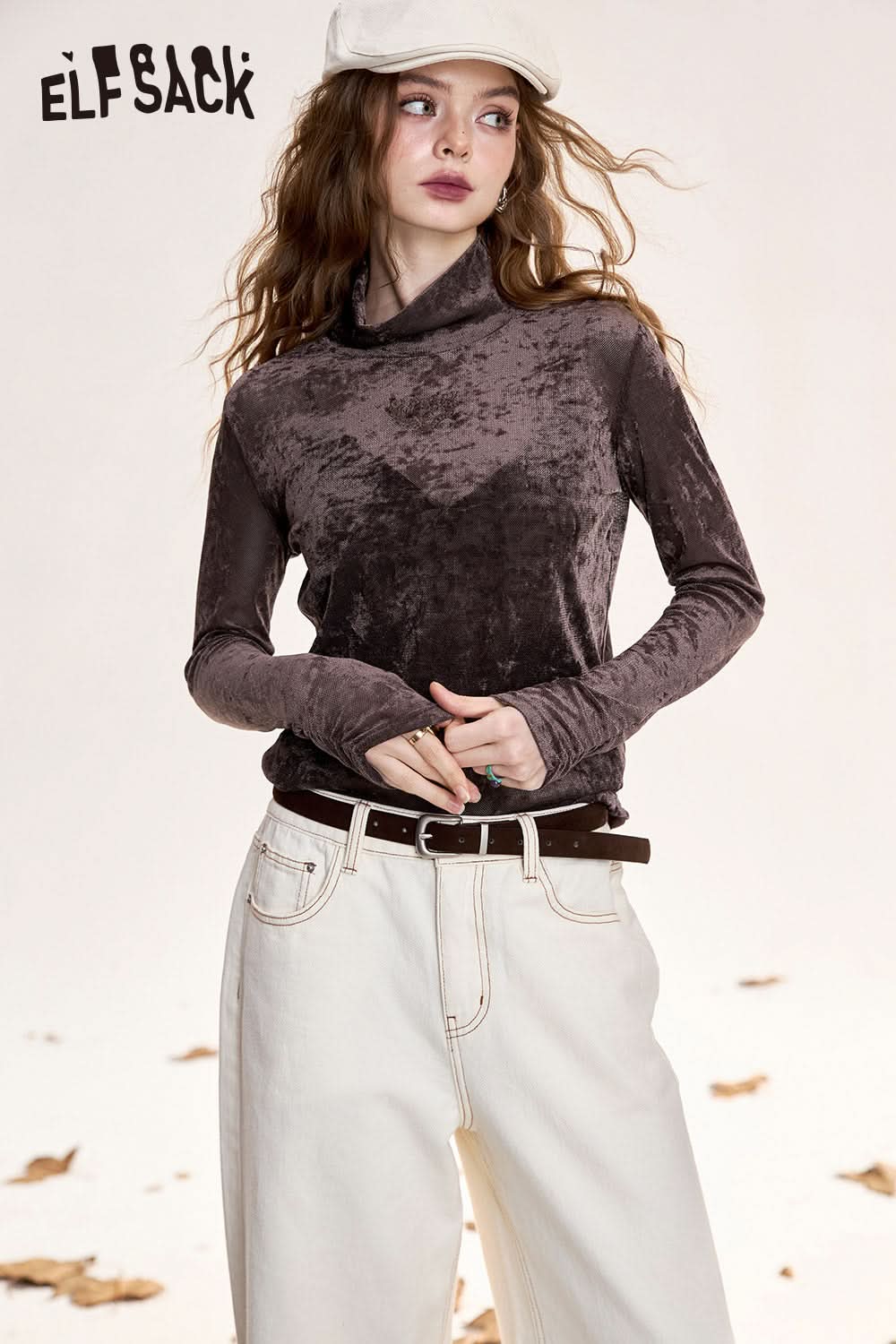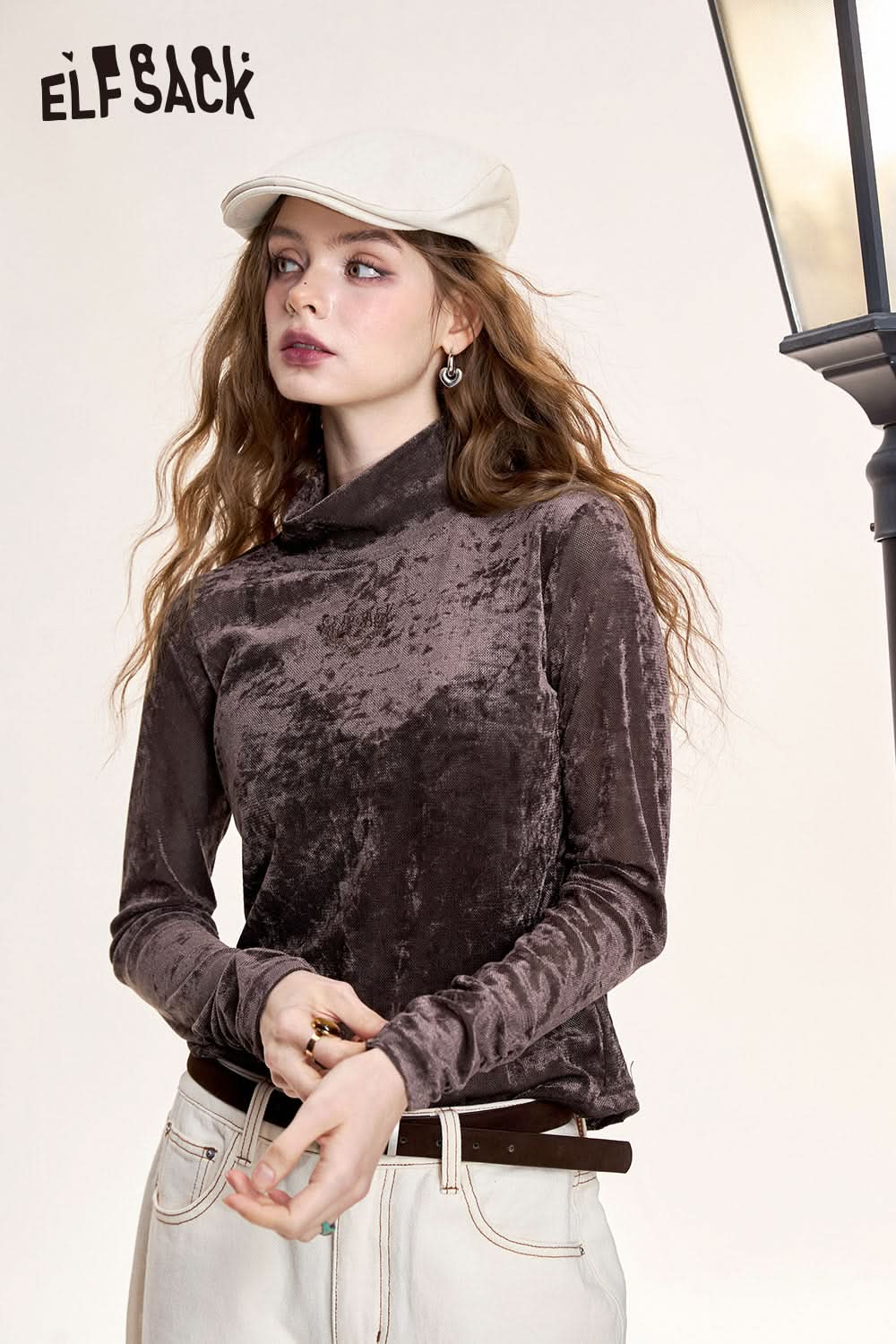 Brown velvet high collar long sleeve T-shirt retro elegant women
