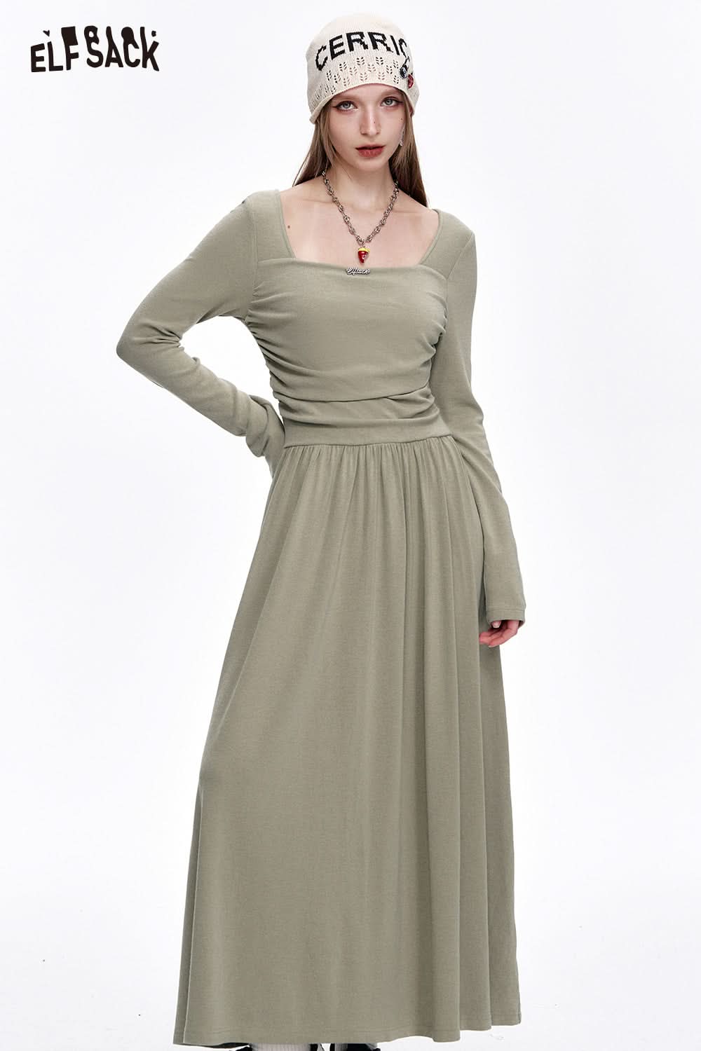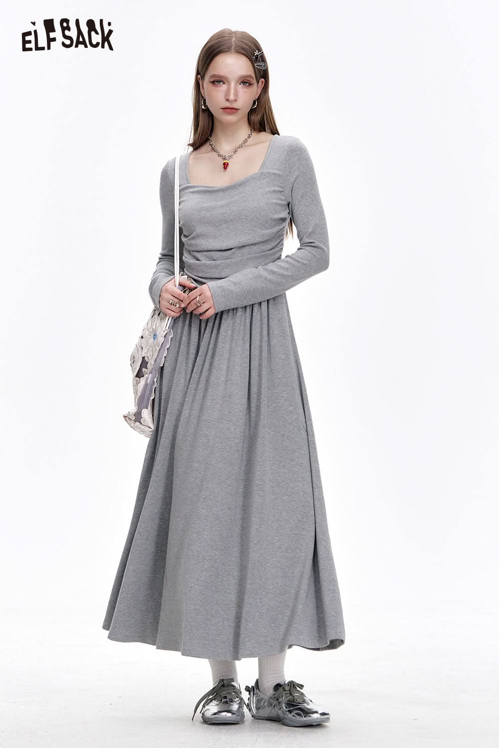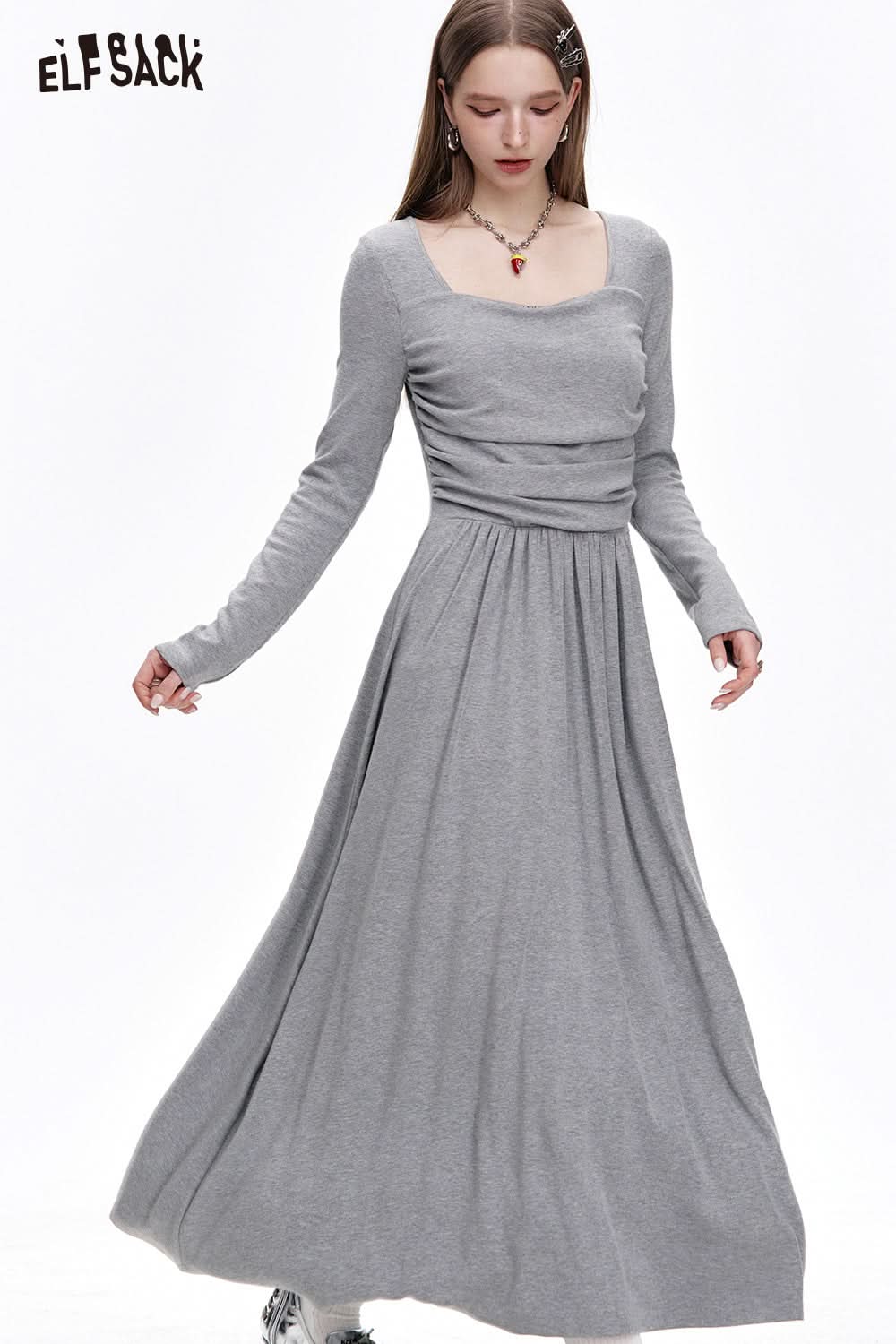 Elegant Grey Pleated Square Neck Long Sleeve Slim Fit Dress Women