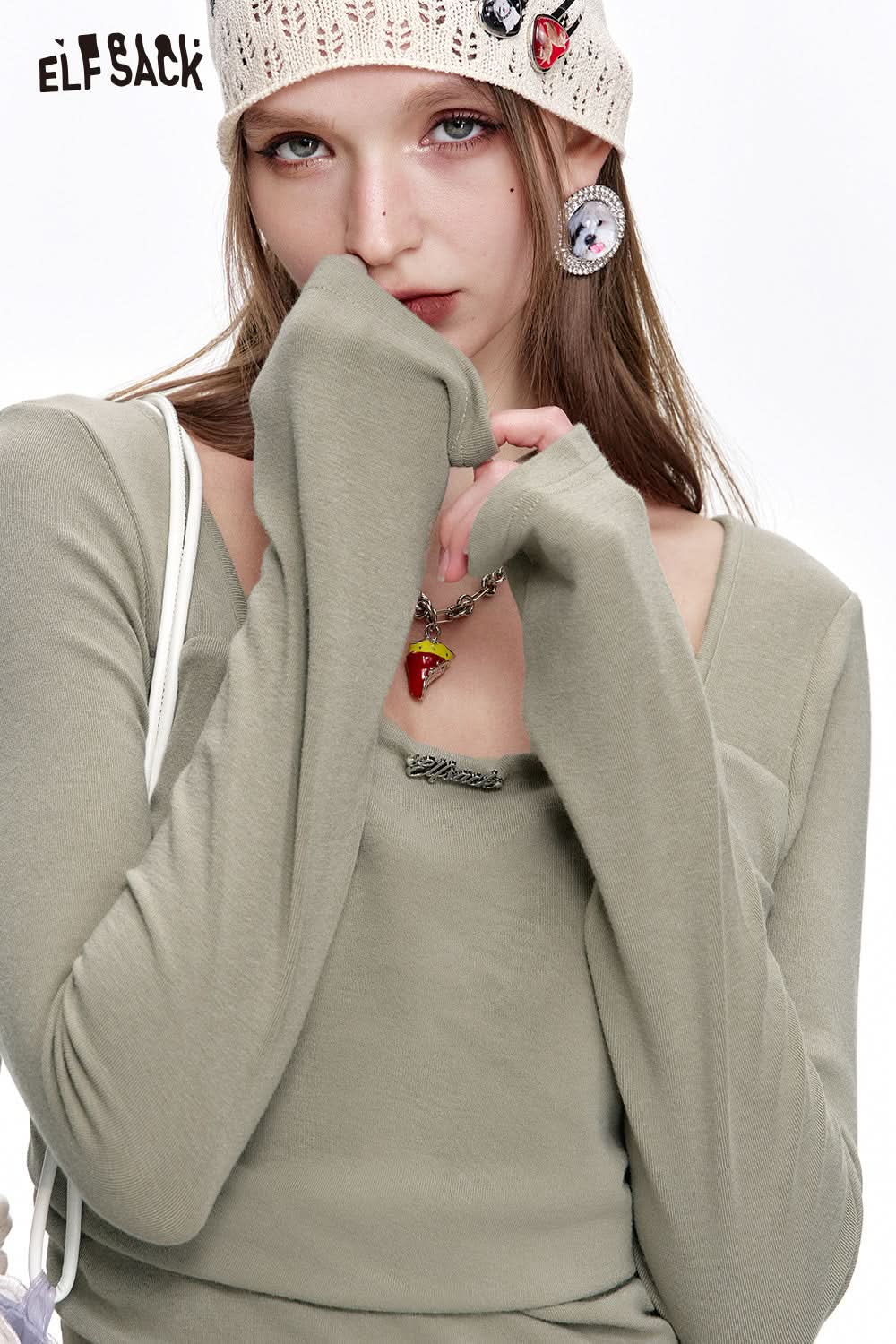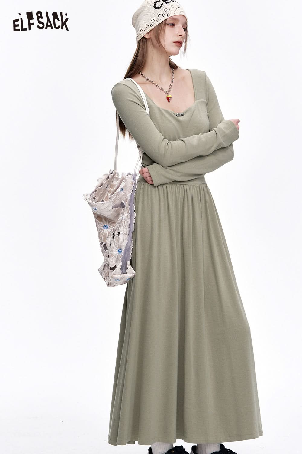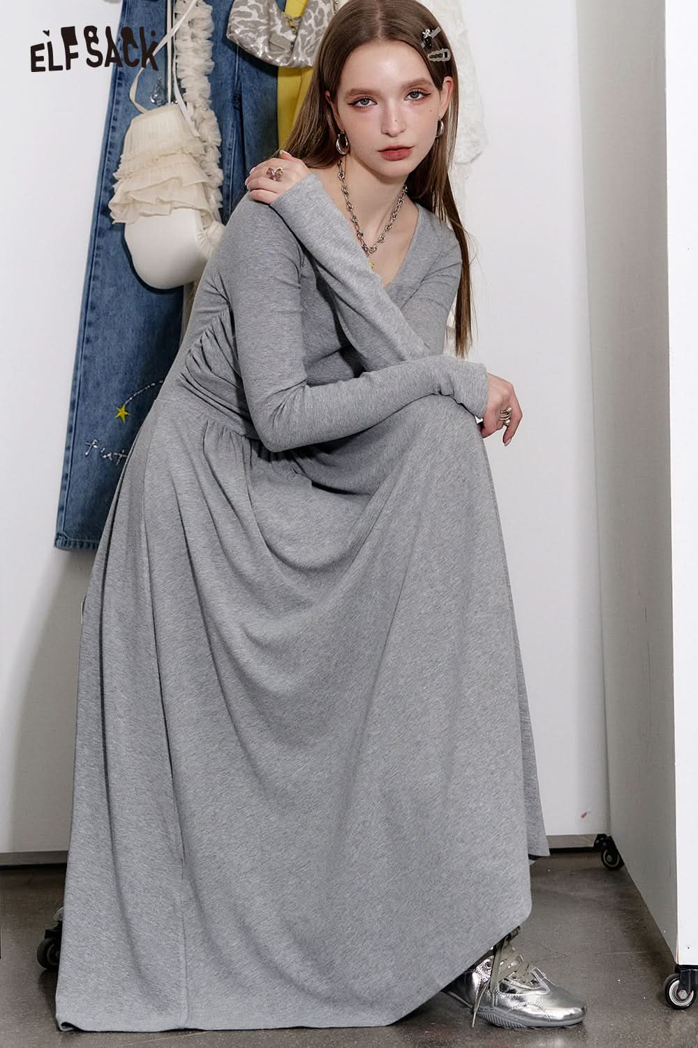 Elegant Grey Pleated Square Neck Long Sleeve Slim Fit Dress Women