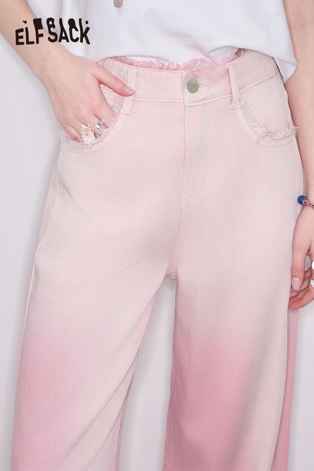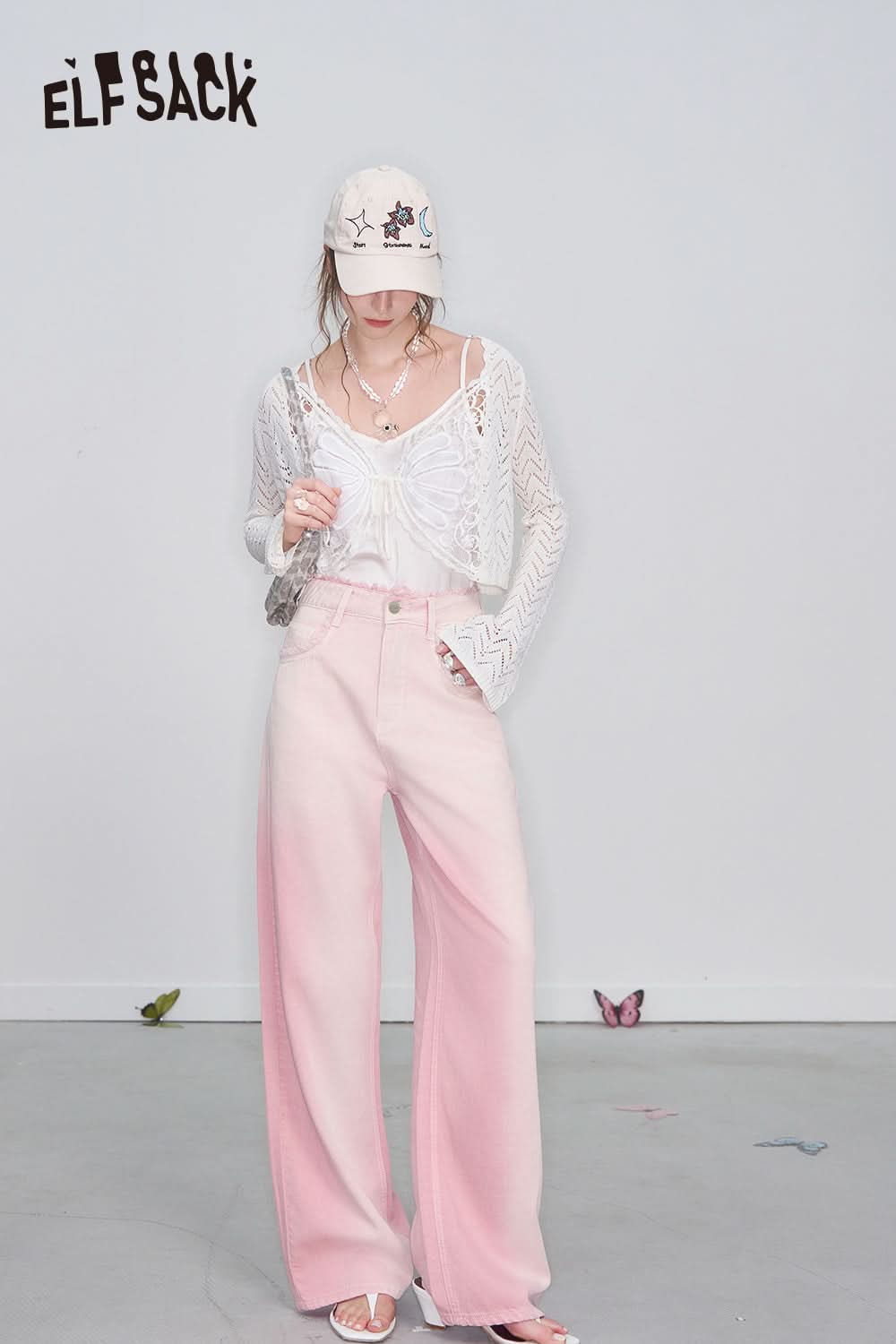 Y2K Raw Edge High Waist Pink Gradient Jeans Women Sweet Wide Leg Pants