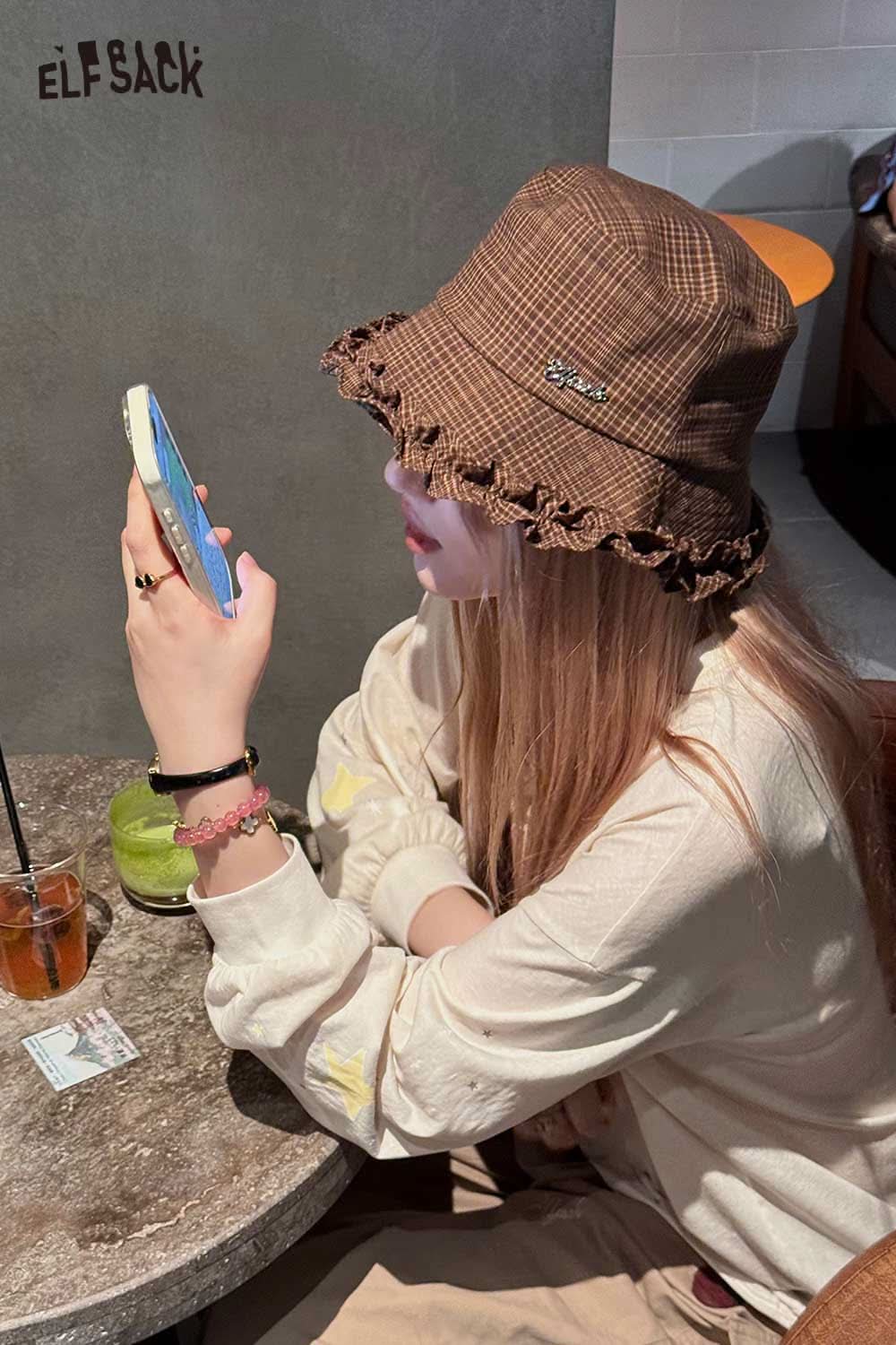 Cotton Twill Lace Trim Plaid Pattern Adjustable Strap Bucket Hat