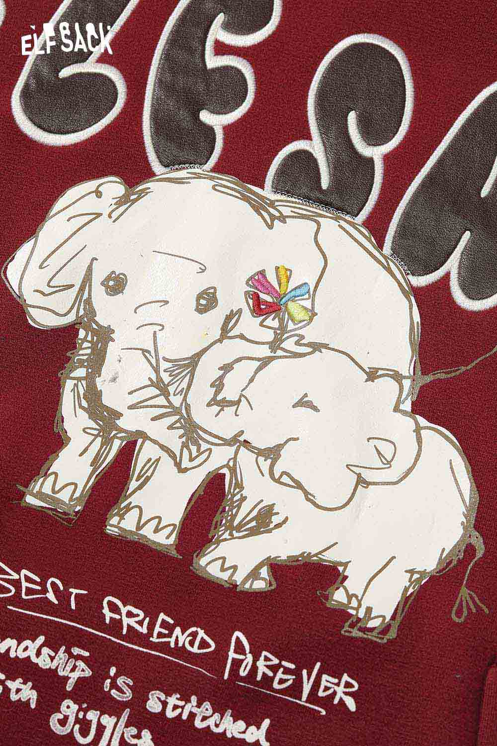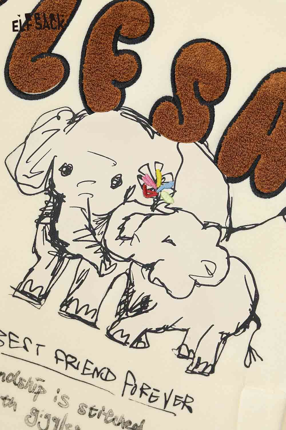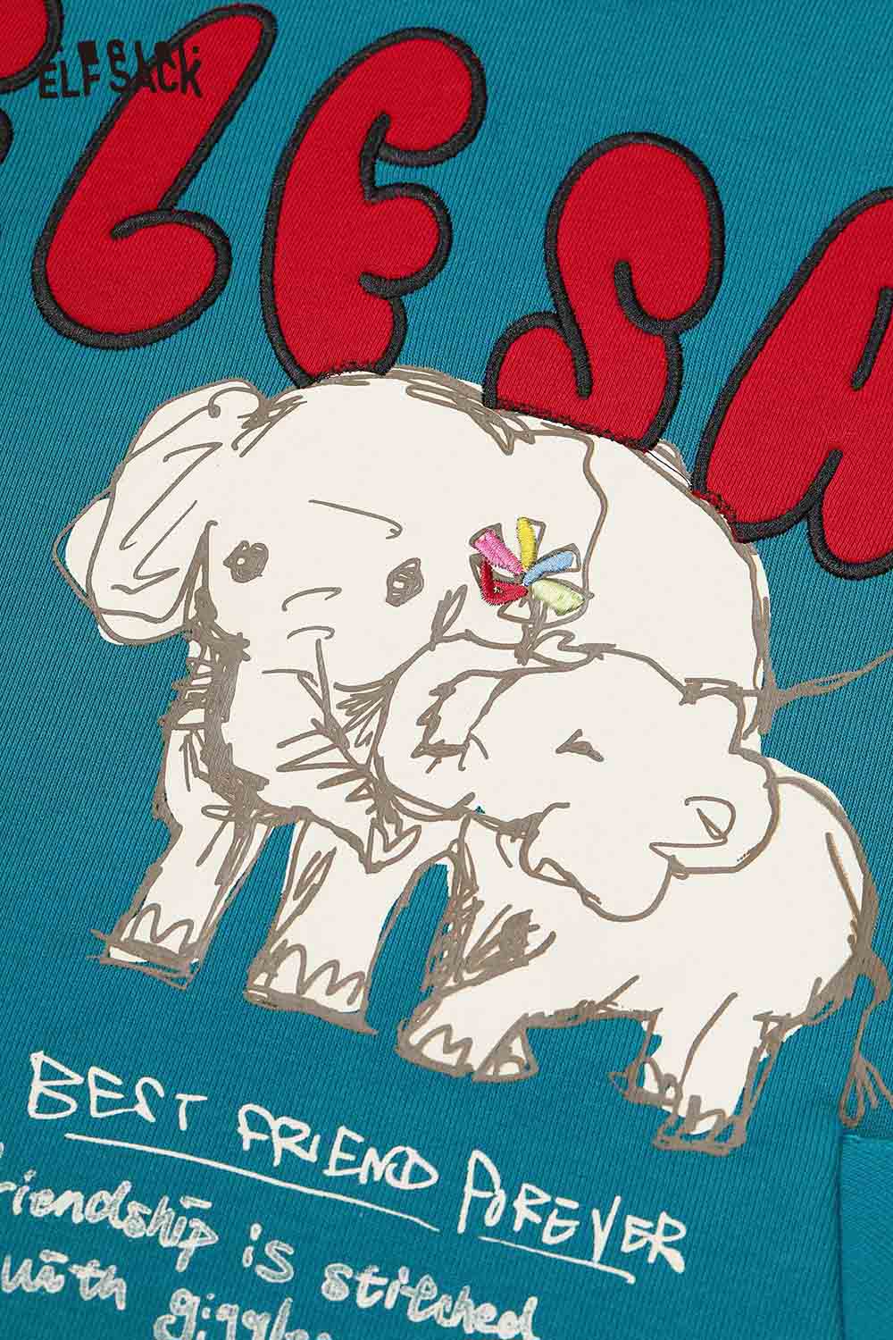 Soft Cartoon Elephant Print Loose Fit Hooded Sweatshirt