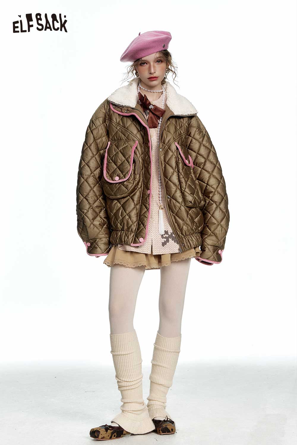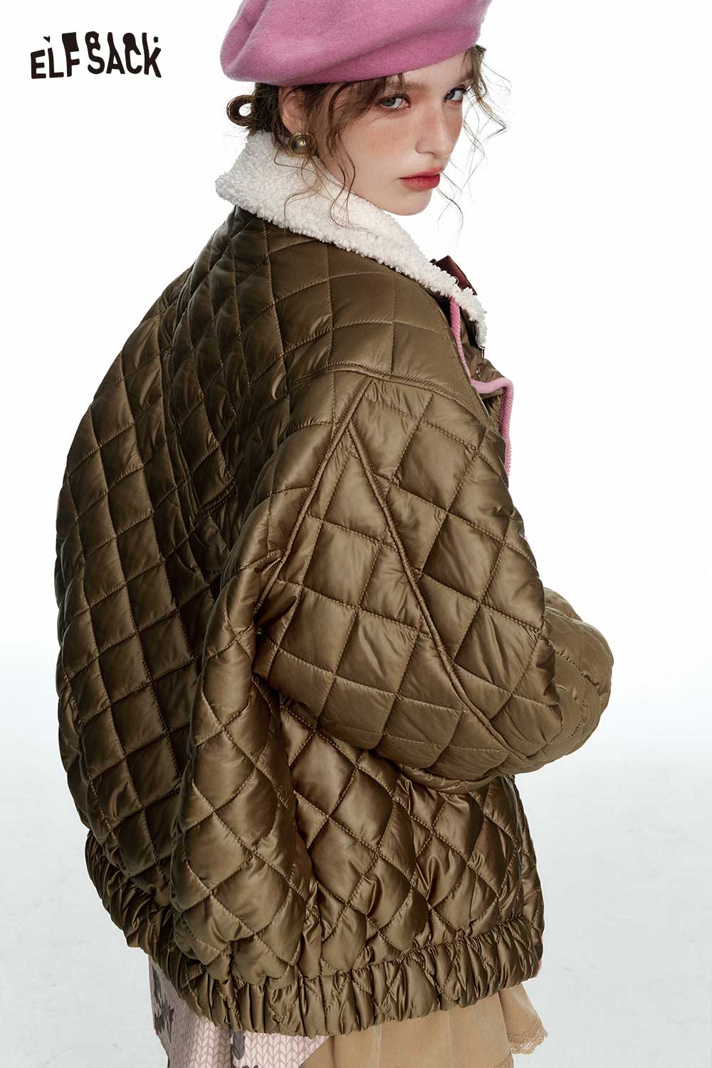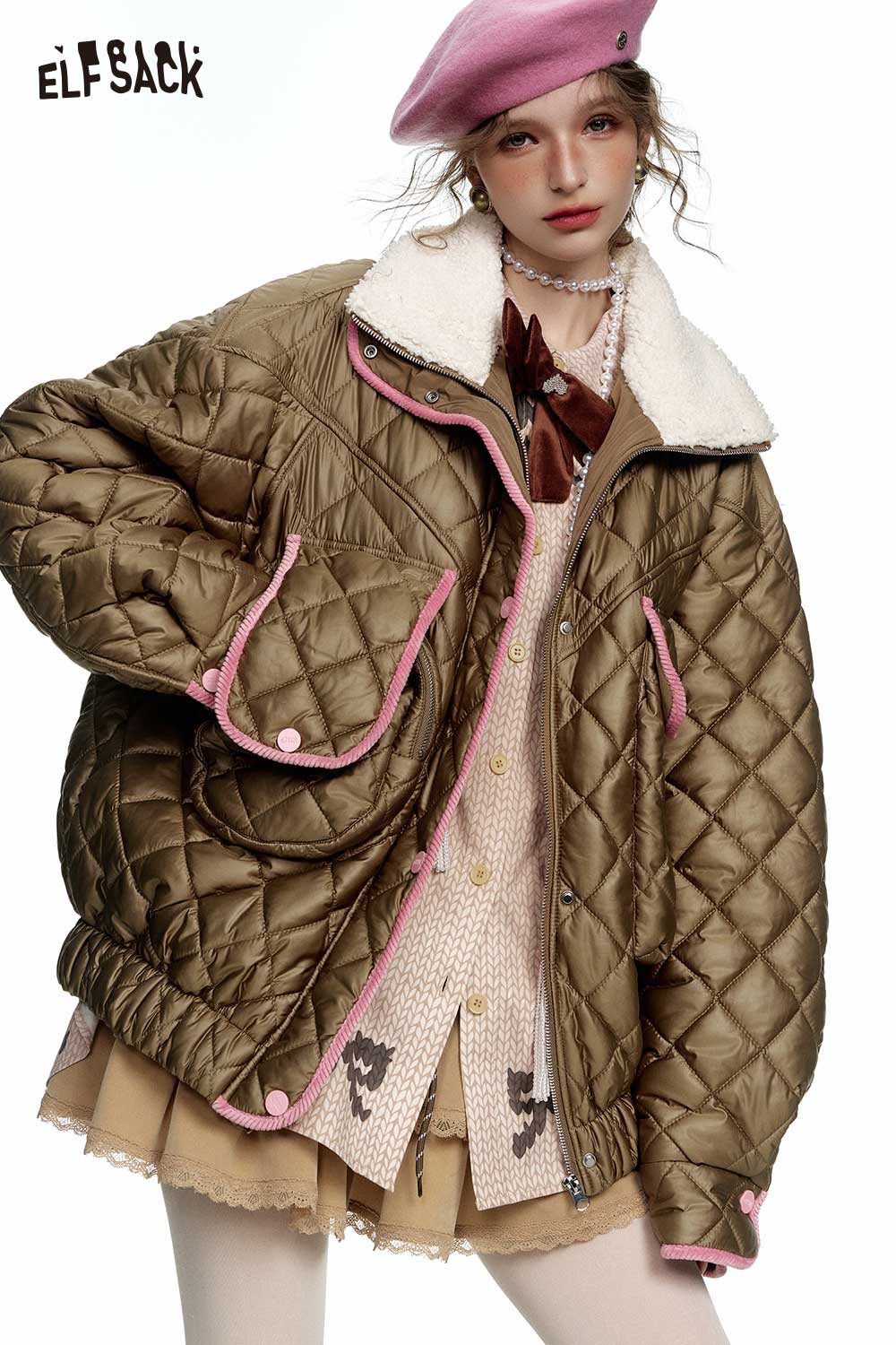 Soft Color Block Deconstructed Quilted Faux Fur Lapel Cotton Coat