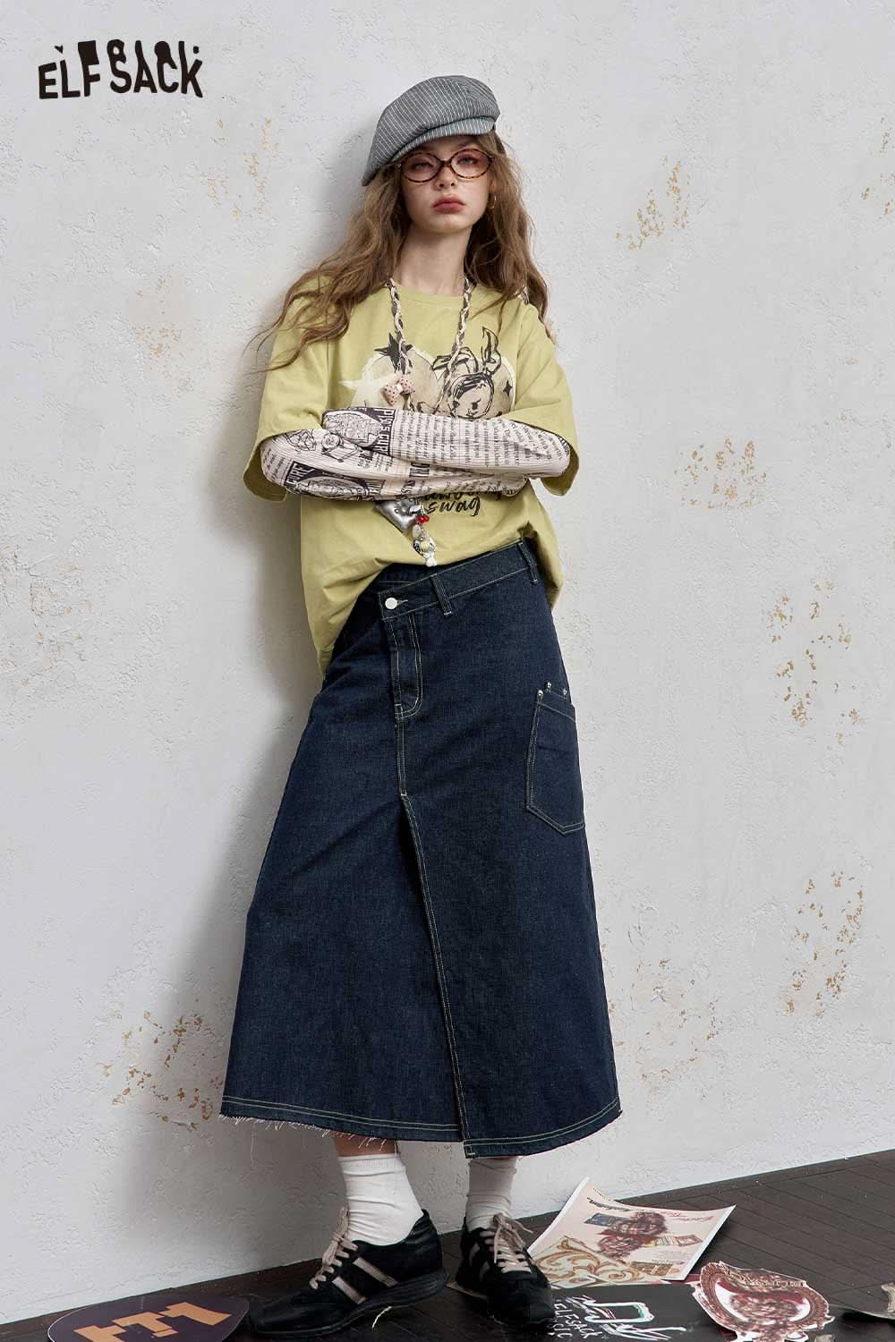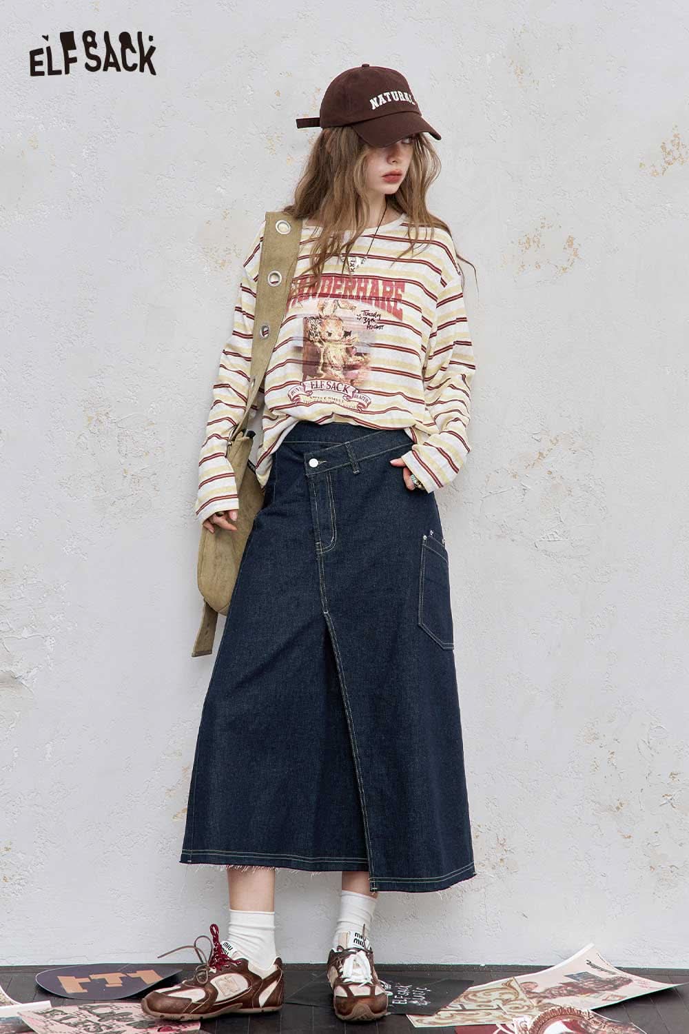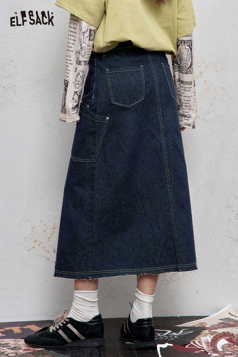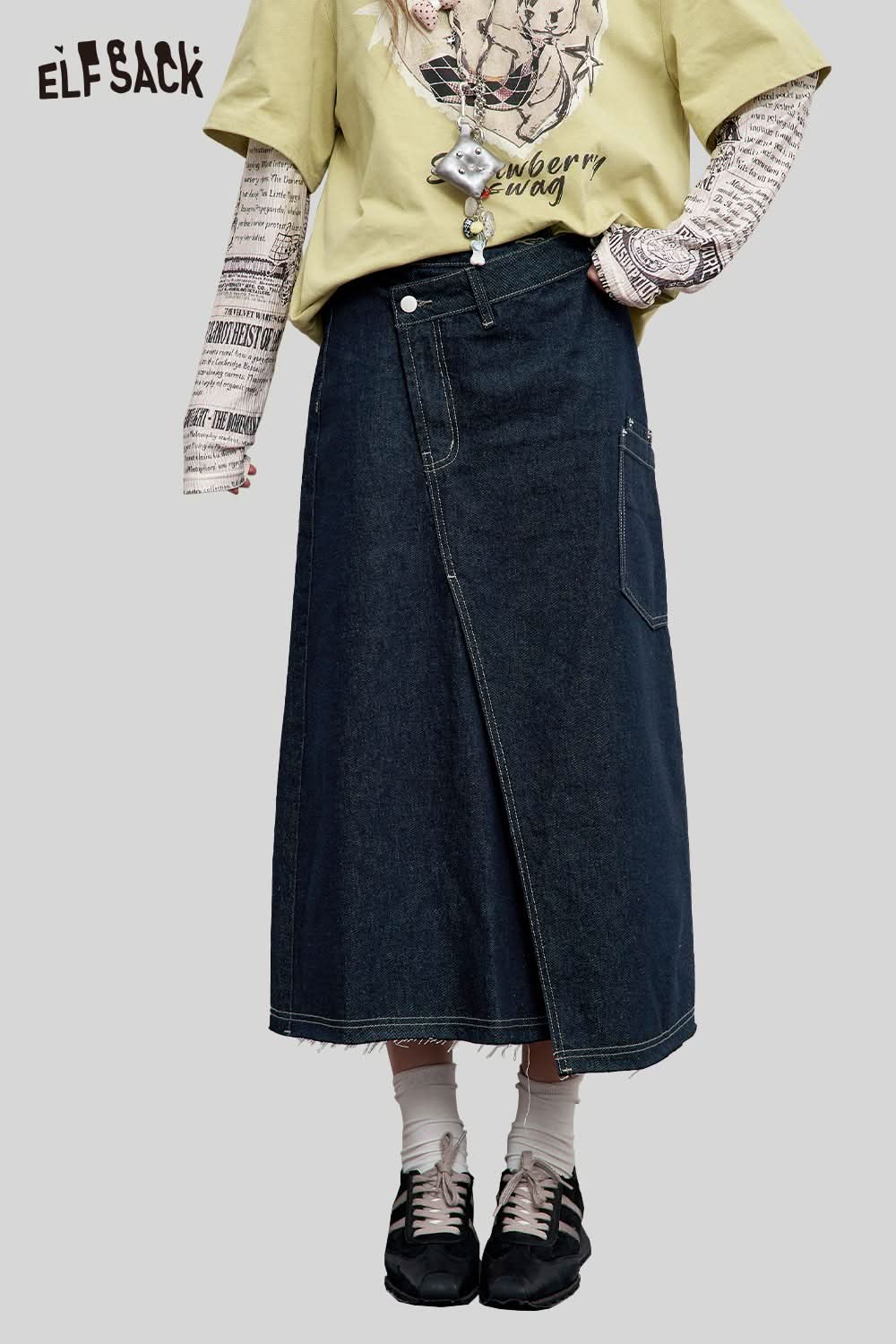 Stretch Denim Bias Cut Asymmetrical Hem Maxi Skirt
