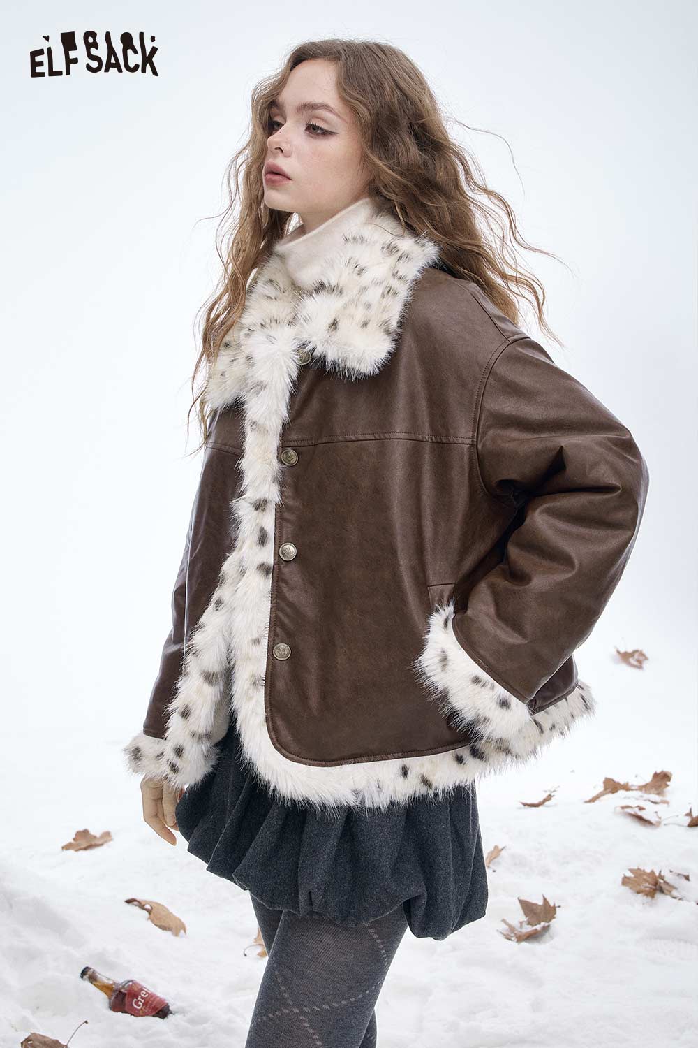 Soft Premium Faux Leather Mixed Color Plush Trim Mixed Color Plush Lapel Jacket
