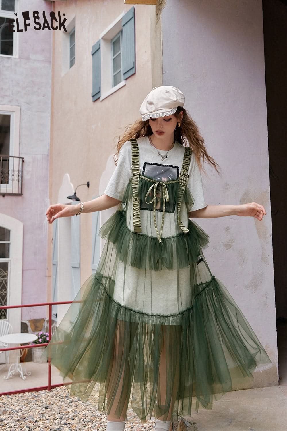Mesh Splicing Printed T Shirt Long Dress Two Pieces