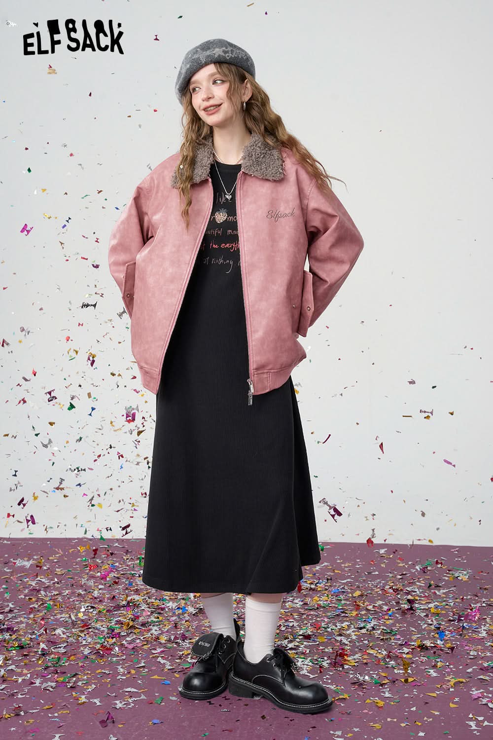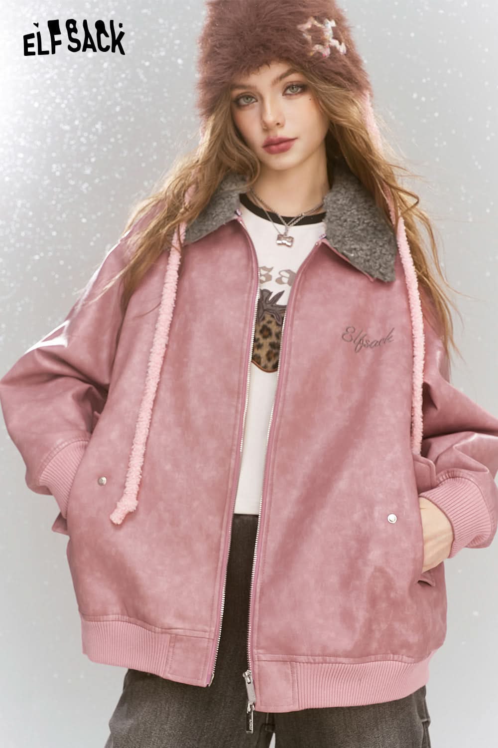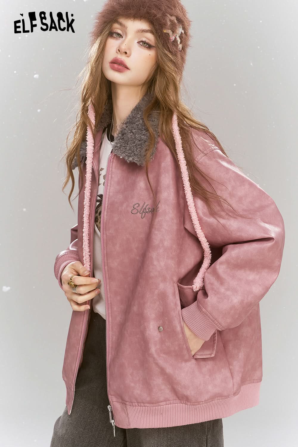 Sweet and cool pink PU warm jacket faux fur collar contrast color leather jacket