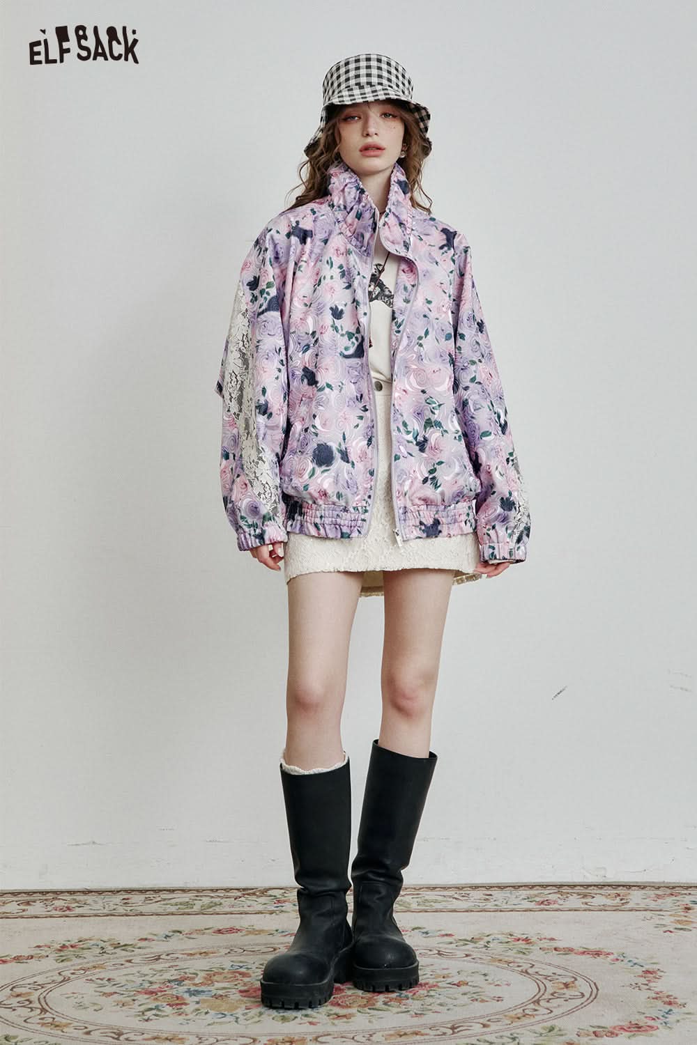 ELFSACK Stand collar all over print flowers lace patchwork jacket women casual purple zipper long sleeve tops