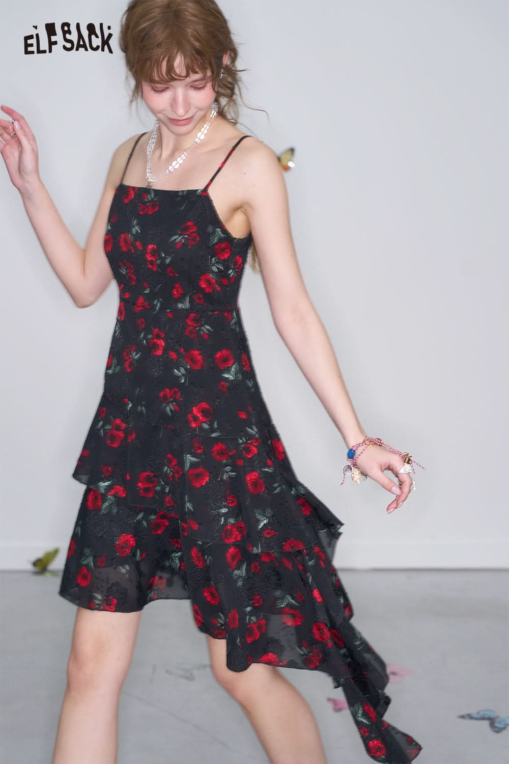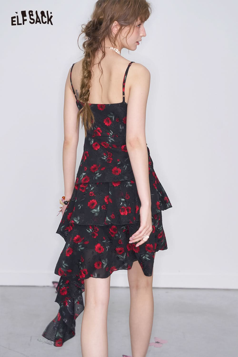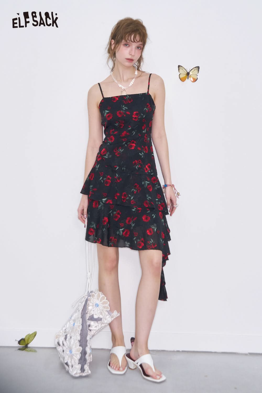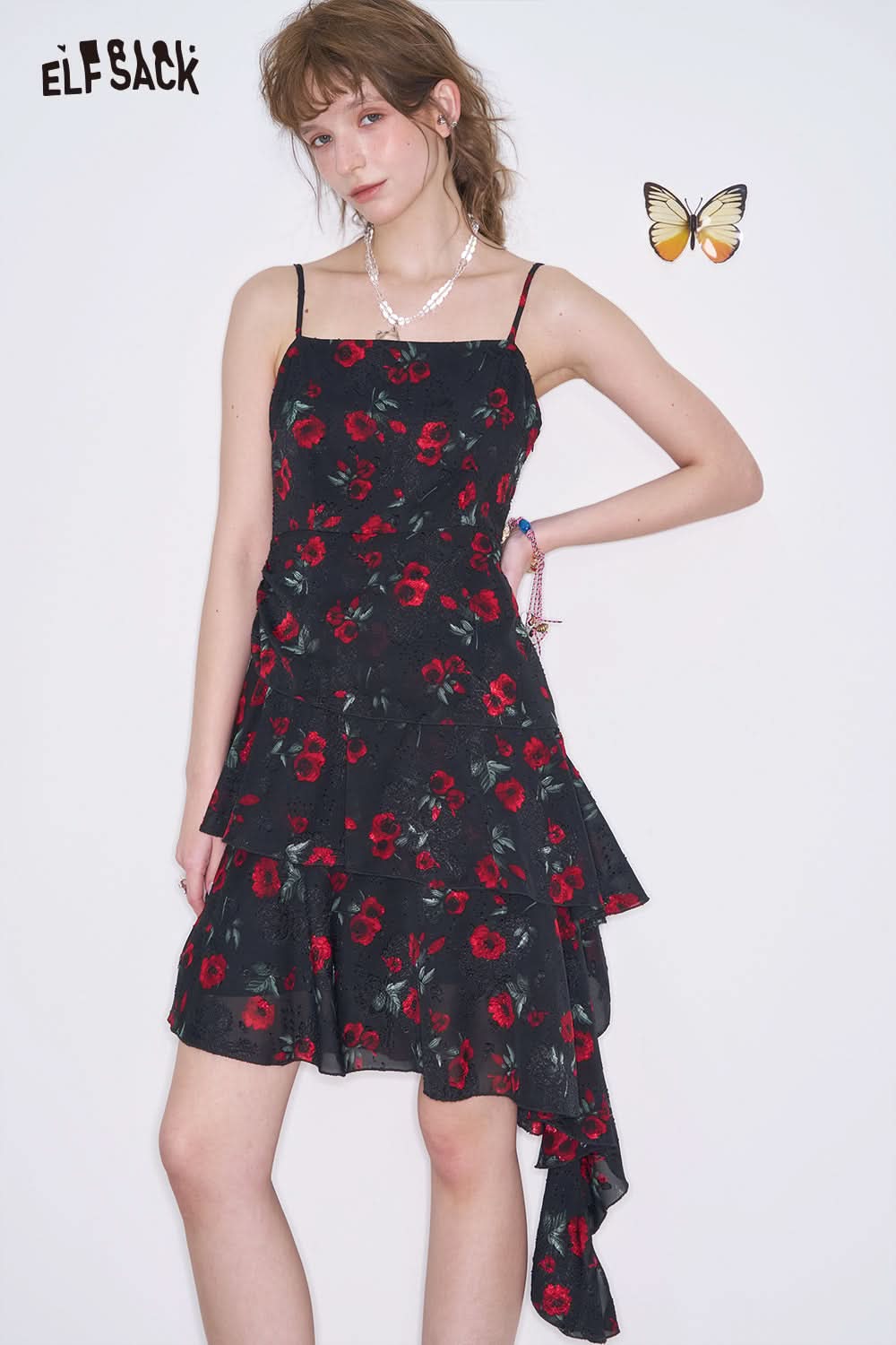 Sweet Cool Black Floral Strap Dresses Women's Asymmetrical Pleated Ruffles Short Dress