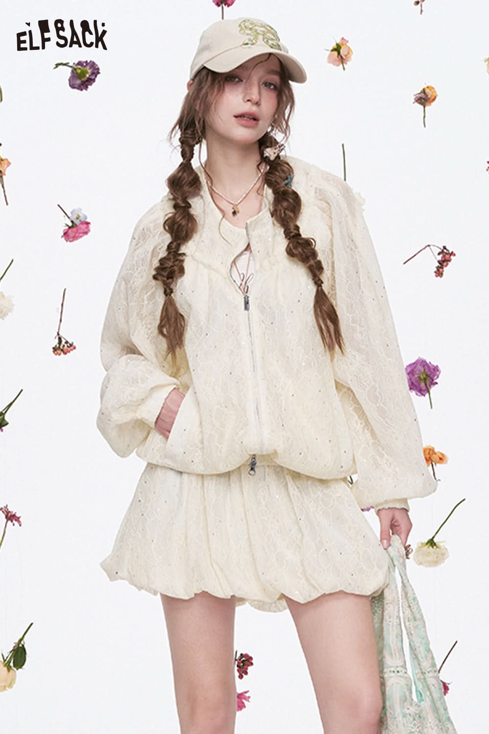 ELFSACK Sweet Off-White Lace Sequin Light Jacket Mini Skirt Two-piece Set Female
