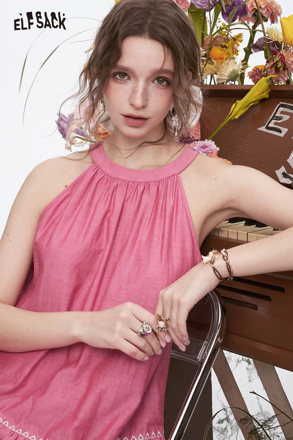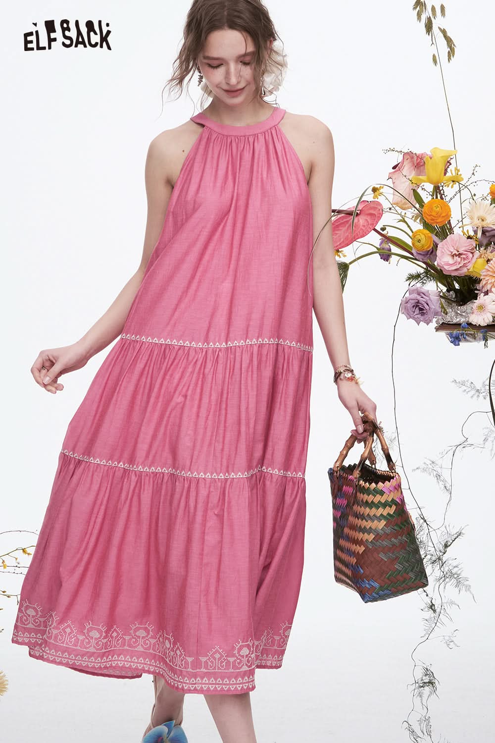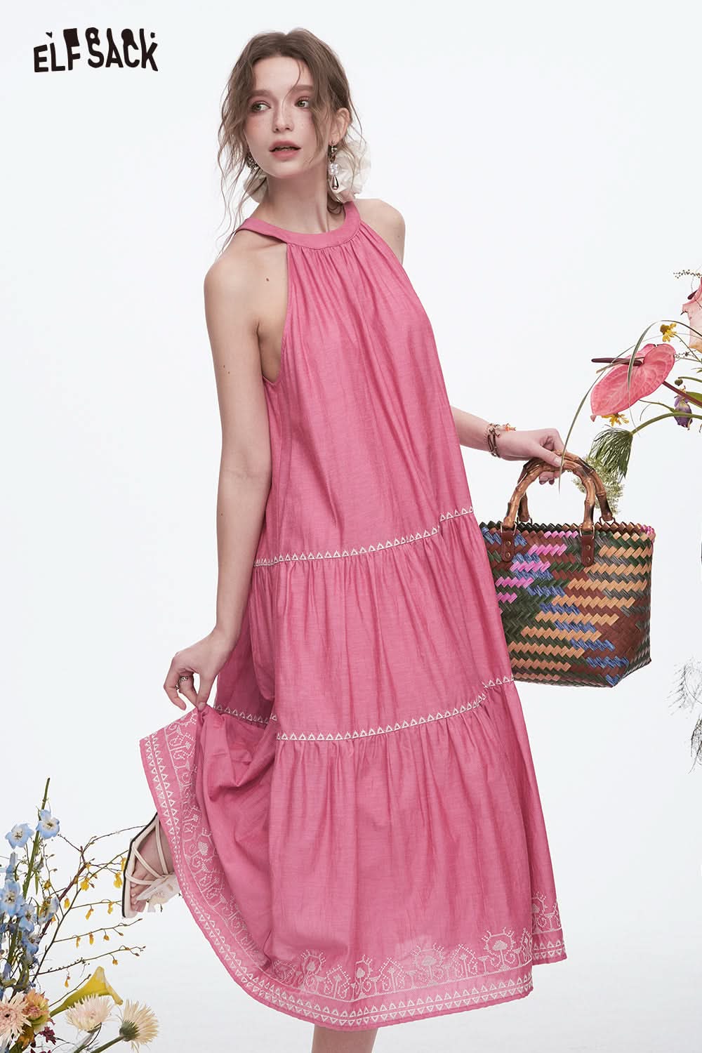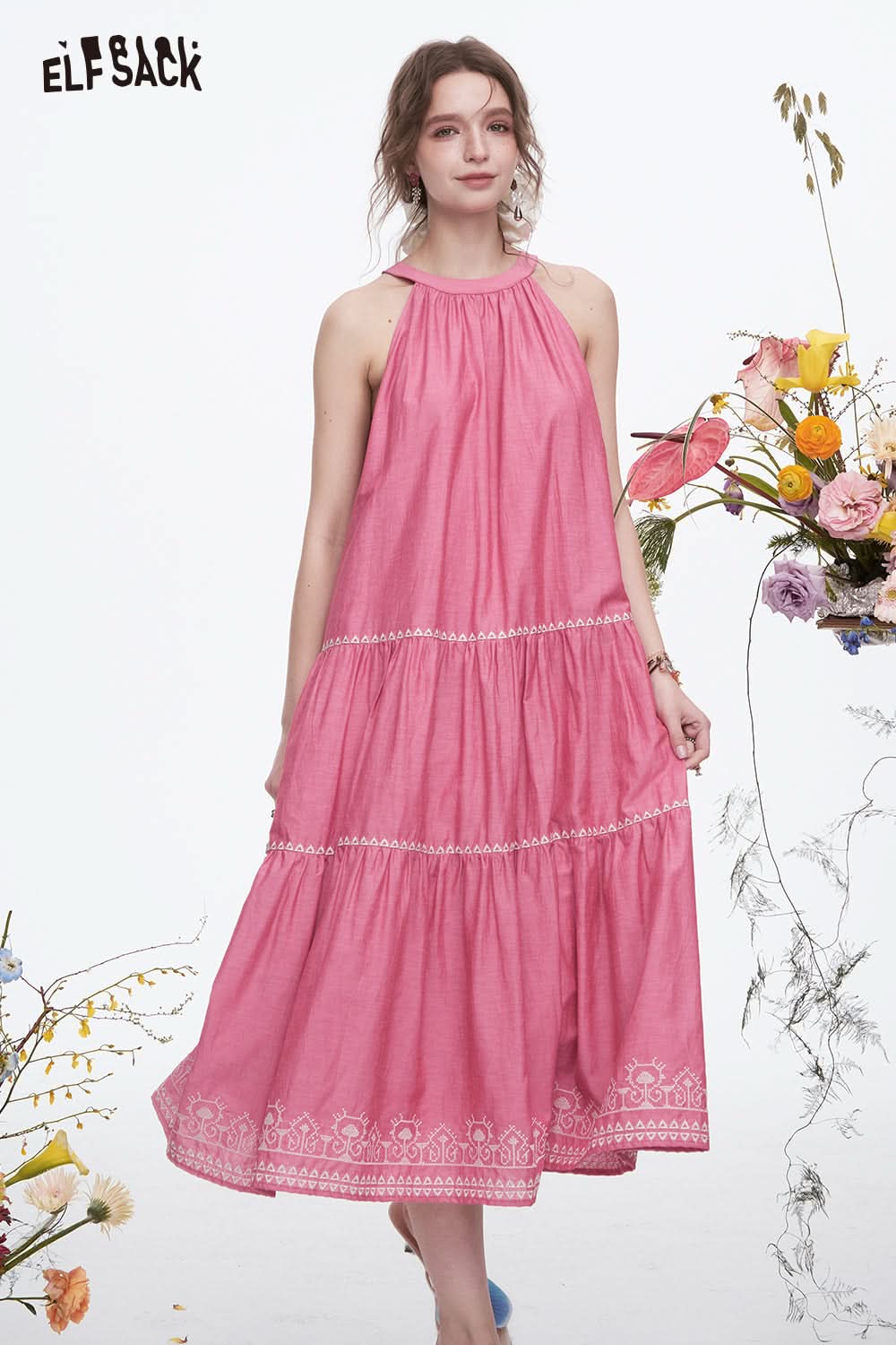 Sweet Pink Halter Neck Sleeveless Dress Women Y2K Embroidery Loose A-line Long Dress