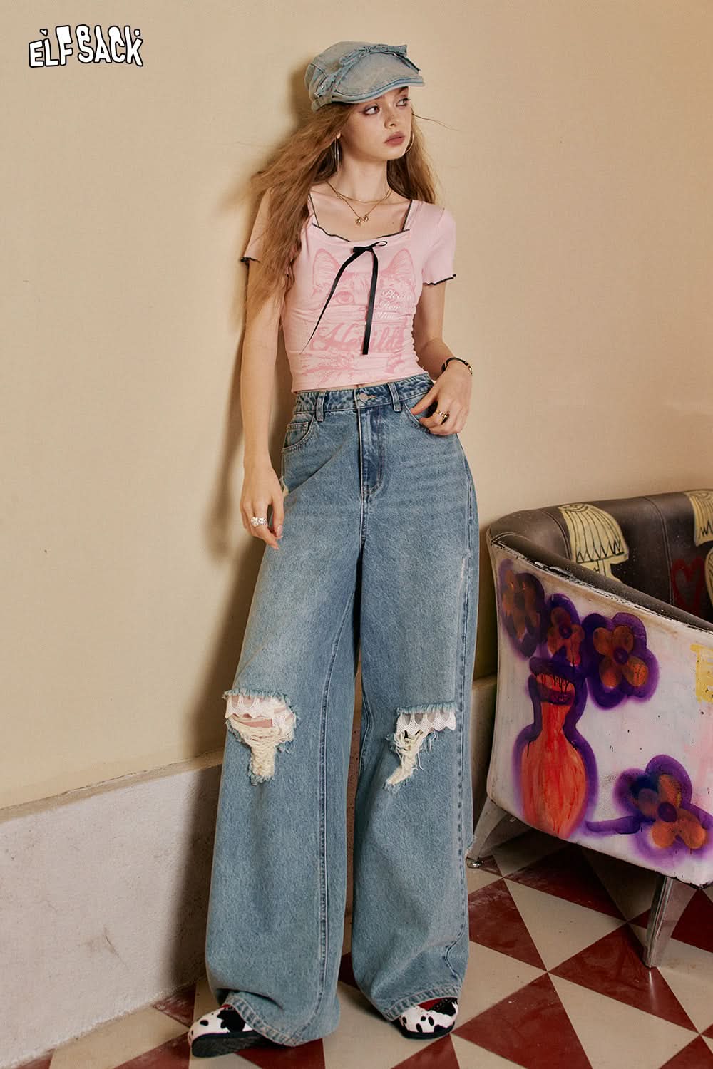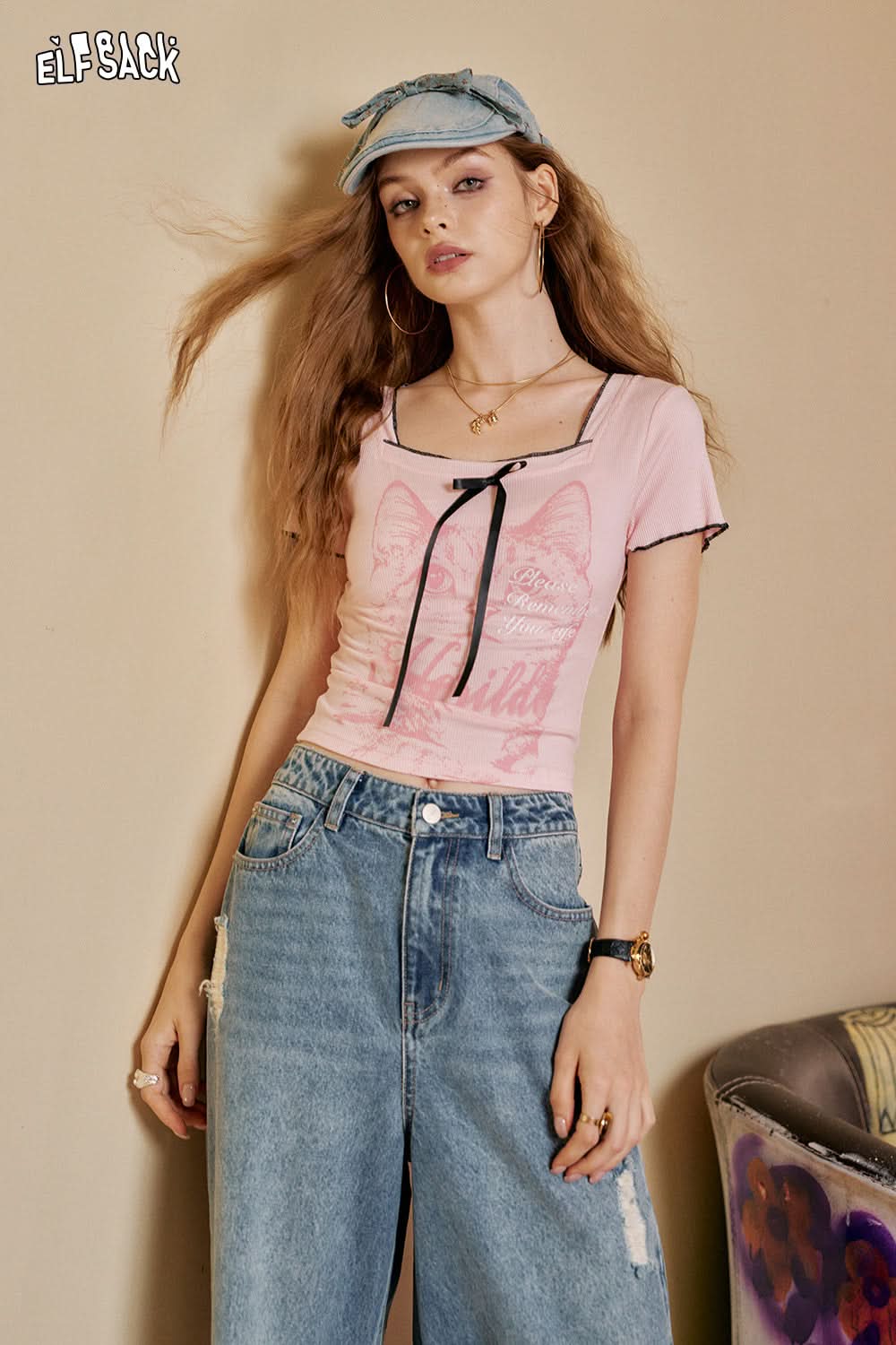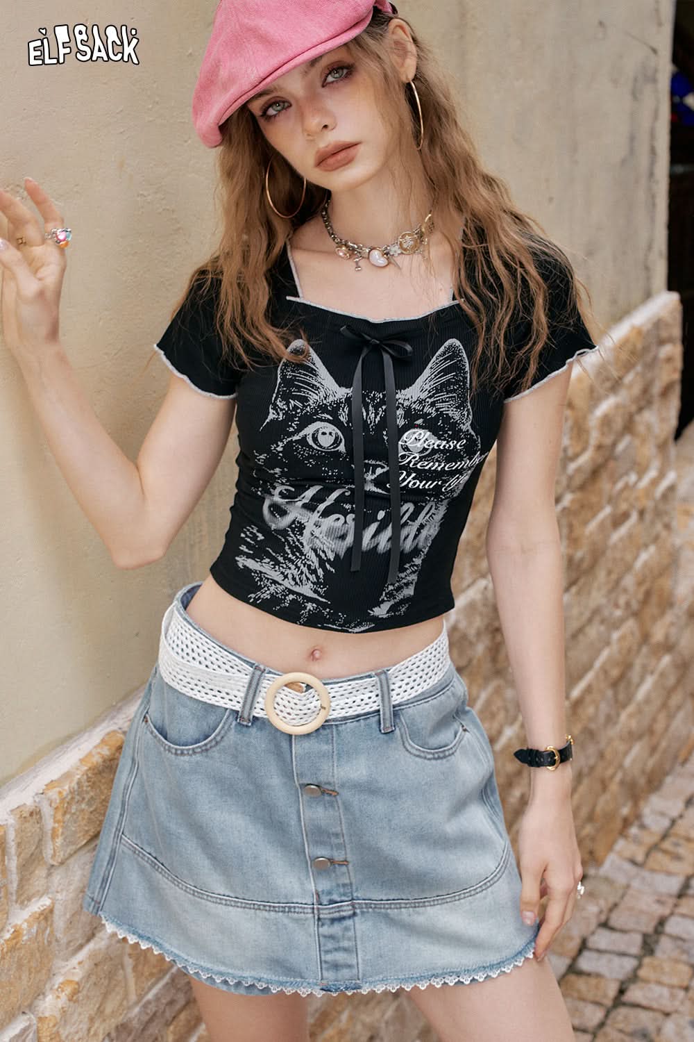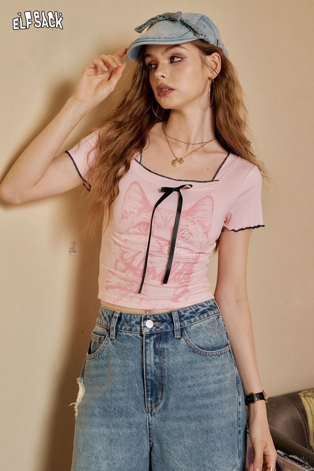 Square Neck Cat Print Chic Short Sleeve T-Shirt