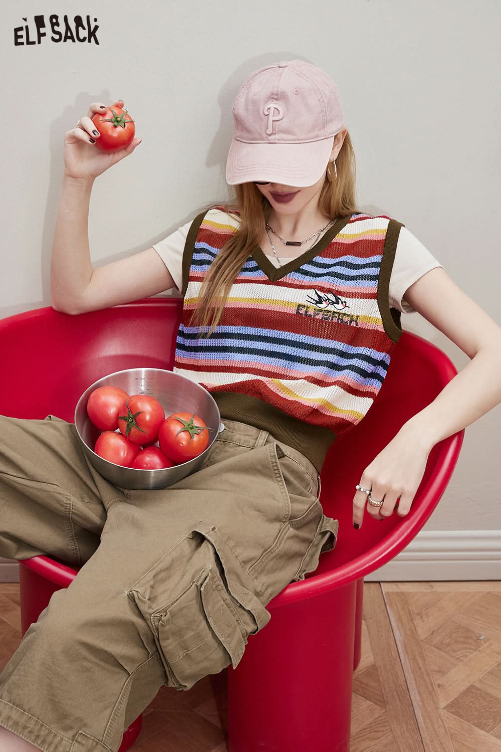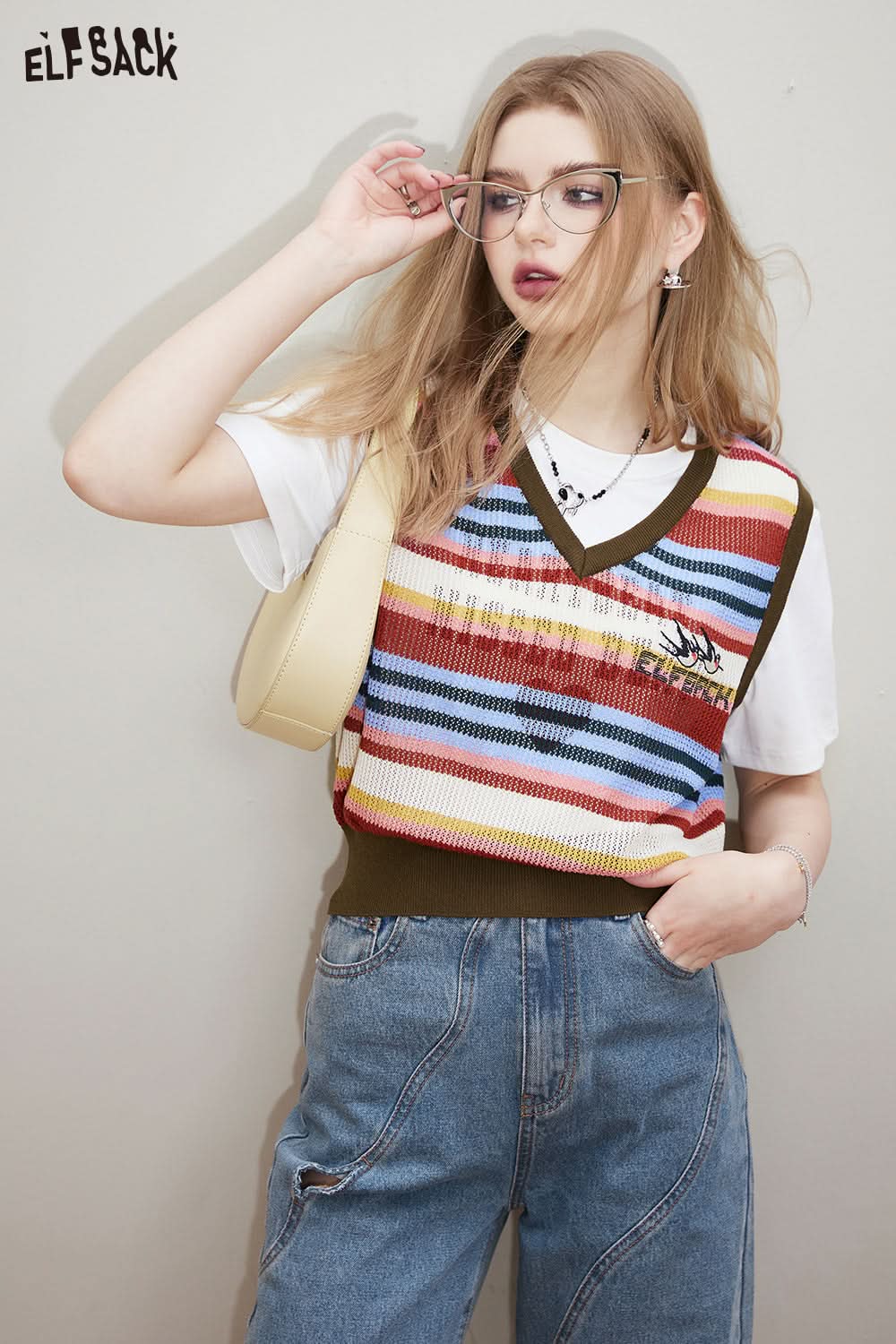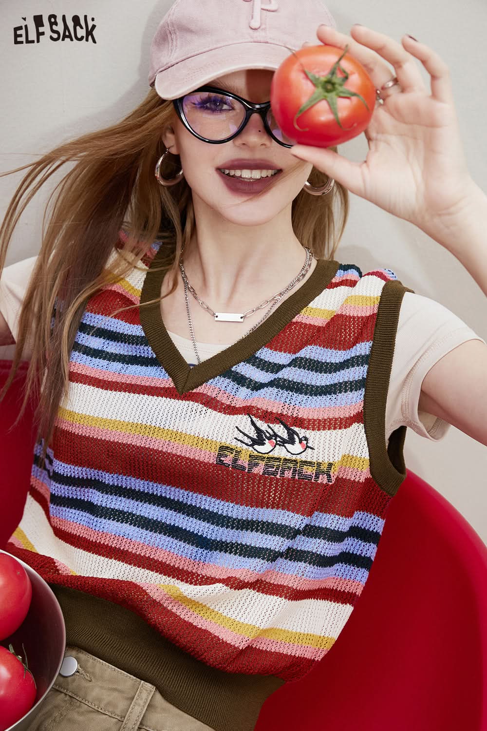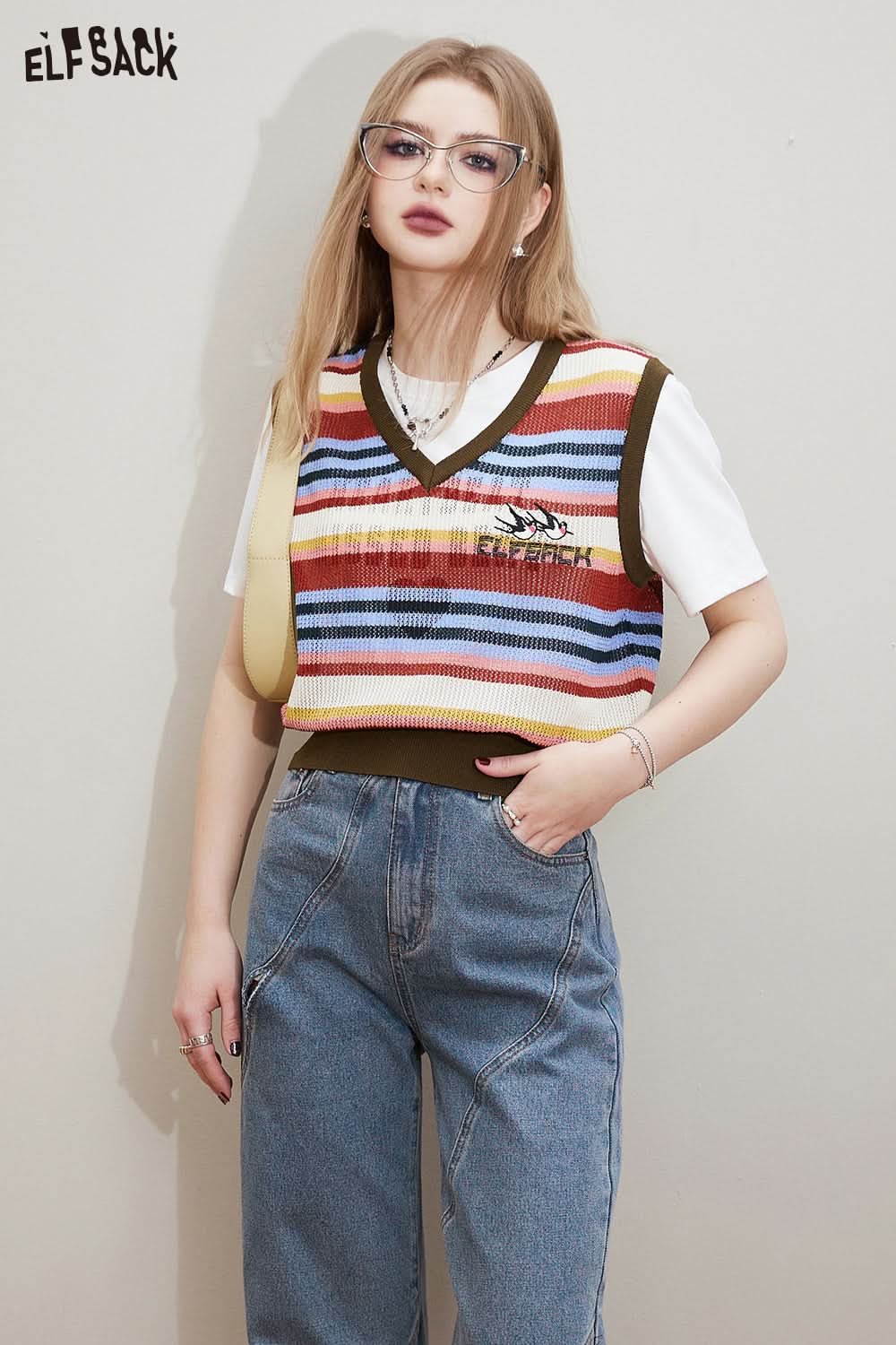 ELFSACK Striped V-neck knitted vest's spring small loose layered top