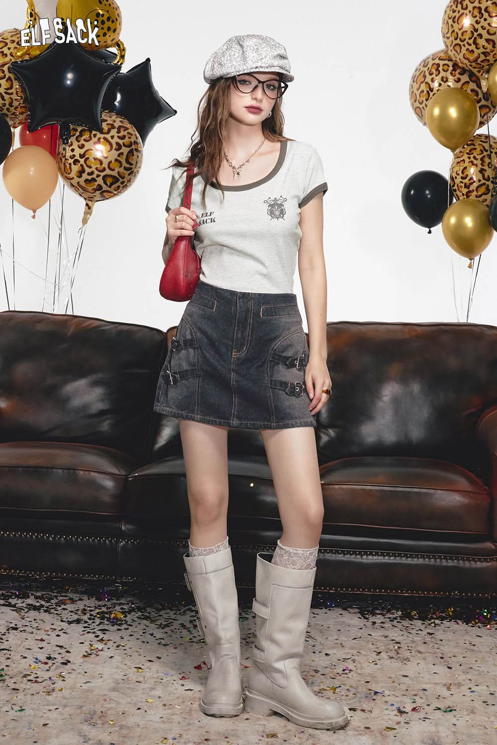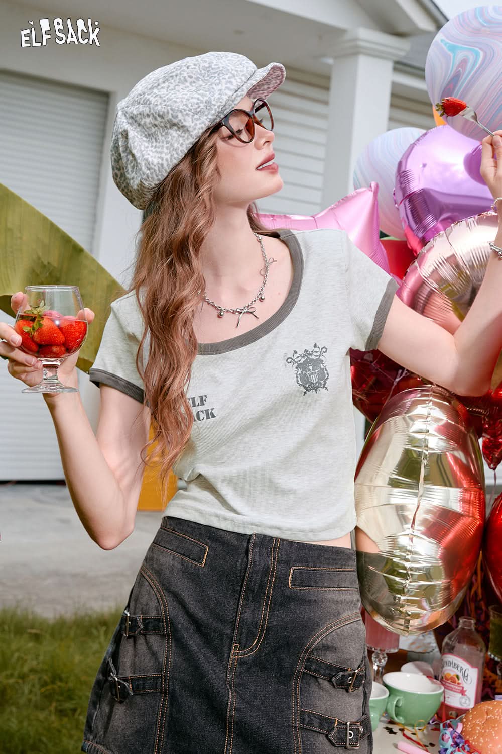 ELFSACK Square neck slim fit contrasting short sleeved t-shirt, sweet and spicy top