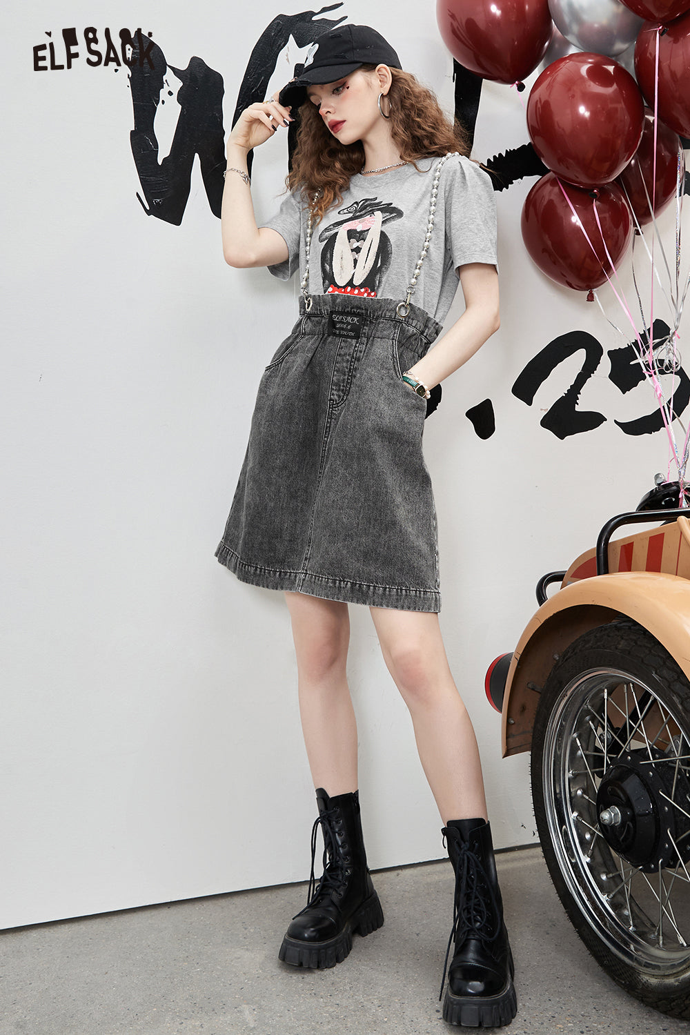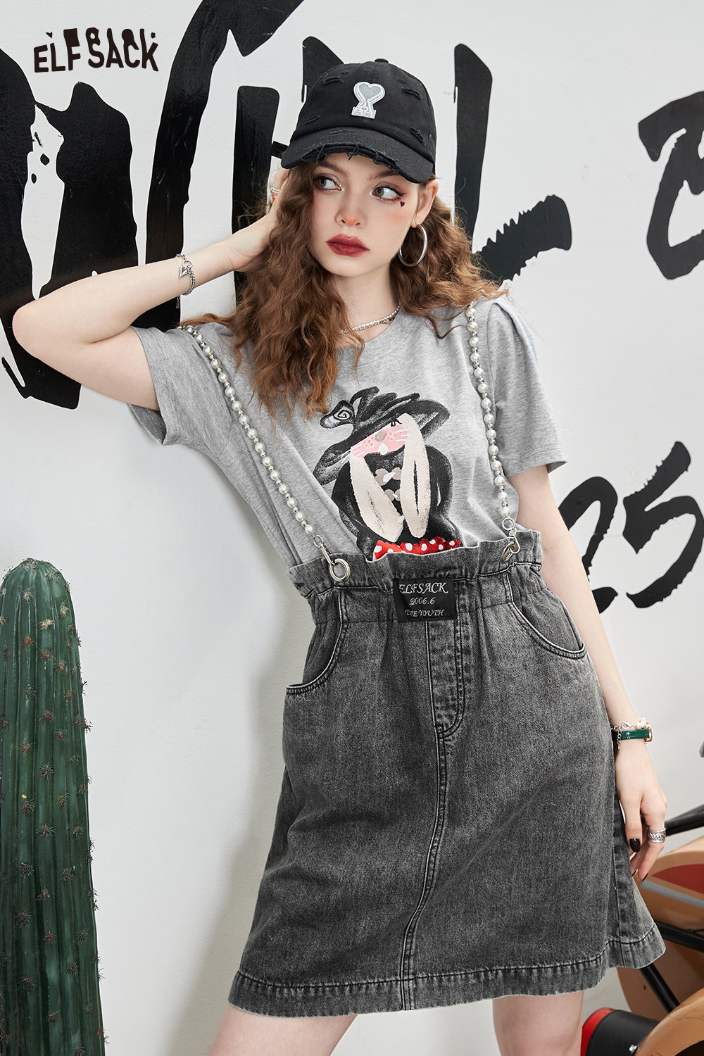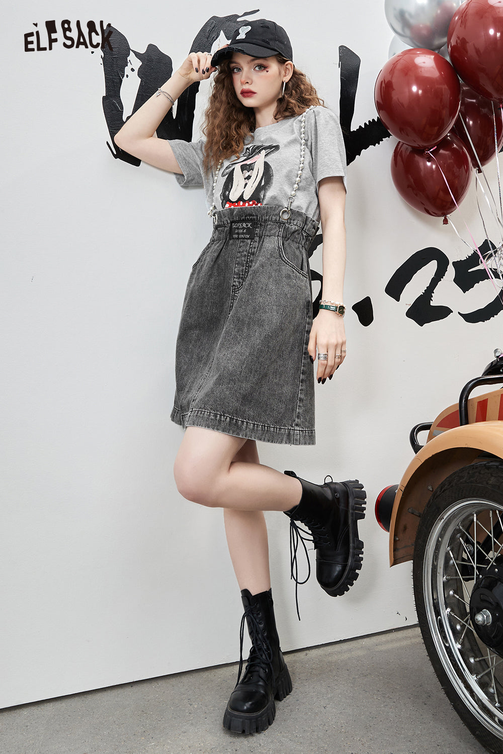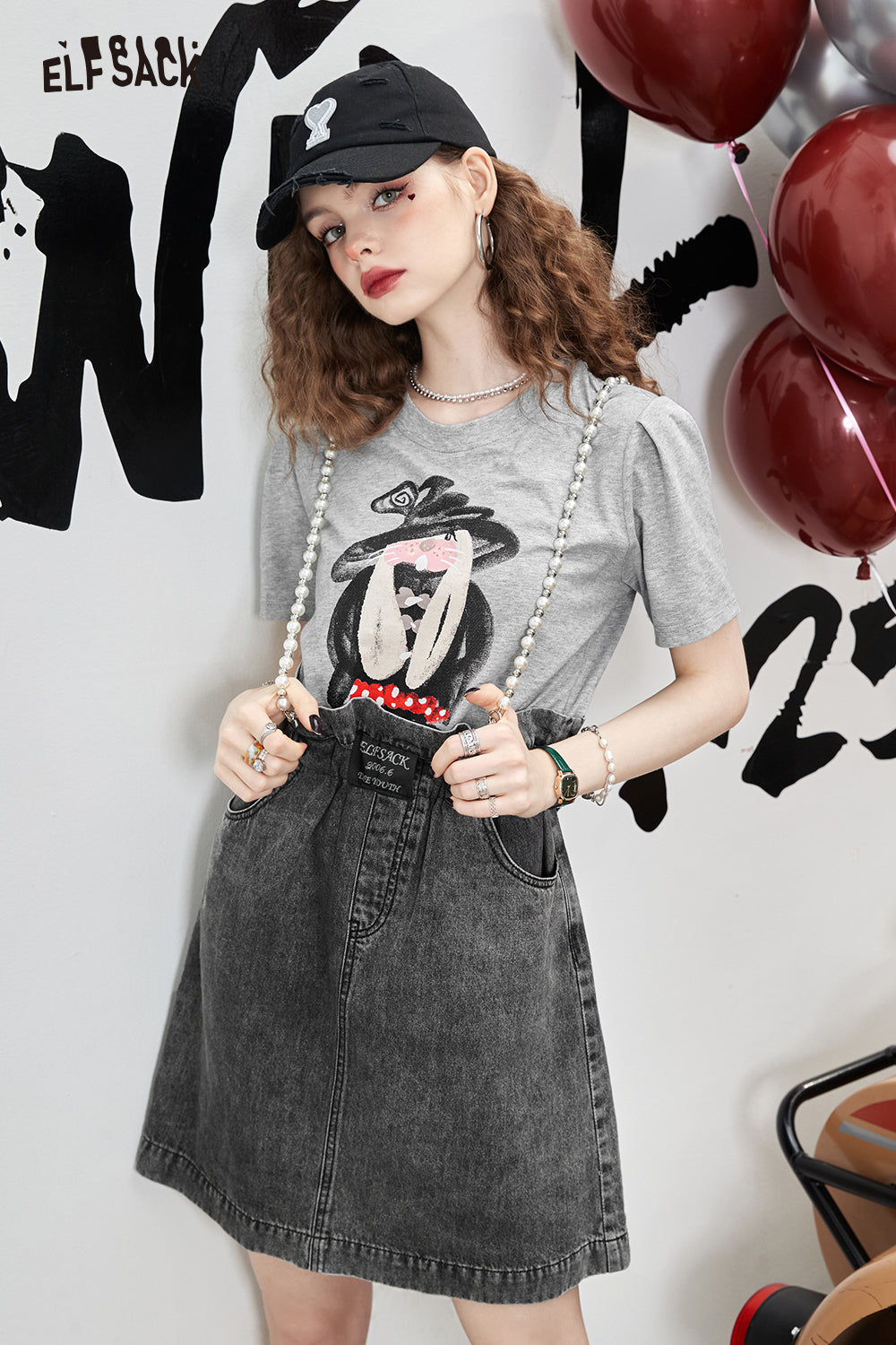 Y2K Sweet Fake Two Piece Short Sleeve Pearl Strap Denim Short Dress