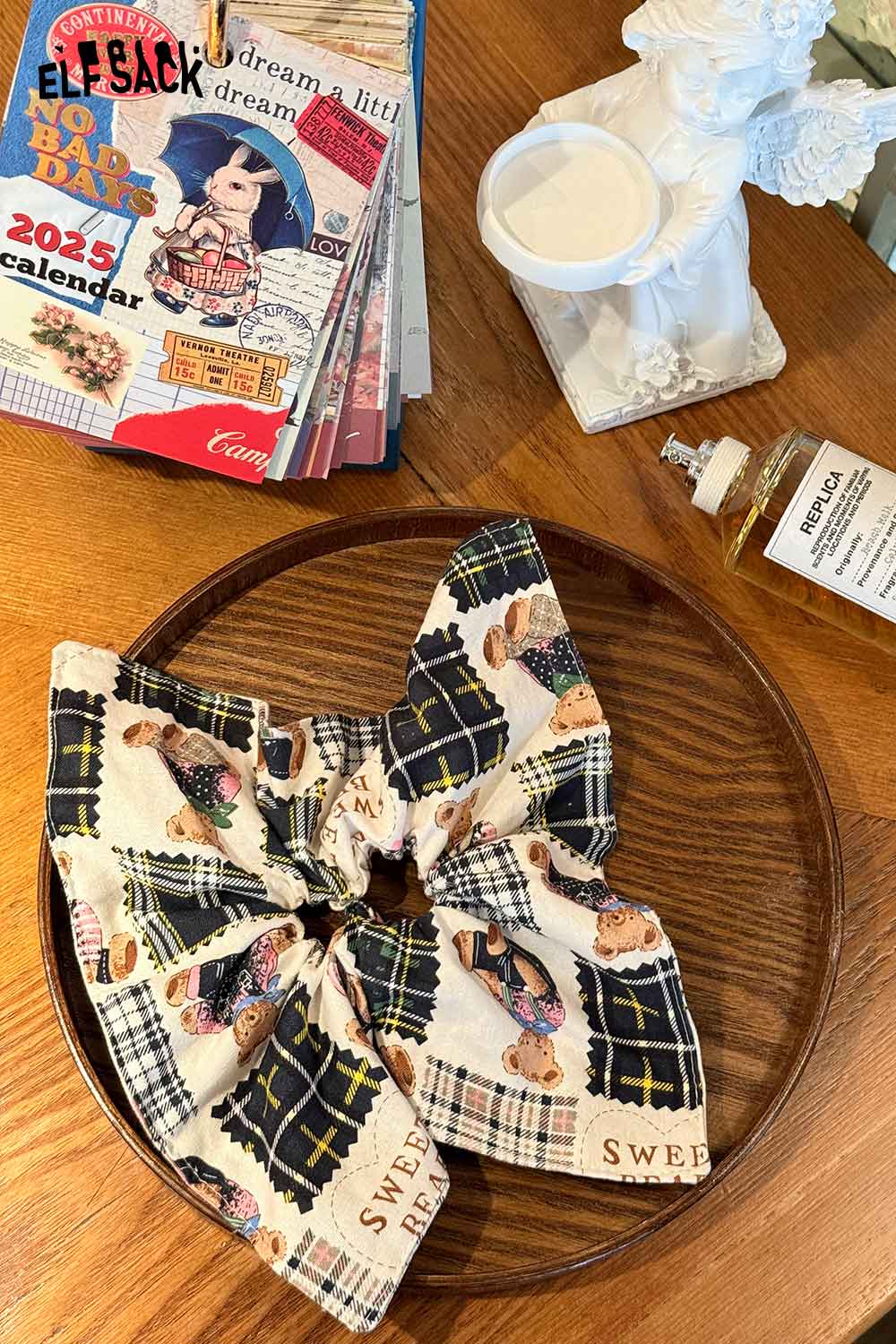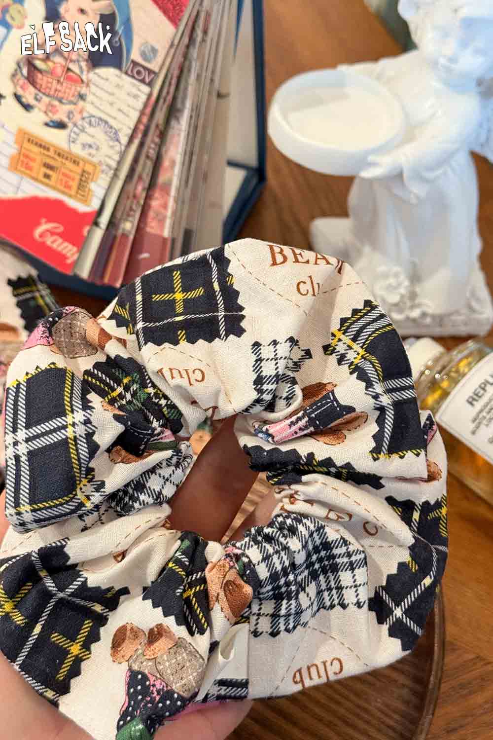 Vintage Plaid Panel Bear Color Block Scrunchie Niche Hair Accessory